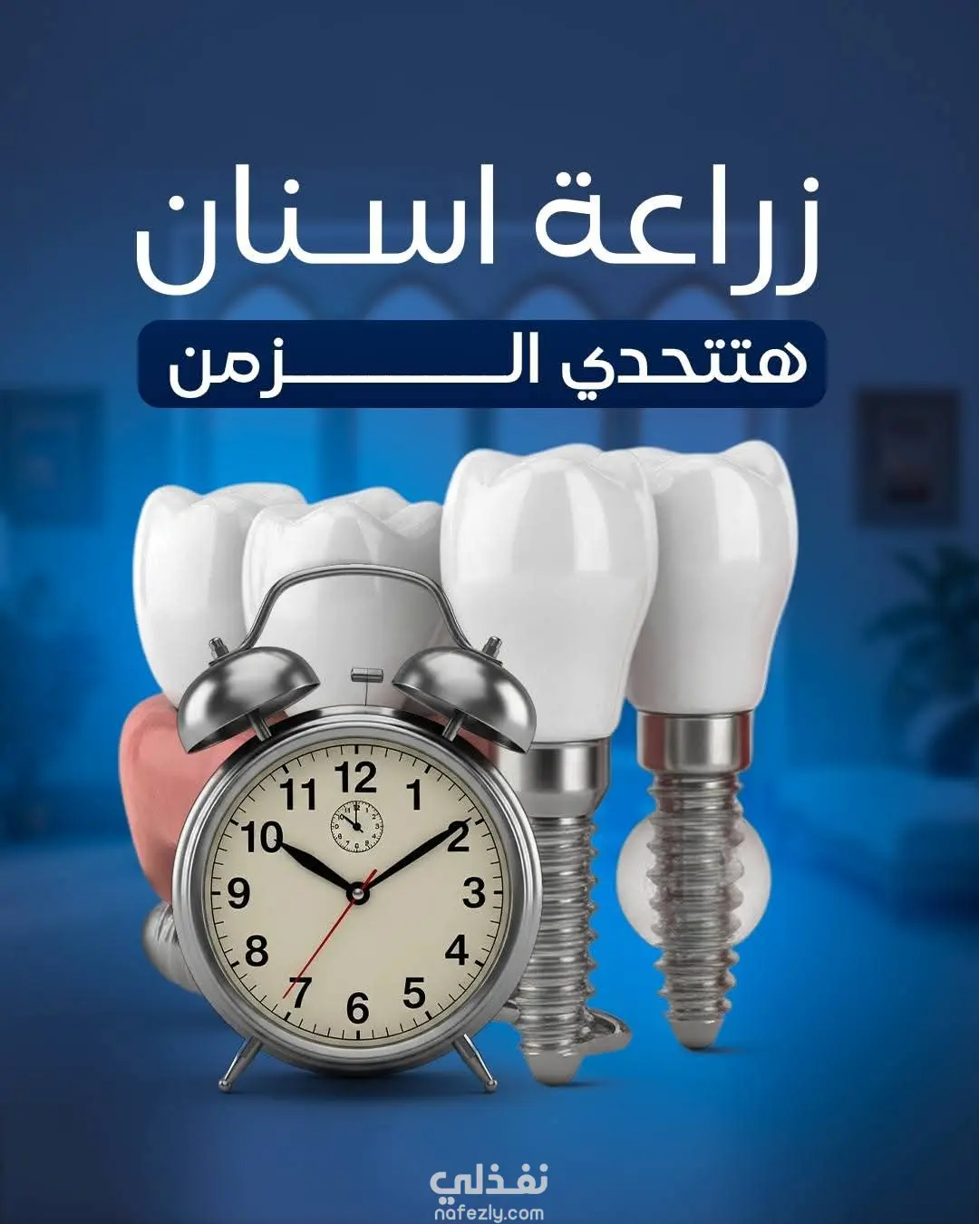 في تصميم "زراعة الأسنان"، استخدمت دمجاً بصرياً (Photo Manipulation) بين الأسنان والمنبه للإشارة رمزياً إلى "تحدي الزمن" واستدامة الزراعة.