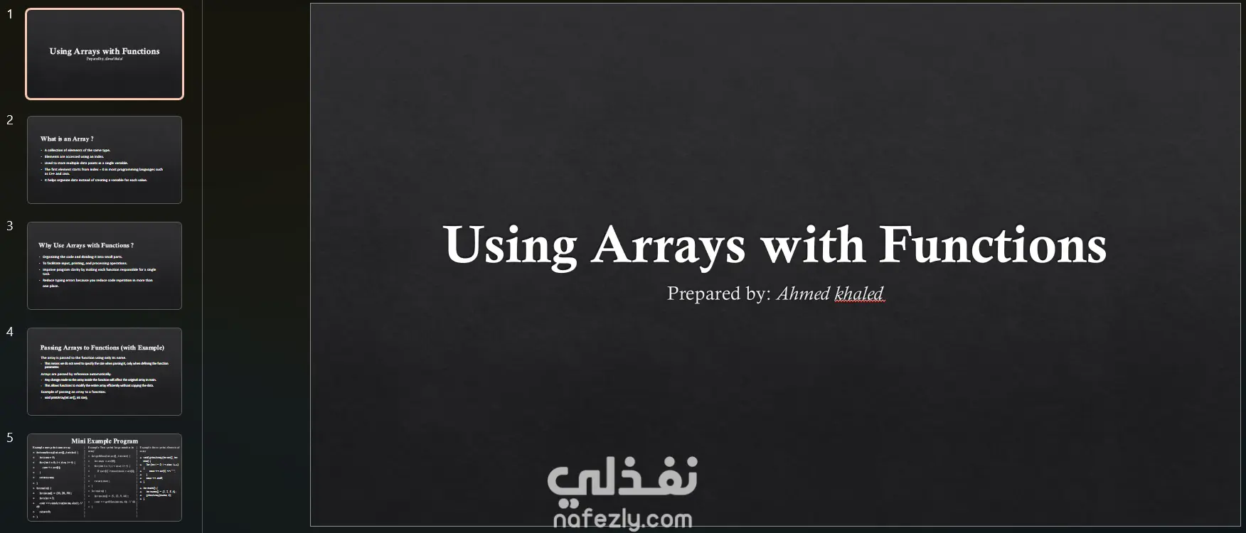 هذا المشروع يهدف إلى إنشاء عرض تقديمي (PowerPoint) تعليمي عن المصفوفات والدوال في لغة C++. يشمل العرض التقديمي المواضيع التالية: تعريف المصفوفة (Array): شرح ما هي المصفوفة في C++ وهيكلها الأساسي. لماذا نستخدم المصفوفات مع الدوال: توضيح فوائد استخدام المصفوفات مع الدوال، مثل إعادة استخدام الكود، زيادة الكفاءة، وتنظيم البرنامج. تمرير المصفوفات إلى الدوال: شرح خطوة بخطوة كيفية تمرير المصفوفات إلى الدوال في C++ (بالقيمة، بالمرجع، واستخدام المؤشرات). أمثلة توضيحية: تقديم أمثلة عملية واضحة توضح كيفية عمل المصفوفات مع الدوال في برامج C++ حقيقية. سيكون العرض منظم، سهل الفهم، وجذاب بصريًا، مناسب للطلاب أو المبتدئين في تعلم لغة C++.