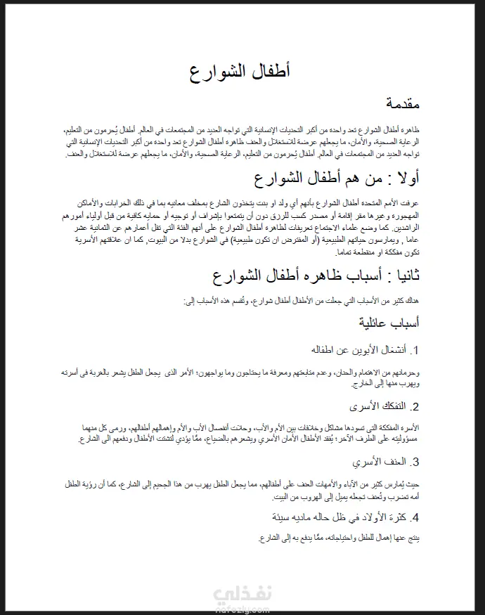 تم إعداد هذا البحث لتوضيح قضية أطفال الشوارع، ويشمل البحث النقاط التالية: تعريف أطفال الشوارع: تحديد من هم أطفال الشوارع وما يميزهم عن الأطفال الآخرين. الأسباب الظاهرة: توضيح الأسباب الرئيسية التي تؤدي إلى وجود أطفال الشوارع، مثل الفقر، الهجرة، التفكك الأسري، ونقص الدعم الاجتماعي. الآثار الظاهرة: دراسة تأثير حياة الشارع على الأطفال والمجتمع، بما في ذلك التأثيرات النفسية، الاجتماعية، والتعليمية. سبل المواجهة والحلول المقترحة: تقديم حلول عملية للتقليل من ظاهرة أطفال الشوارع، مثل برامج الرعاية، التعليم، والتأهيل النفسي والاجتماعي. دور الدولة: توضيح الدور الذي تلعبه الحكومة والمؤسسات الرسمية في حماية الأطفال، وتوفير الدعم الاجتماعي والقانوني لهم.