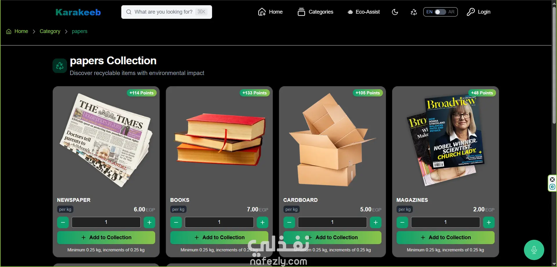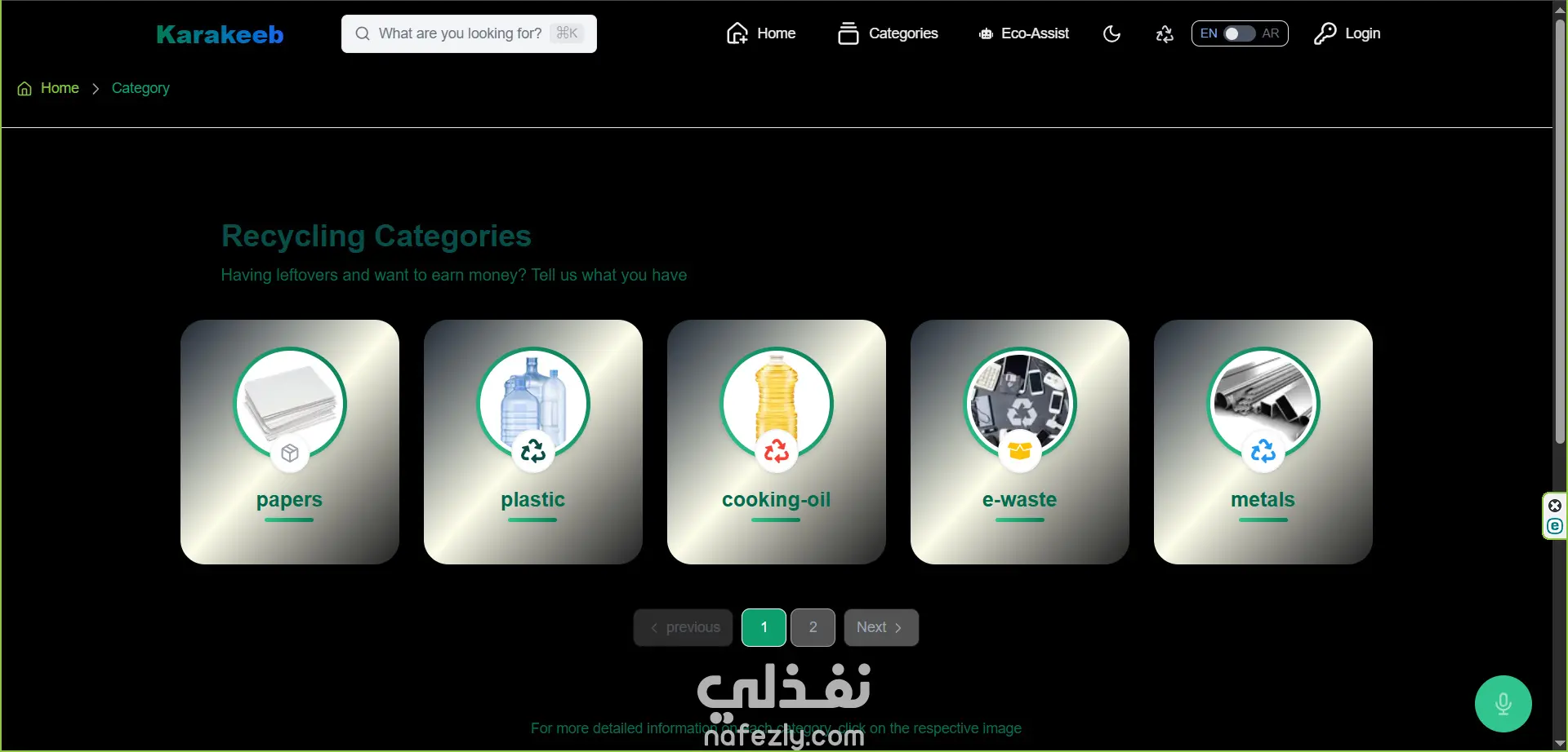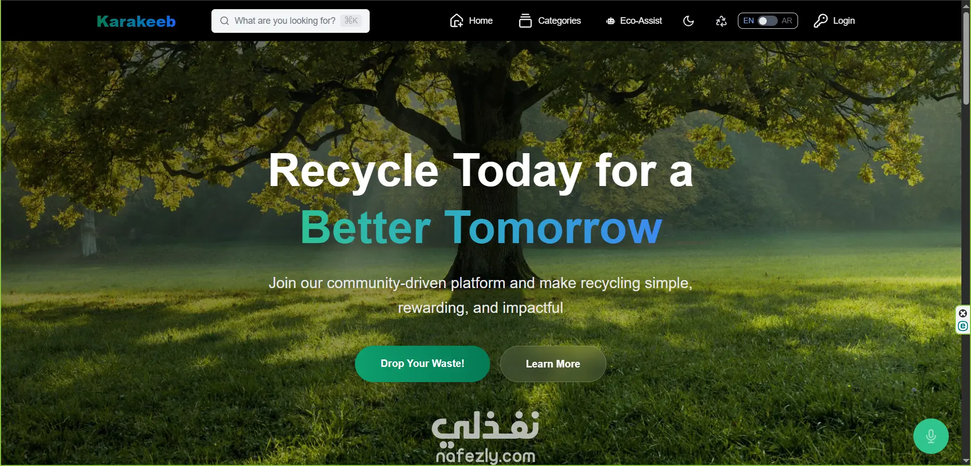 Karakeeb Web هو نظام ويب متكامل لإدارة عمليات إعادة التدوير، يربط بين العملاء، المشترين، شركات إعادة التدوير، وشركاء التوصيل داخل منصة واحدة. يوفّر النظام تجربة سلسة تسمح للمستخدمين بـ: عرض المواد القابلة للبيع أو إعادة التدوير. جدولة واستقبال طلبات الاستلام. تتبّع حالة الطلبات خطوة بخطوة. كسب نقاط واستبدالها بمنتجات معاد تدويرها. استعراض منتجات معاد تصنيعها وشرائها. يتضمن النظام لوحة تحكم إدارية متكاملة، نظام صلاحيات متقدم، تنبيهات لحظية، ودعم ثنائي اللغة (عربي/إنجليزي)، بالإضافة إلى نظام إدارة عمليات التوصيل.