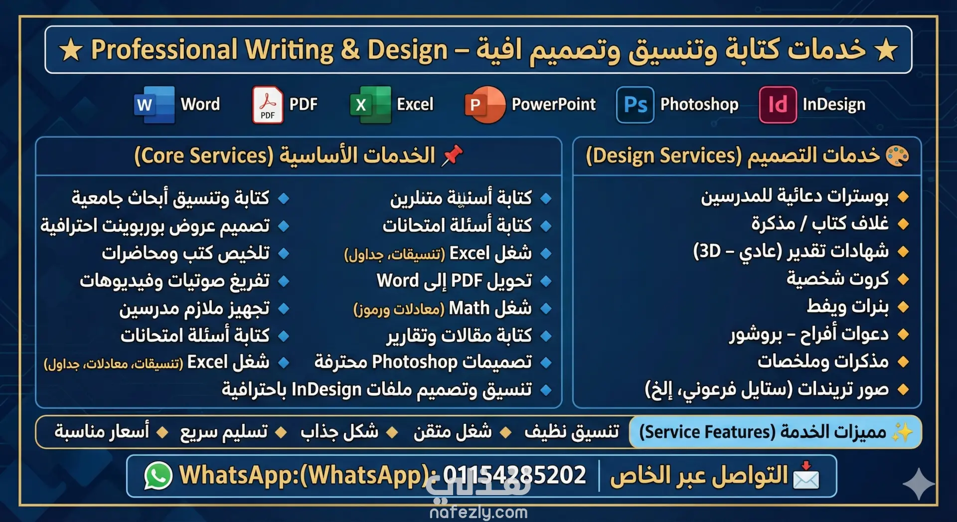 "خدمات كتابة وتنسيق وتصميم احترافية – عربي & English" **2- الأدوات المستخدمة:** Word، PDF، Excel، PowerPoint، Photoshop، InDesign **3- الخدمات الأساسية:** - سرد مفصل للخدمات مع رموز توضيحية لكل خدمة، تشمل: - كتابة وتنسيق أبحاث جامعية. - تصميم عروض بوربوينت احترافية. - تلخيص كتب ومحاضرات. - تفريغ صوتيات وفيديوهات. - تجهيز ملازم مدرسين. - كتابة أسئلة امتحانات. - شغل Excel (تنسيقات، معادلات، جداول). - تحويل PDF إلى Word. - شغل Math (معادلات ورموز). - كتابة مقالات وتقارير. - تصميمات Photoshop محترفة. - تنسيق وتصميم ملفات InDesign باحترافية. **4- خدمات التصميم:** - إبراز خدمات التصميم بصريًا مع استخدام نماذج مصغرة أو عينة للمنتجات مثل: - بوسترات دعائية للمدرسين. - غلاف كتاب/مذكرة. - شهادات تقدير (عادي و3D). - كروت شخصية. - بنرات ويفط.
