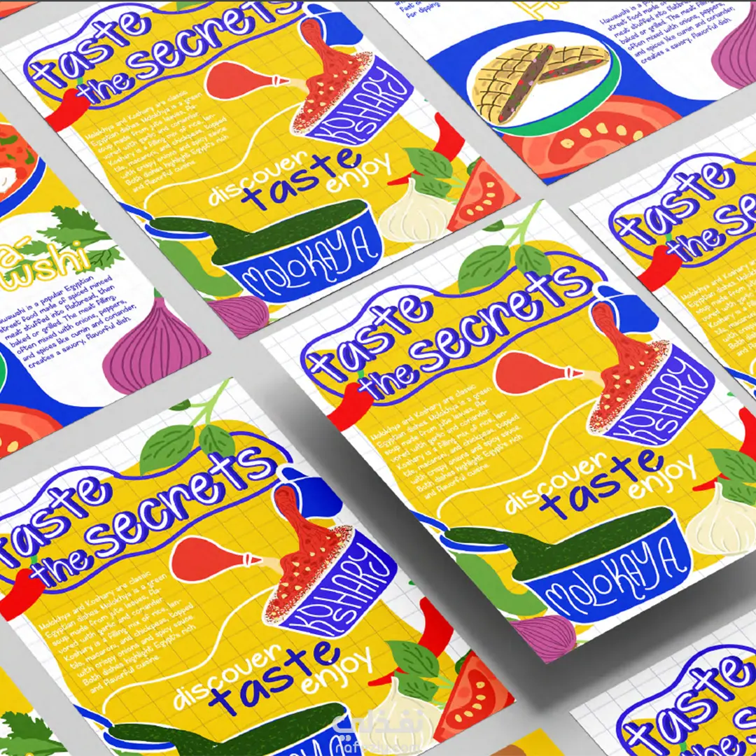 About the project This playful and vibrant design direction captures the essence of Egyptian cuisine in a modern and approachable way. It features bold, hand-drawn typography and lively illustrations that reflect the joy and creativity of Egyptian food culture. The bright color palette and dynamic layouts evoke a sense of energy and excitement, inviting viewers to “taste the secrets” of traditional dishes. By blending cultural authenticity with a fresh, contemporary style, this direction celebrates Egypt’s rich culinary heritage in a way that feels youthful, engaging, and visually captivating—making it especially suitable for interactive and social media campaigns.