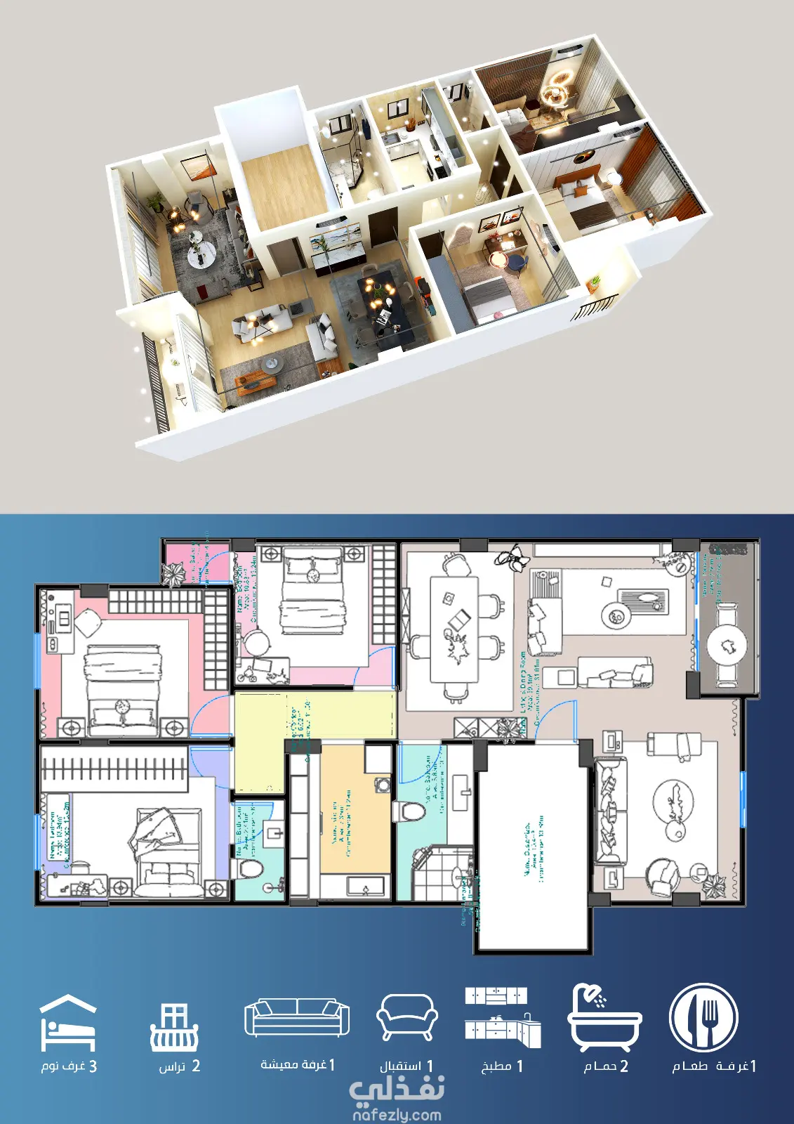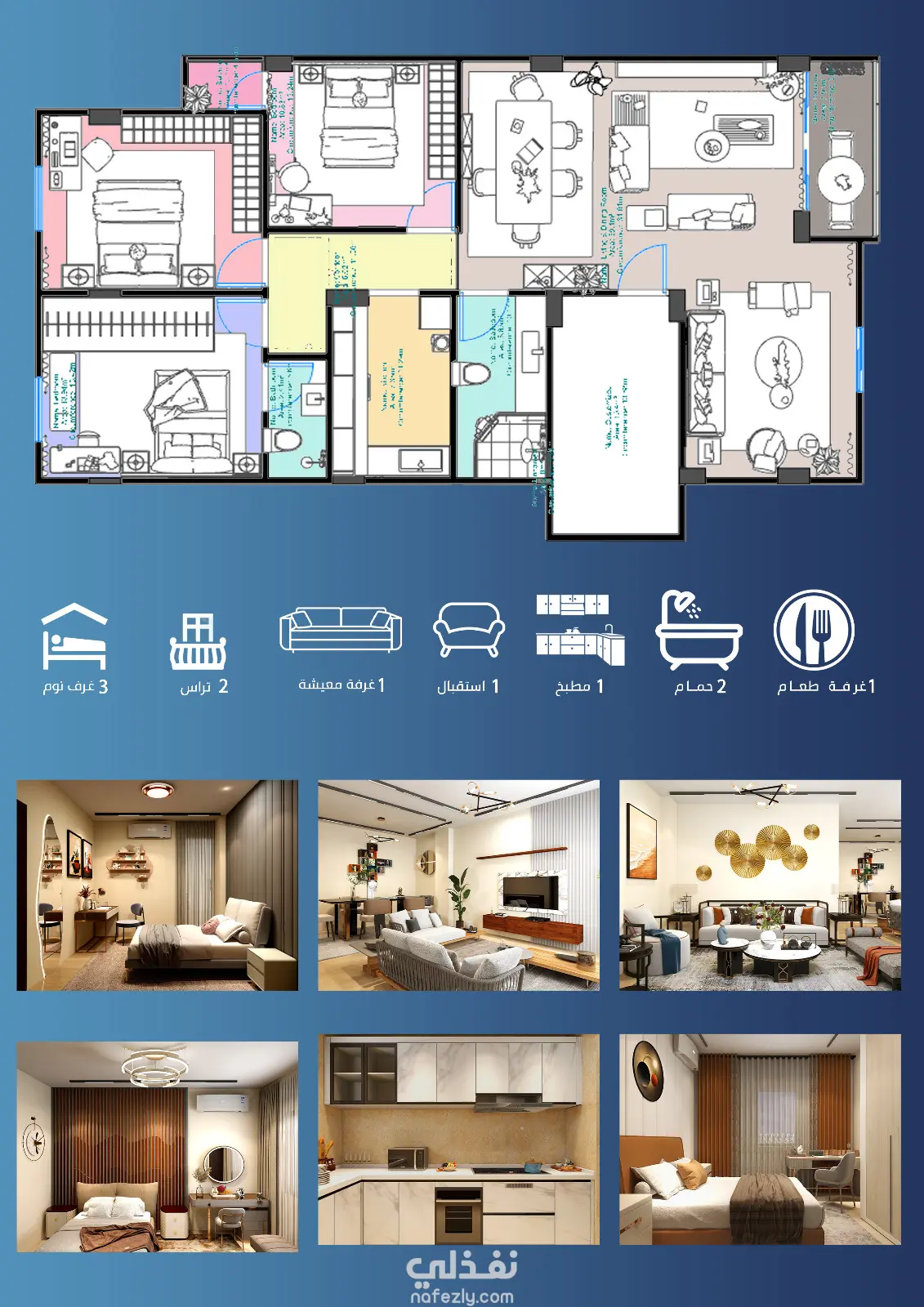 تصميم برزنتيشن لتصميم شقة 2d و صور 3d