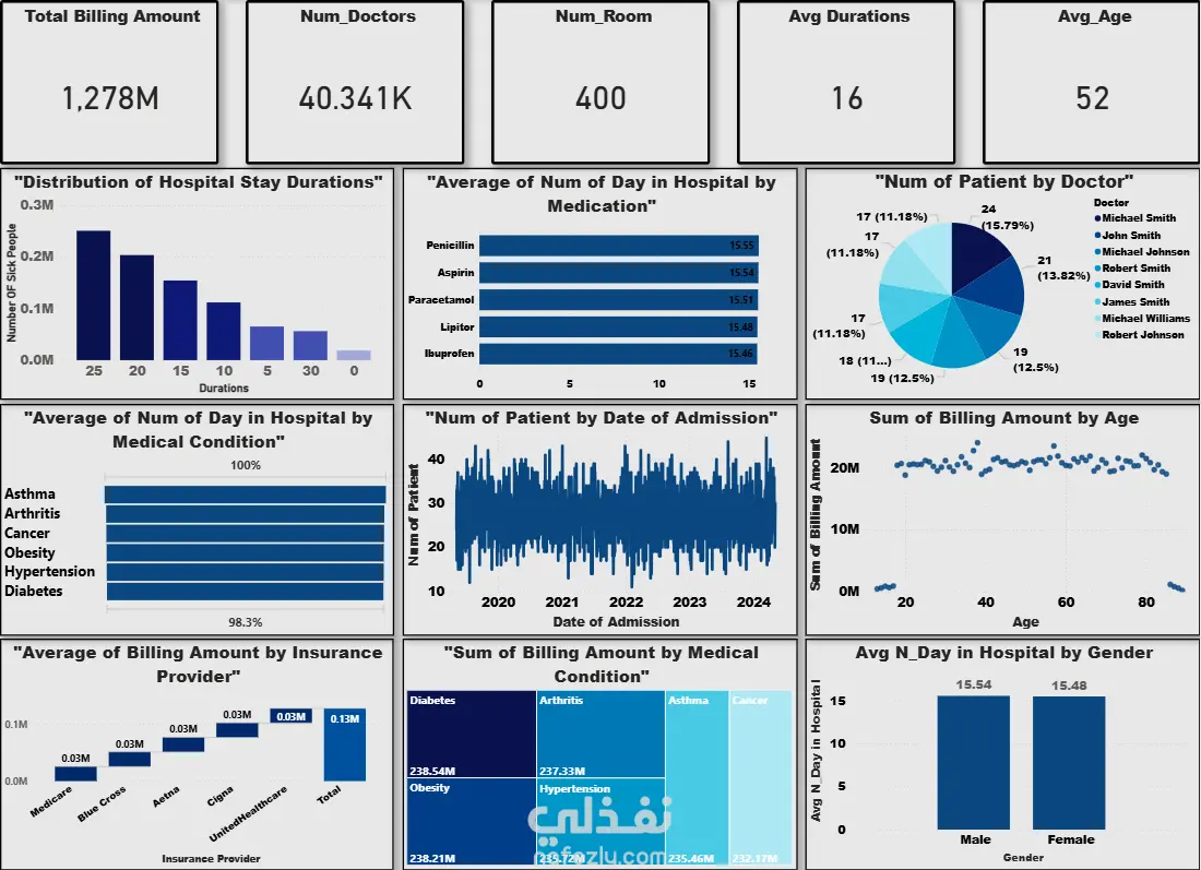 تهدف هذه اللوحة إلى تحليل الفواتير الطبية، أداء الأطباء، توزيع المرضى، ومؤشرات الأداء الرئيسية في مستشفى أو مركز طبي. البيانات تركز على: