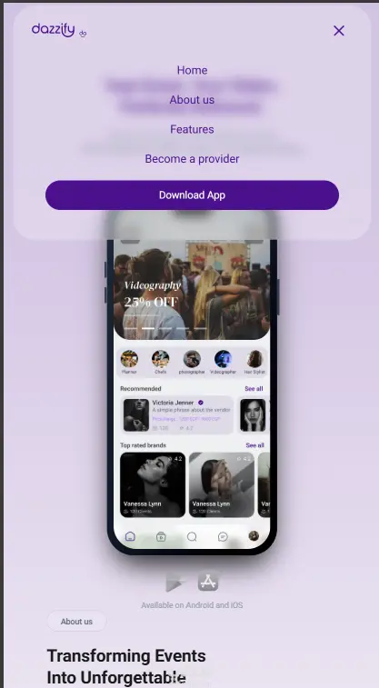 قمت بالعمل على تطوير واجهات موقع DazzifyApp.com، وهو منصة متكاملة لتنظيم وحجز خدمات المناسبات. يتيح الموقع للمستخدمين تخطيط مناسباتهم، استعراض مقدمي الخدمات، الحجز، وإدارة التفاصيل بسهولة.