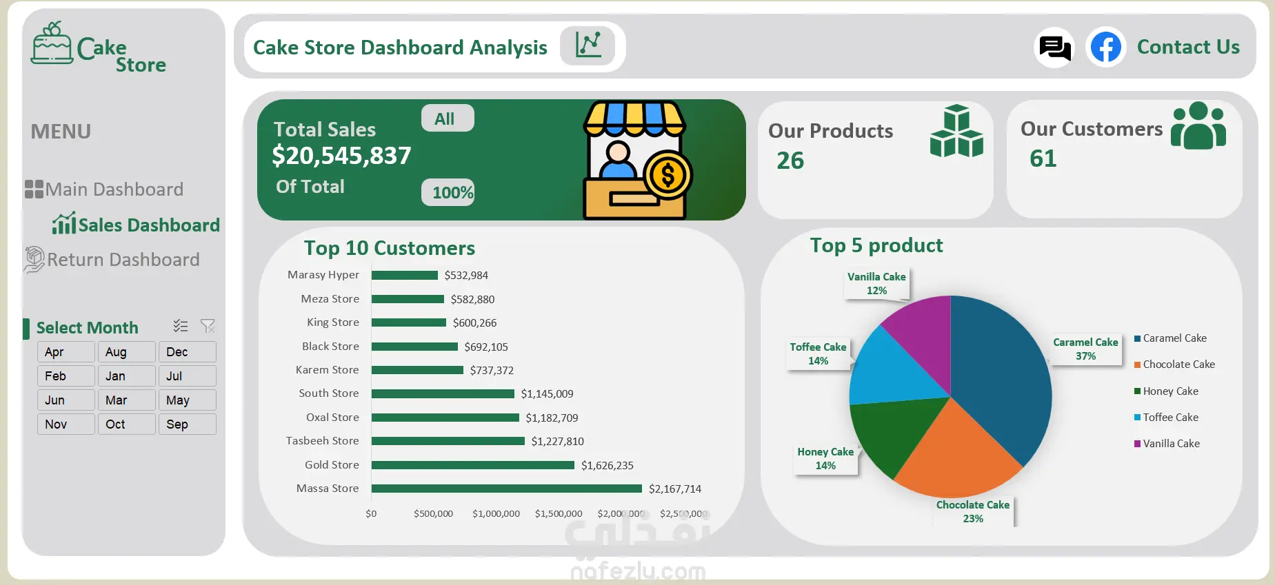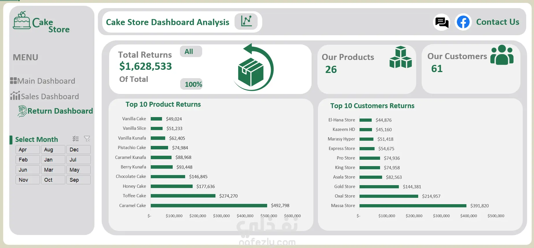 This project focuses on analyzing real sales data from a cake store and building an interactive dashboard that clearly presents key business insights. The goal was to clean, analyze, and visualize the data in a professional and actionable way using Excel, Python, and Power BI. Key Insights: Identified top-selling products Analyzed customer behavior and highlighted top-performing clients Discovered patterns in product returns and the main factors influencing them Studied overall sales trends across different periods Measured the contribution of each product and customer to total business performance Delivered practical insights to support data-driven decision-making Dashboard Features: Fully interactive month-based filtering for all metrics and charts Dynamic visuals for sales trends, product performance, and customer insights Clean and easy-to-read design for quick and effective decision-making