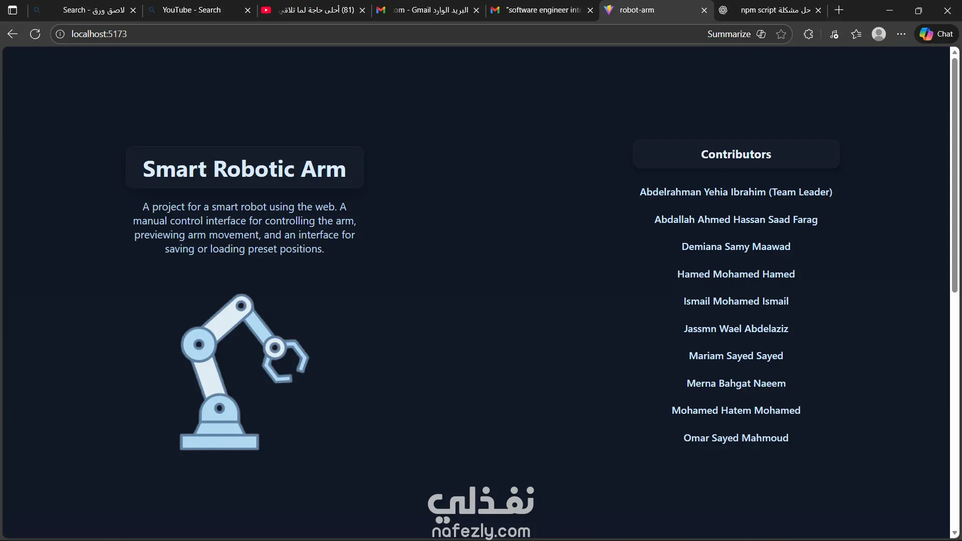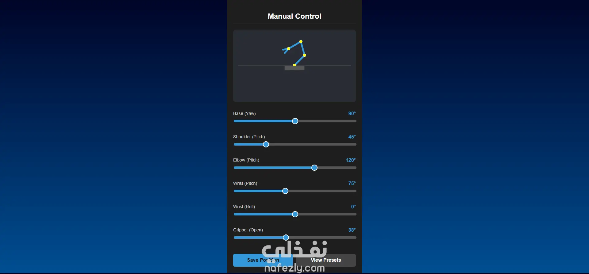 هذا المشروع هو واجهة تحكم ويب متقدمة (Advanced Web Control Interface) صممت باستخدام React.js، بهدف التحكم عن بُعد في ذراع روبوتية حقيقية. الوظائف الأساسية للموقع تشمل: التحكم عن بعد: إمكانية تحريك مفاصل الذراع (Base, Shoulder, Elbow، إلخ) من أي جهاز متصل بالشبكة (كمبيوتر، هاتف، تابلت) دون الحاجة إلى الاتصال المباشر بأسلاك. التغذية البصرية (ArmViewer.jsx): تمثيل رسومي فوري لحركة الذراع قبل إرسال الأوامر للروبوت، مما يقلل الأخطاء ويساعد في برمجة المسارات بدقة. واجهة سهلة الاستخدام: شريط التمرير (Sliders) يسهل التحكم بدلاً من كتابة الأكواد مباشرة في Arduino، مما يجعل التشغيل والبرمجة أسرع وأكثر كفاءة. المشروع يتيح التحكم الكامل في الذراع بطريقة مرنة وآمنة، ويمكن تكييفه مع مشاريع روبوتية أخرى حسب الحاجة.