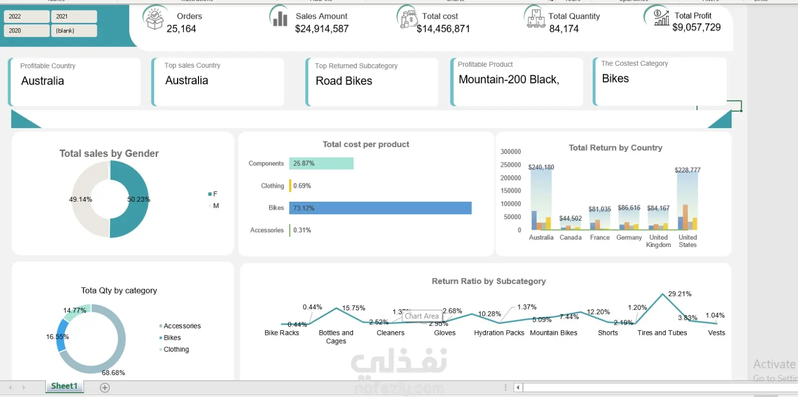 مشروع تحليل المبيعات حيث كان التركيز الرئيسي على تحديد الأسباب الجذرية وراء معدلات الإرجاع المرتفعة في مختلف البلدان وفئات المنتجات. باستخدام Excel (Power Query و Pivot Tables و dashboards)، قمت بإنشاء تقرير كامل يسلط الضوء على الرؤى الرئيسية: أعلى معدلات الإرجاع: الولايات المتحدة أعلى فئة فرعية تم إرجاعها: الدراجات الهوائية البلد الأكثر ربحية: أستراليا الفئة الأكثر تكلفة: الدراجات أنماط واضحة لتوزيع الجنس والفئات نسبة الإرجاع لكل فئة فرعية مع رؤية تفصيلية أظهر المشروع مدى قوة تصور البيانات في الكشف عن المشكلات التي يصعب اكتشافها في الجداول الأولية. يساعد فهم الإرجاع على مستوى تفصيلي في تحسين جودة المنتج وصقل السياسات وحماية الأرباح.