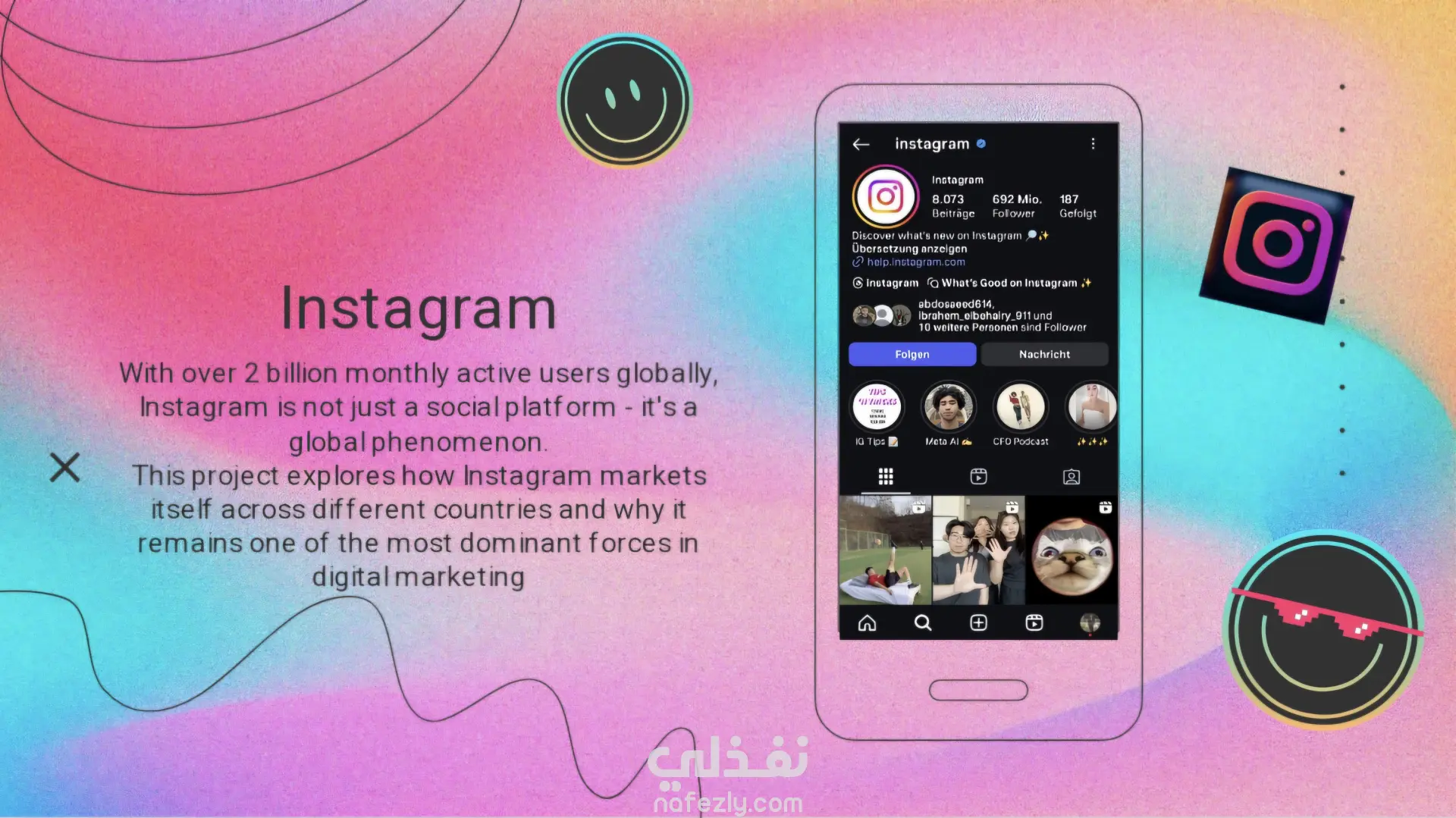 مشروع تحليل شامل لاستراتيجيات التسويق العالمية لمنصة إنستجرام، مع التركيز على فهم كيفية عمل المنصة كـ"ظاهرة عالمية" وكيف تحافظ على هيمنتها في التسويق الرقمي. يقدم هذا العمل تحليلاً تفصيليًا للمشهد الإعلامي الاجتماعي في اثنين من أكبر الأسواق العالمية: الولايات المتحدة الأمريكية والهند. الأهداف والمحاور الرئيسية تحليل إنستجرام كمنصة: يستعرض أهمية إنستجرام باعتبارها المنصة الأولى لـ"السرد القصصي المرئي والمشاركة المجتمعية"، مع أكثر من 2 مليار مستخدم نشط شهريًا. مقارنة الأسواق: يقارن البيانات الرئيسية لاستخدام الإنترنت ووسائل التواصل الاجتماعي وإنستجرام في الولايات المتحدة الأمريكية والهند. الهند: تمتلك 362.9 مليون مستخدم لإنستجرام. الولايات المتحدة: تمتلك 169.7 مليون مستخدم لإنستجرام. اختيار قنوات التسويق (Marketing Channels): يحدد القنوات التسويقية المثالية لإنستجرام للوصول إلى جمهوره المستهدف في السوقين، وتشمل: إعلانات فيسبوك (Meta Ads Network). إعلانات يوتيوب (YouTube Ads). إعلانات جوجل (Google Ads). الجمهور المستهدف والاستراتيجية: يحدد الجمهور الأساسي لإنستجرام (الشباب البالغون من 18 إلى 34 عامًا) ويقترح استراتيجيات المحتوى التي تركز على: السرد القصصي المرئي عالي الجودة. التعاون مع المؤثرين (Influencers). المحتوى الرائج والتفاعلي مثل "Reels" و"Stories" والاستفتاءات. القيمة المضافة للعميل هذا المشروع يقدم رؤى قائمة على البيانات لفهم نجاح إنستجرام عالميًا، مما يجعله نموذجًا ممتازًا لدراسة حالة التسويق الرقمي لمنصة ذات هيمنة عالمية. وهو مفيد لأي شخص مهتم بـ: استراتيجيات Social Media Marketing المتقدمة. تحليل الجمهور (Target Audience) في الأسواق الكبيرة. فهم دور إنستجرام كقوة دافعة للاتجاهات في مجالات الموضة والأعمال والترفيه.