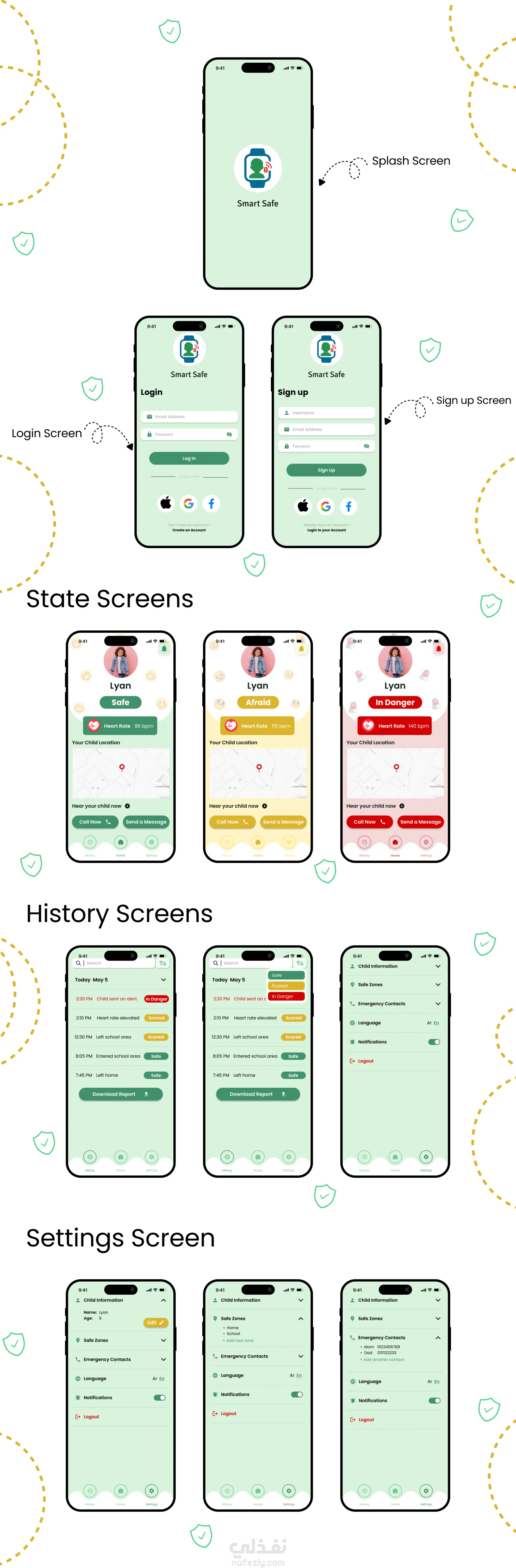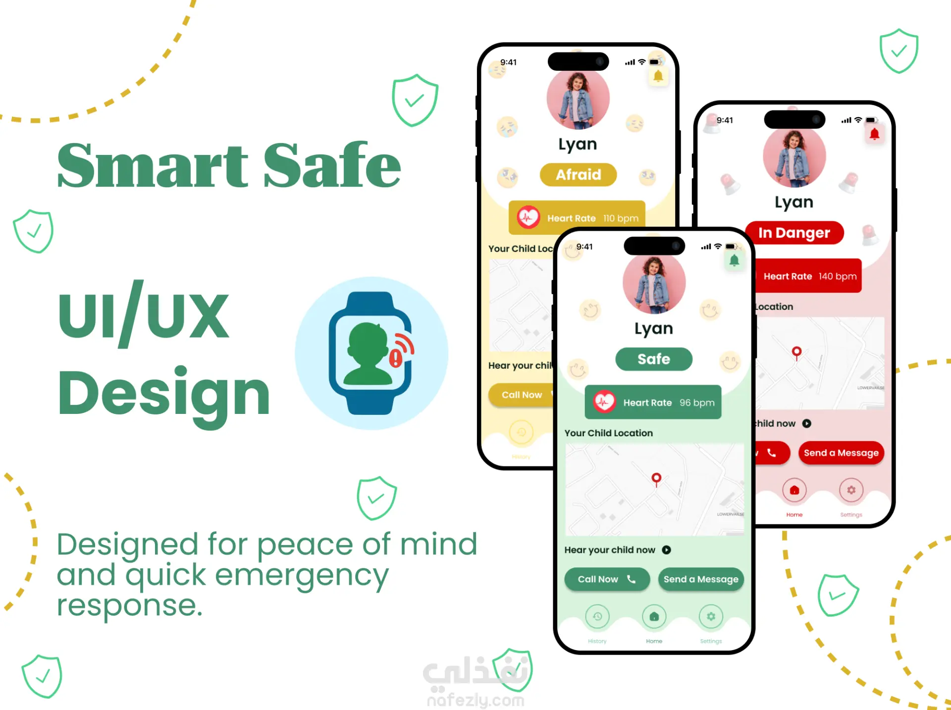 قمت بتصميم واجهة تطبيق ذكي مخصص لأولياء الأمور، مرتبط بساعة يرتديها الطفل وتقوم باستشعار أصوات الخوف أو الاستغاثة (مثل الصراخ)، لتقوم بإرسال تنبيه فوري للأهل. التطبيق يتيح تتبع حالة الطفل لحظة بلحظة، ويعرض التنبيهات في واجهة بسيطة وسهلة الاستخدام، تراعي سرعة التصرف وسهولة الوصول للمعلومة في حالات الطوارئ. ركزت في التصميم على البساطة والوضوح، مع مراعاة الجوانب الإنسانية والنفسية للأهل في مواقف الخطر. الواجهة تشمل: شاشة تنبيهات فورية حالة الطفل الحالية (آمن / استشعار خطر) تتبع الموقع الجغرافي ملف الطفل وإعدادات التنبيهات