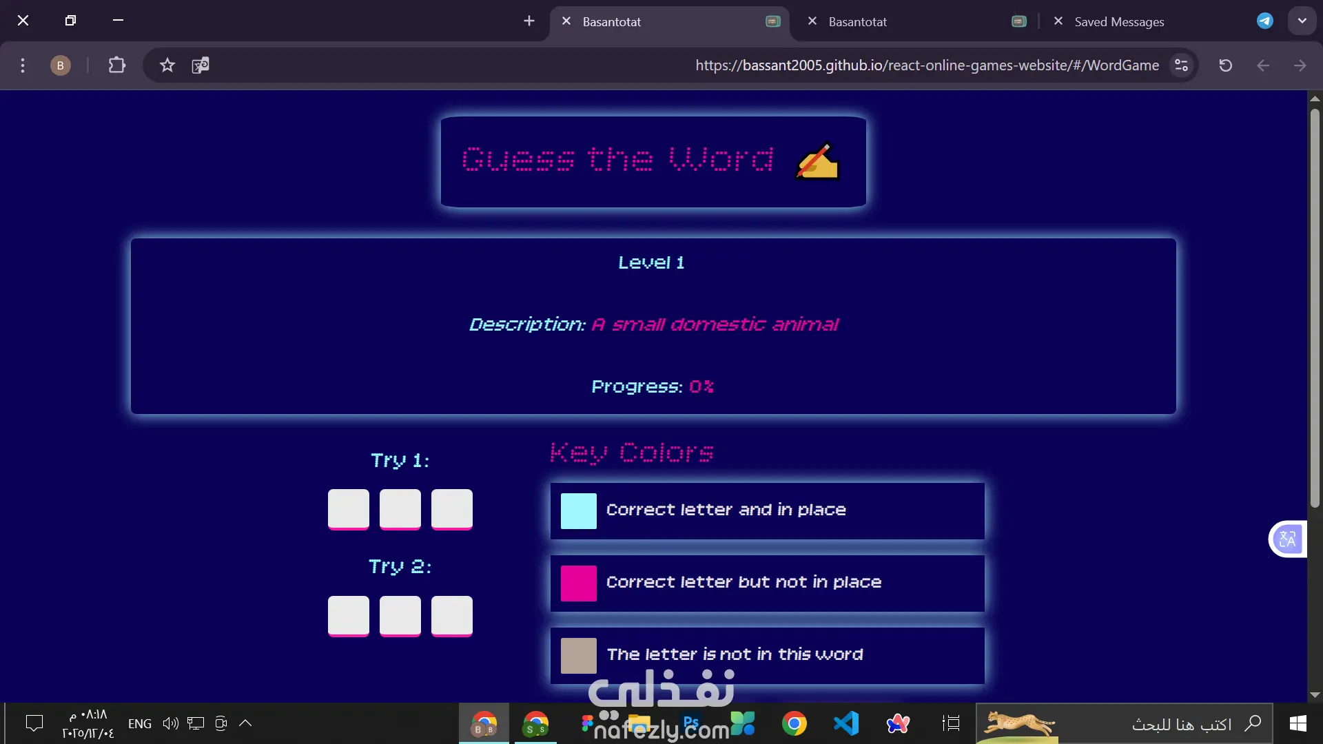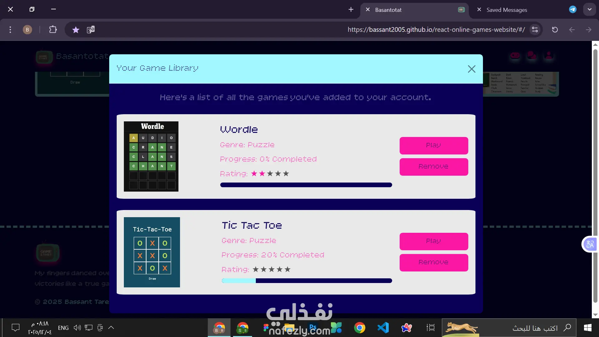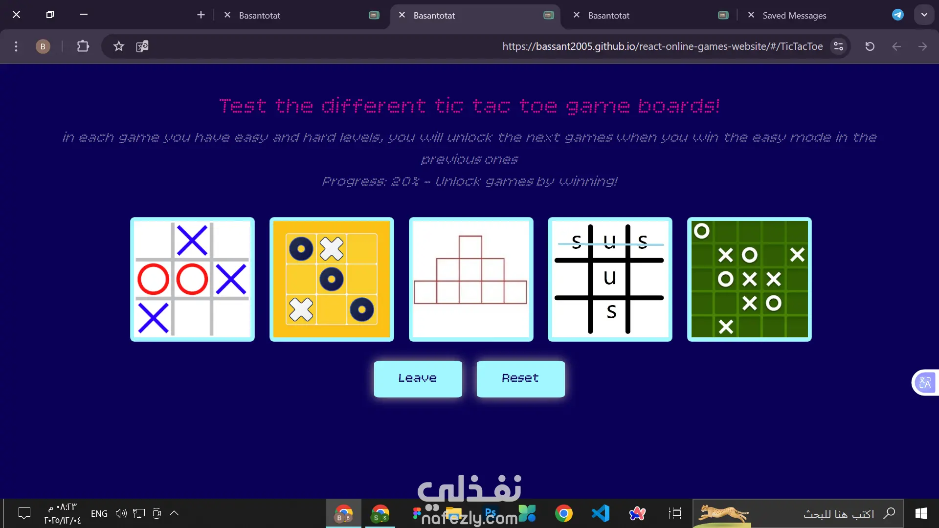 online games website that have 2 active games (words game and tic tac toe) each have number of levels to complete and your progress will be saved in the local storage
