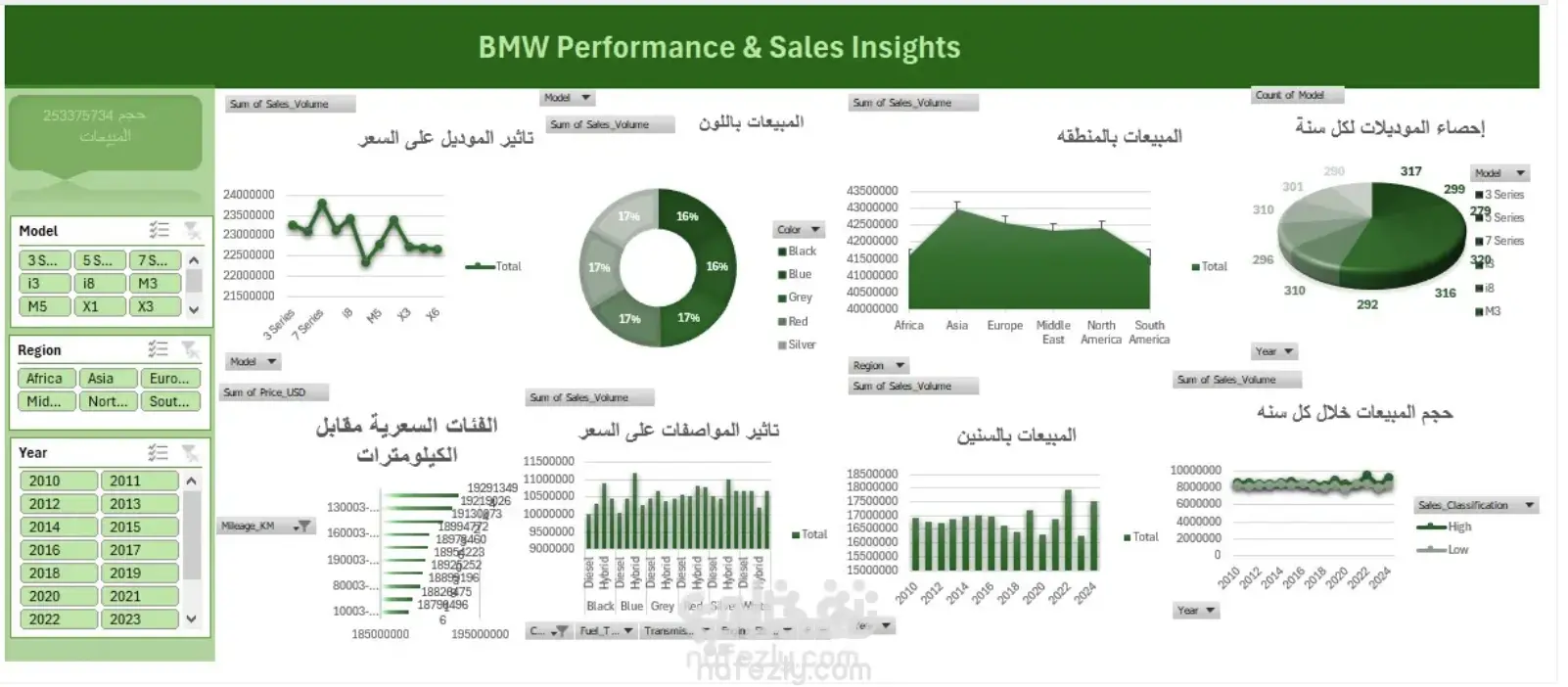 2. تحليل البيانات باستخدام Excel استخدام Pivot Tables لتحليل المبيعات إنشاء Pivot Charts ورسوم بيانية حساب مؤشرات الأداء (KPIs) مثل: إجمالي المبيعات أكثر موديلات BMW مبيعًا مقارنة بين الفروع المختلفة تحليل فترات البيع متوسط سعر البيع