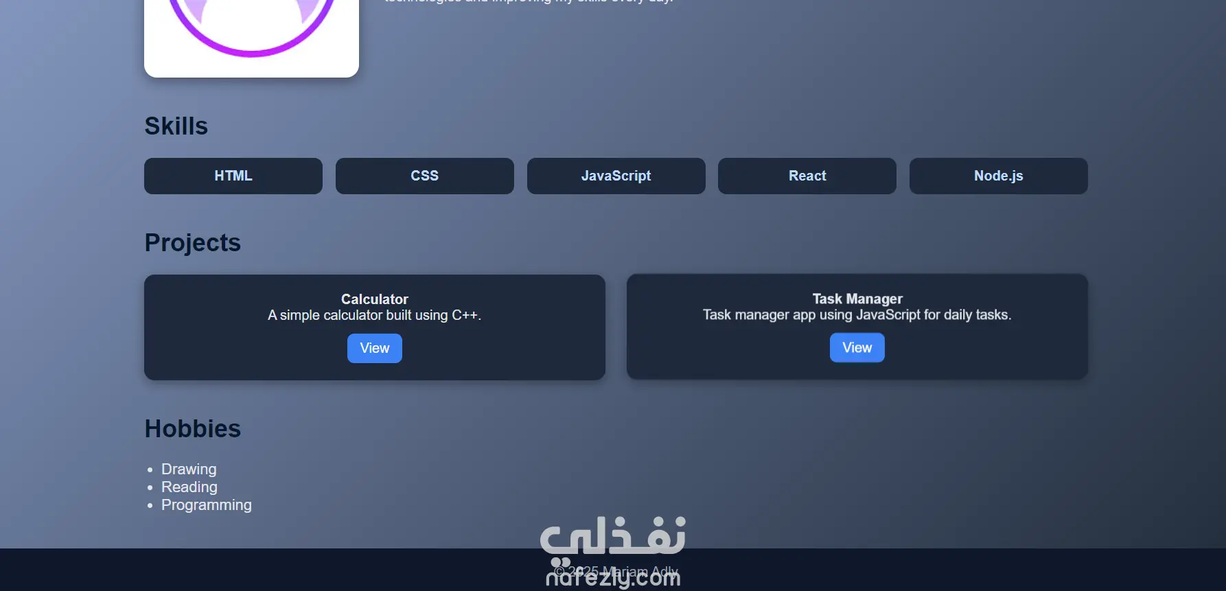 أقسام واضحة لعرض نبذة عني، المهارات، الأعمال السابقة، ووسائل التواصل.