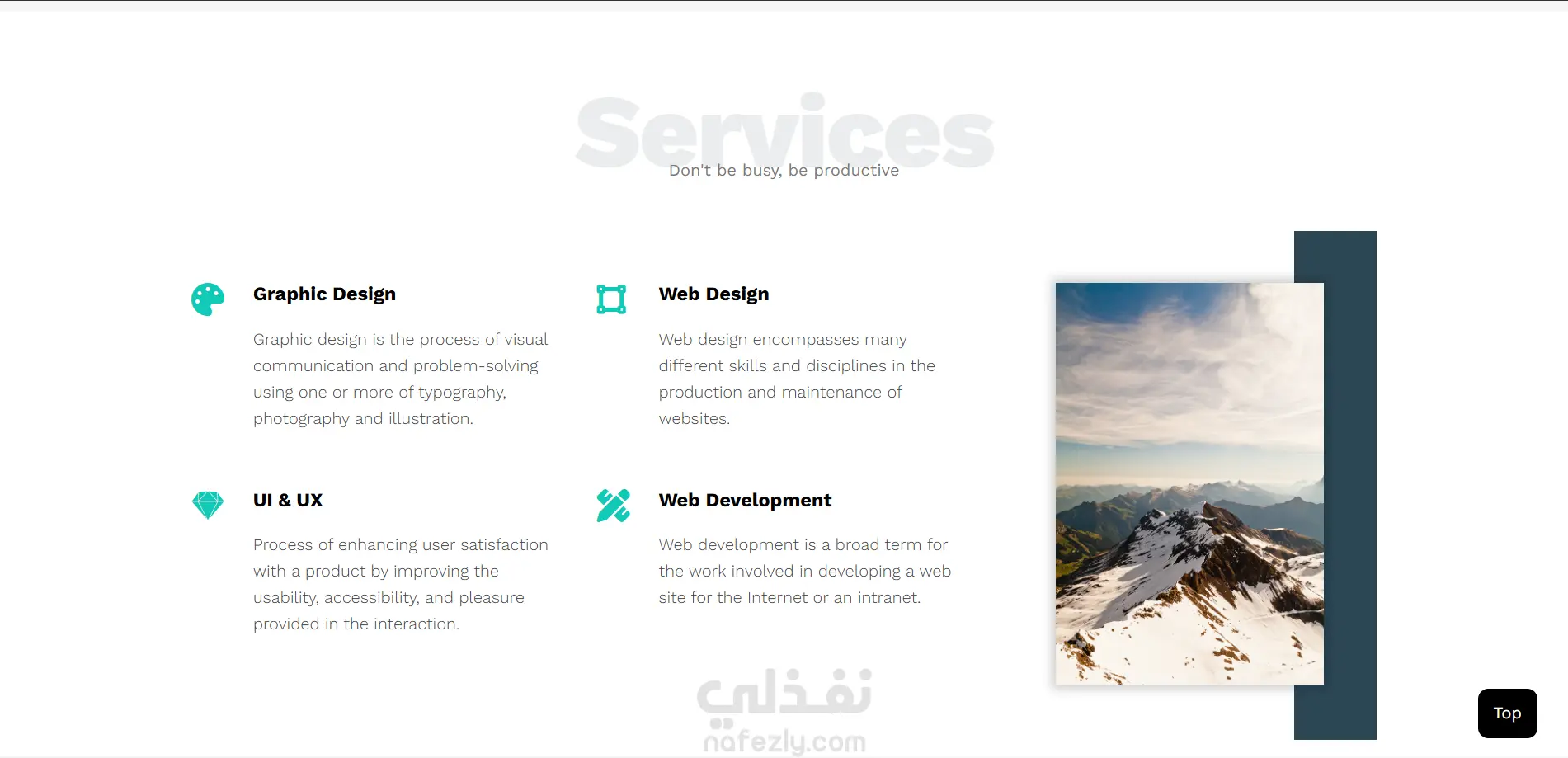 صفحة هبوط لعرض الخدمات والمميزات - أقسام الصفحة: قسم بطولي لجذب انتباه الزوار (Hero) عرض أهم الخدمات المقدمة (Services Section) قسم المشاريع السابقة (Projects section) قسم تعريفي بالشركة (About) - تصميم متجاوب بالكامل (Responsive): يعمل بكفاءة على الموبايل، التابلت، والديسكتوب. تحسين تجربة المستخدم لجميع الشاشات. - كود نظيف وسهل التطوير مستقبلاً