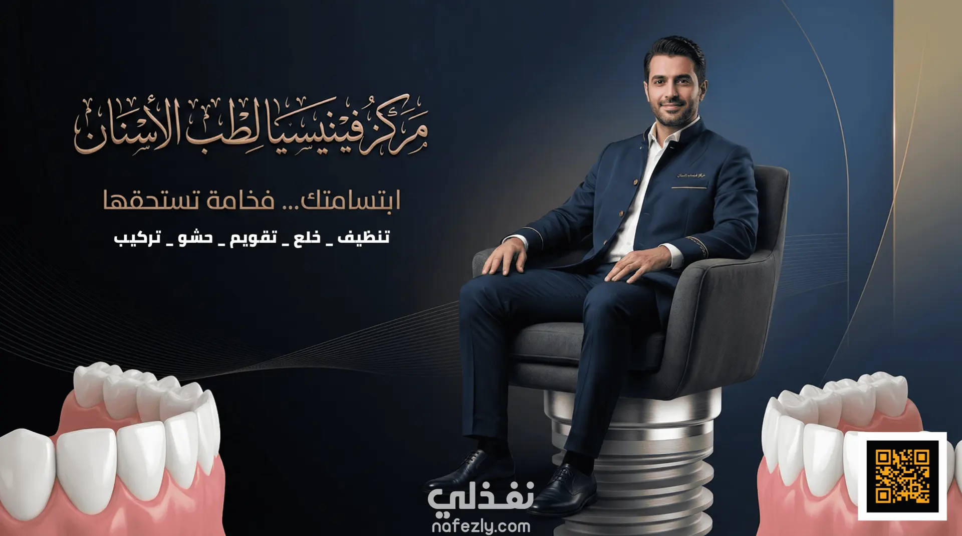 المفهوم الإبداعي (Concept Art): لم نضع مجرد صورة، بل خلقنا دلالة بصرية. تحويل "زرعة الأسنان" إلى قاعدة راسخة يجلس عليها العميل بثقة، لنوصل رسالة باطنية مفادها: خدماتنا هي الأساس القوي لثقتك بنفسك.