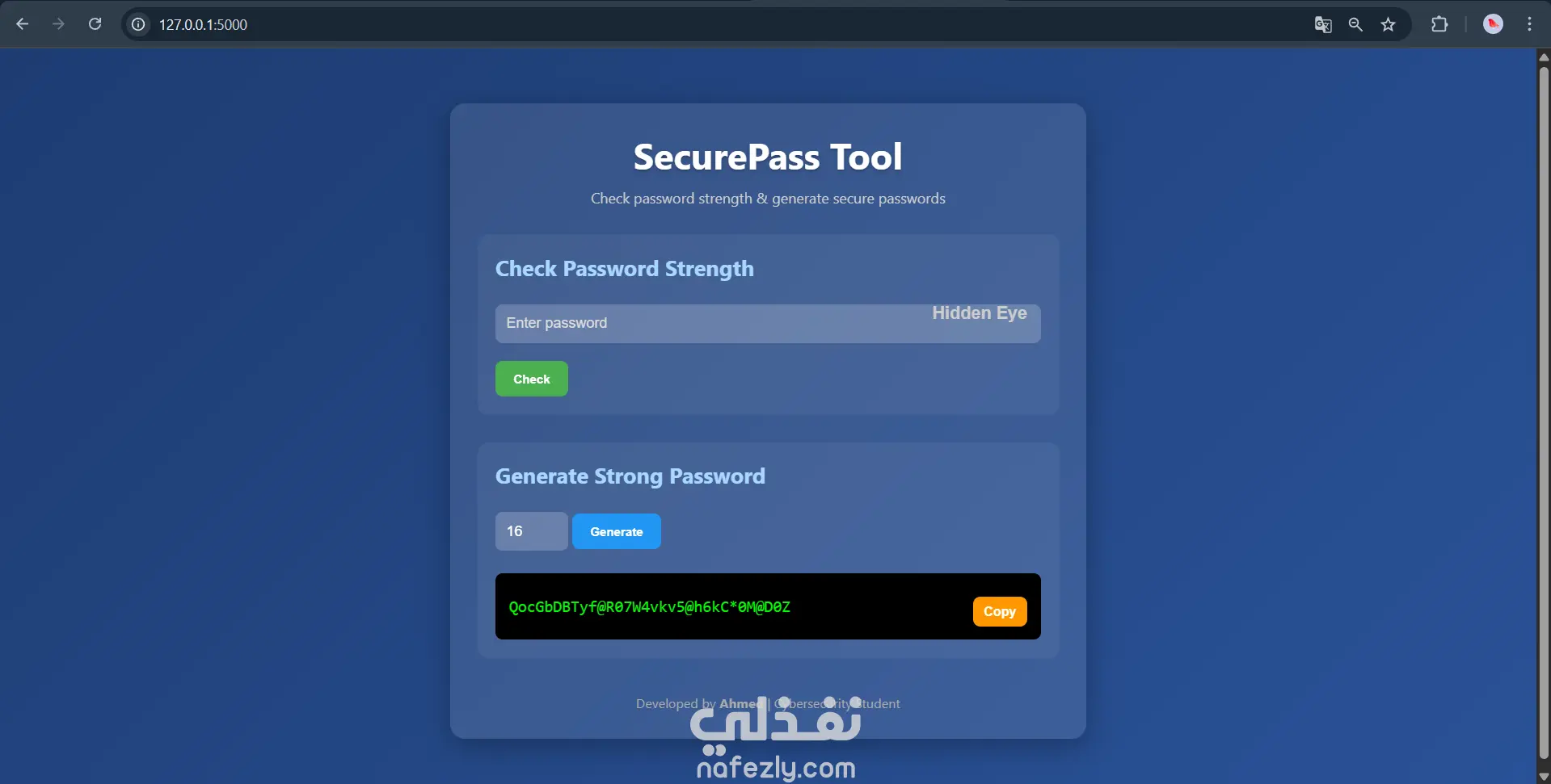 ## Features - Real-time password strength analysis - Secure password generation (8-50 characters) - Copy to clipboard - Responsive & beautiful UI --- ## Tech Stack - Python (Flask) - HTML + CSS (inline) - JavaScript --- ## How to Run ```bash pip install -r requirements.txt python app.py