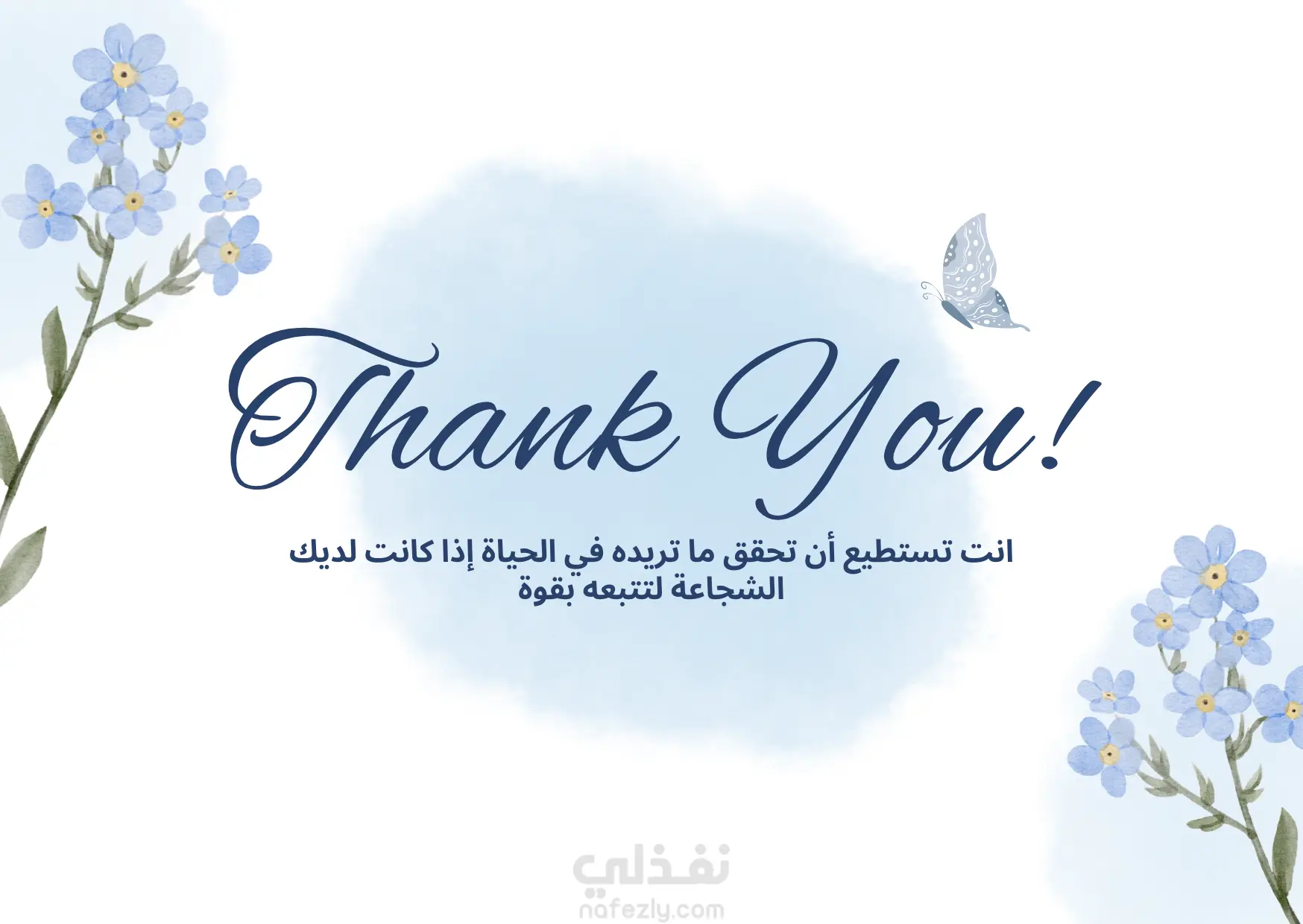 تصميم فني لكارت شكر يجمع بين الأناقة والبساطة، يحتوي على عبارة "Thank You!" بخط أنيق، وتحتها رسالة تحفيزية تقول: "انت تستطيع أن تحقق ما تريده في الحياة إذا كانت لديك الشجاعة لتتبعه بقوة." الخلفية بتدرجات الأزرق الفاتح، مزينة بزهور مائية وفراشة ناعمة، تعبر عن الأمل والامتنان. التصميم مناسب للطباعة أو الاستخدام الرقمي في بطاقات الشكر، الهدايا، أو الرسائل الشخصية.