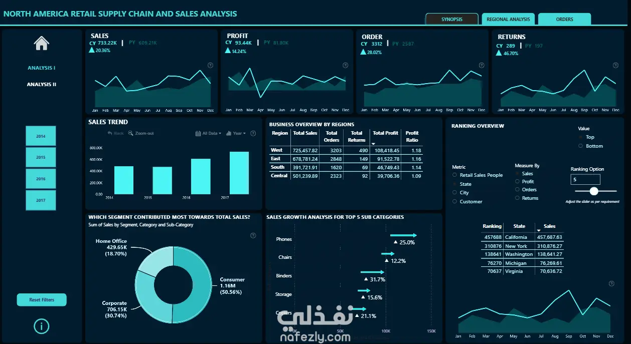 تم تطوير لوحة تحكم تفاعلية باستخدام Power BI لتحليل أداء سلسلة التوريد والمبيعات في قطاع التجزئة بأمريكا الشمالية. تعرض اللوحة مؤشرات رئيسية مثل المبيعات، الأرباح، عدد الطلبات، ونسبة المرتجعات، مع مقارنة سنوية بين الأداء الحالي والسابق. تشمل التحليلات توزيع المبيعات حسب المناطق (الغرب، الشرق، الجنوب، الوسط)، ونسبة الأرباح، وعدد المرتجعات، بالإضافة إلى مساهمة كل قطاع (المستهلك، الشركات، المكتب المنزلي) في إجمالي المبيعات. كما تم تحليل النمو في الفئات الفرعية الأعلى مبيعًا مثل الهواتف والكراسي والناسخات، مع عرض لأفضل الولايات أداءً من حيث المبيعات. تم تنفيذ المشروع باستخدام تقنيات متقدمة في النمذجة والتنظيف، مع تصميم بصري احترافي يسهل القراءة واتخاذ القرار.