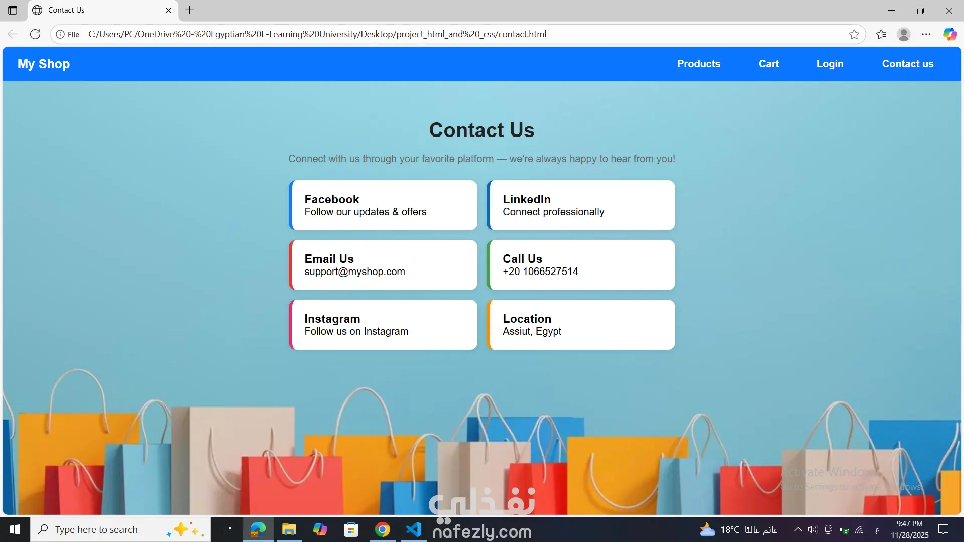 تم تصميم صفحة Contact Us لتوفير قنوات تواصل مباشرة وسهلة بين المستخدم والمتجر عبر منصّات متعددة بدلًا من نماذج الاتصال التقليدية.