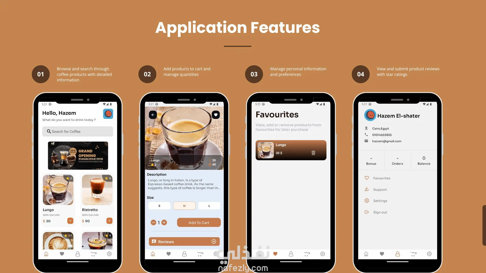 📱 Coffee Shop Mobile App – React Native قمت بتطوير تطبيق موبايل كامل لمتجر قهوة باستخدام React Native، يشمل جميع الوظائف الأساسية لتجربة شراء سلسة وحديثة: عربة تسوّق متكاملة (Shopping Cart): إضافة/حذف المنتجات، تحديث الكميات، حساب السعر النهائي بشكل ديناميكي. قائمة المنتجات المفضلة (Favorites): تمكين المستخدم من حفظ المنتجات للوصول السريع لها لاحقًا. إضافة بطاقات الدفع (Credit Card Integration): تصميم وتنفيذ واجهة إضافة بطاقة دفع مع التحقق من صحة البيانات. حماية قبل الدفع (Biometric Authentication): تفعيل التحقق عبر بصمة الإصبع أو بصمة الوجه قبل تأكيد عملية الشراء لضمان أمان أعلى. مراجعات المستخدمين (Product Reviews): إمكانية كتابة وتقييم المنتجات داخل التطبيق مع عرض مراجعات المستخدمين الآخرين. واجهة استخدام أنيقة ومتوافقة مع iOS وAndroid: تصميم حديث وسلس مع مراعاة تجربة المستخدم وسهولة التنقل.