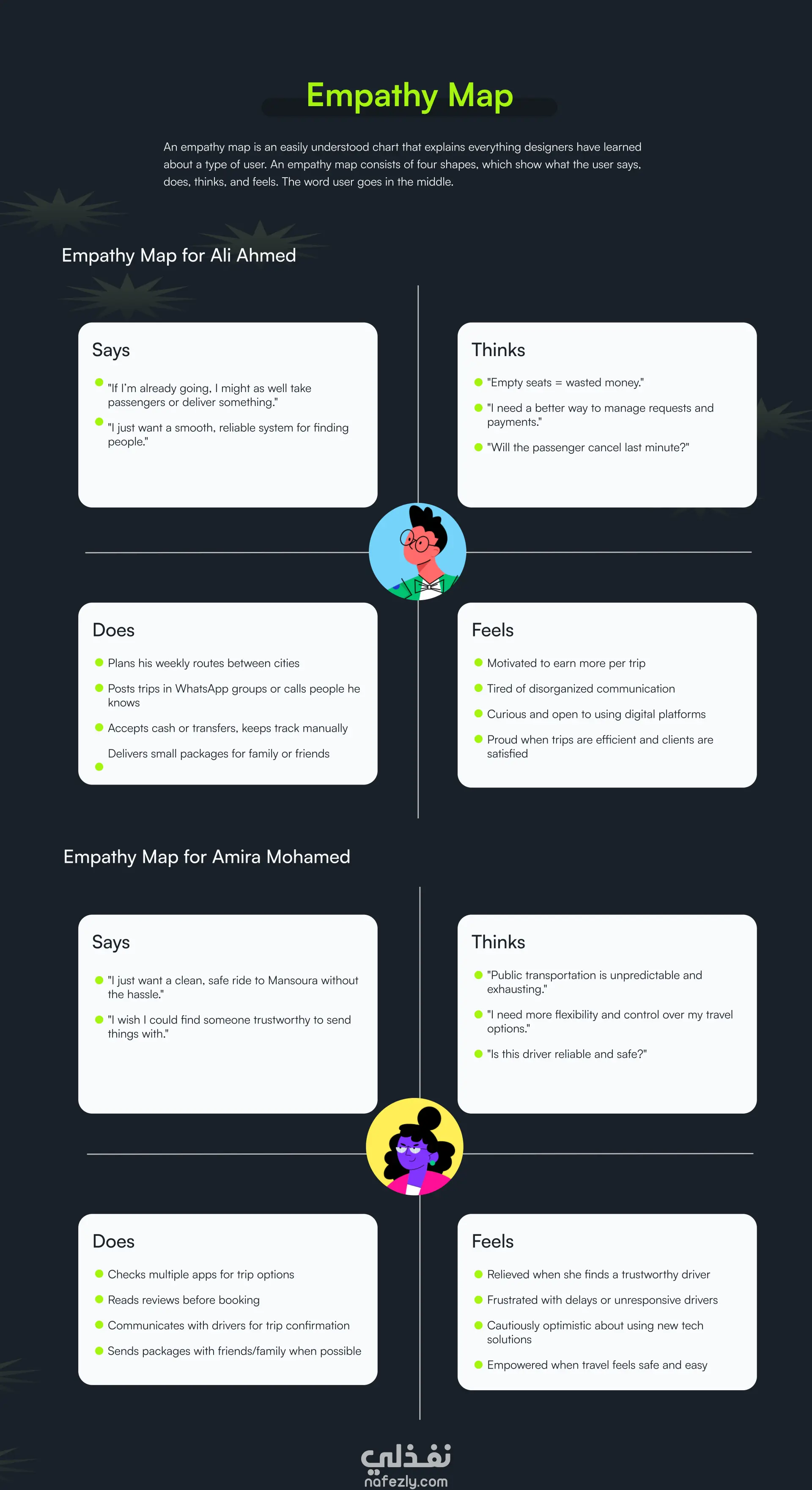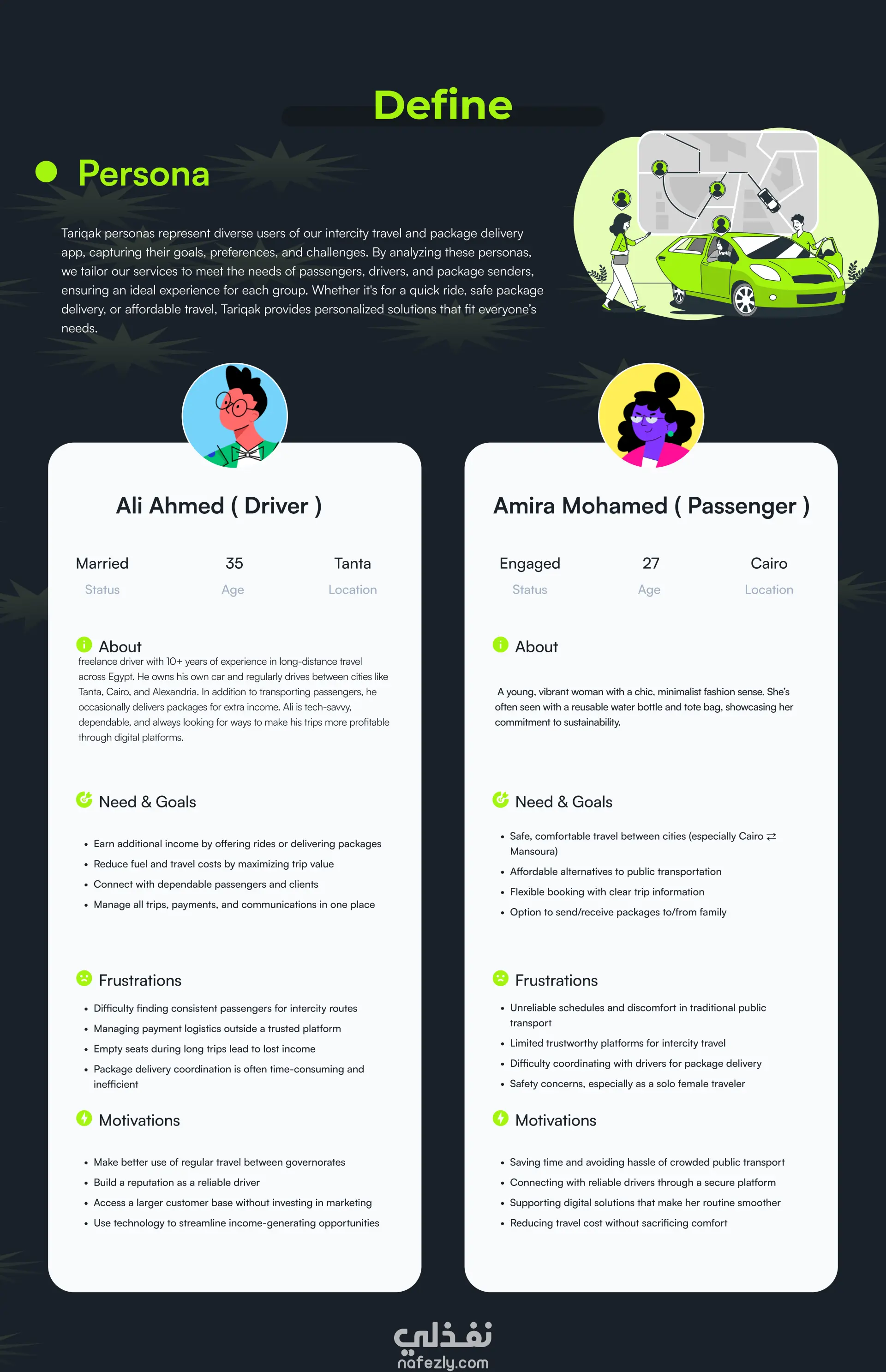 تصميم تجربة مستخدم لمشروع "Tariqak" – تطبيق مبتكر يبسط السفر بين المحافظات في مصر، من خلال دمج خدمات الركوب المشترك، وتأجير السيارات، وتوصيل الطرود في تجربة واحدة آمنة وسلسة. تم تنظيم واجهات الاستخدام بناءً على احتياجات المستخدم، وسلاسة التنقل، ووضوح العناصر. كما تم تعزيز المشروع باستخدام نظام تصميم متكامل (Design System) مدعوم بـ Tokens لتوحيد المظهر وسهولة التوسع لاحقًا، مع توفير توافق داخلي ومرونة في التحديثات المستقبلية.
