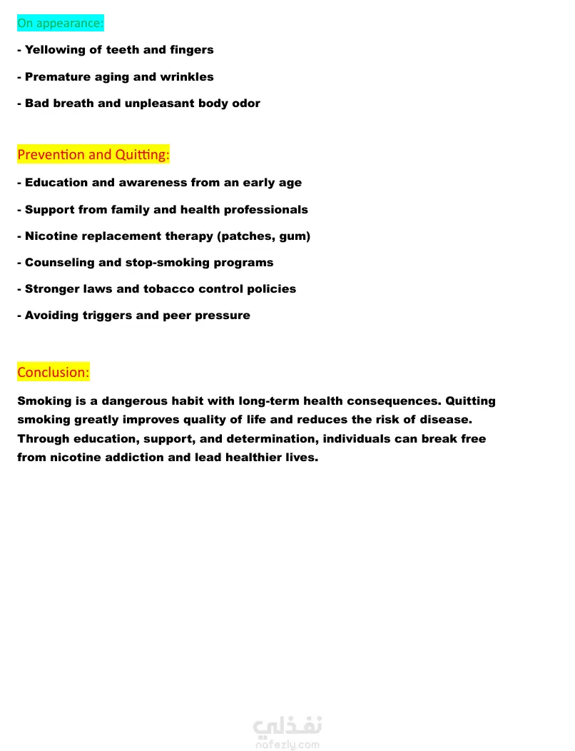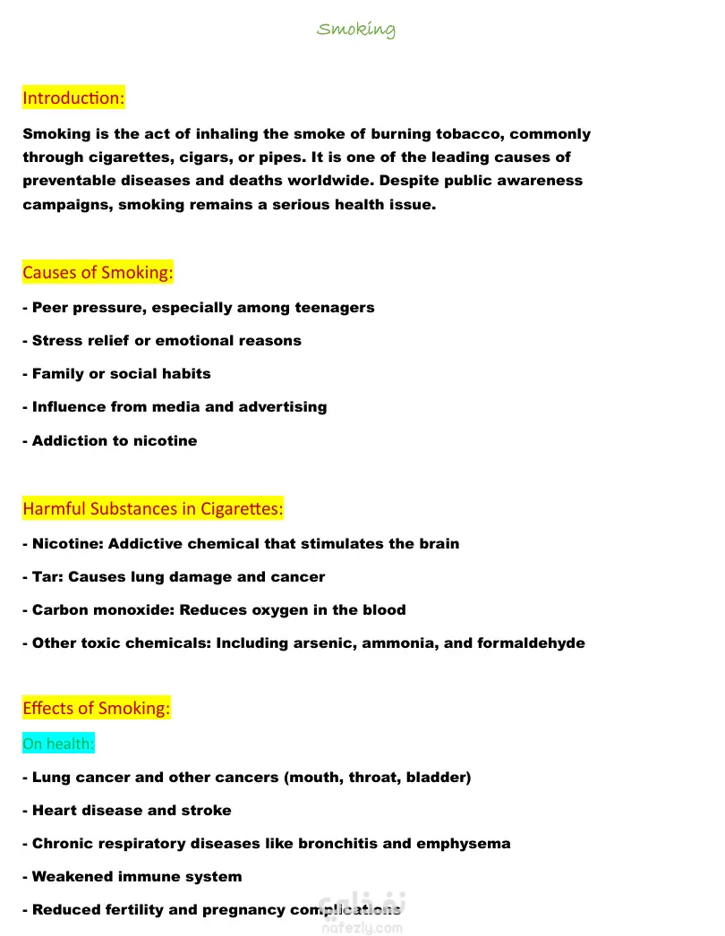 يتناول هذا العمل شرح مفهوم التدخين وخطورته، مع توضيح الأسباب التي تدفع الأفراد لبدء هذه العادة، خاصة بين الشباب والمراهقين. كما يبرز البحث المواد السامة الموجودة في السجائر وكيف تؤثر كل مادة منها على الجسم. ويعرض بالتفصيل الآثار الصحية الخطيرة للتدخين، مثل السرطانات وأمراض القلب والجهاز التنفسي، إضافة إلى الآثار الجمالية السلبية على المظهر الخارجي. ويتناول العمل أيضًا طرق الوقاية وأساليب الإقلاع عن التدخين، مع التأكيد على دور التوعية والدعم الاجتماعي والقوانين في الحد من انتشار هذه العادة. ويختتم بالتأكيد على أهمية الإقلاع لتحسين الصحة وجودة الحياة على المدى الطويل.