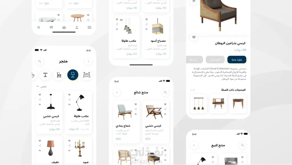 تجربة مستخدم متكاملة لتطبيق تجارة إلكترونية متخصص في بيع الأثاث والديكور المنزلي، تشمل تصميم الشاشات الأساسية مثل صفحة المتجر، تفاصيل المنتجات، سلسة التصفية، سلة المشتريات، إضافة إلى شاشات الـ Onboarding.