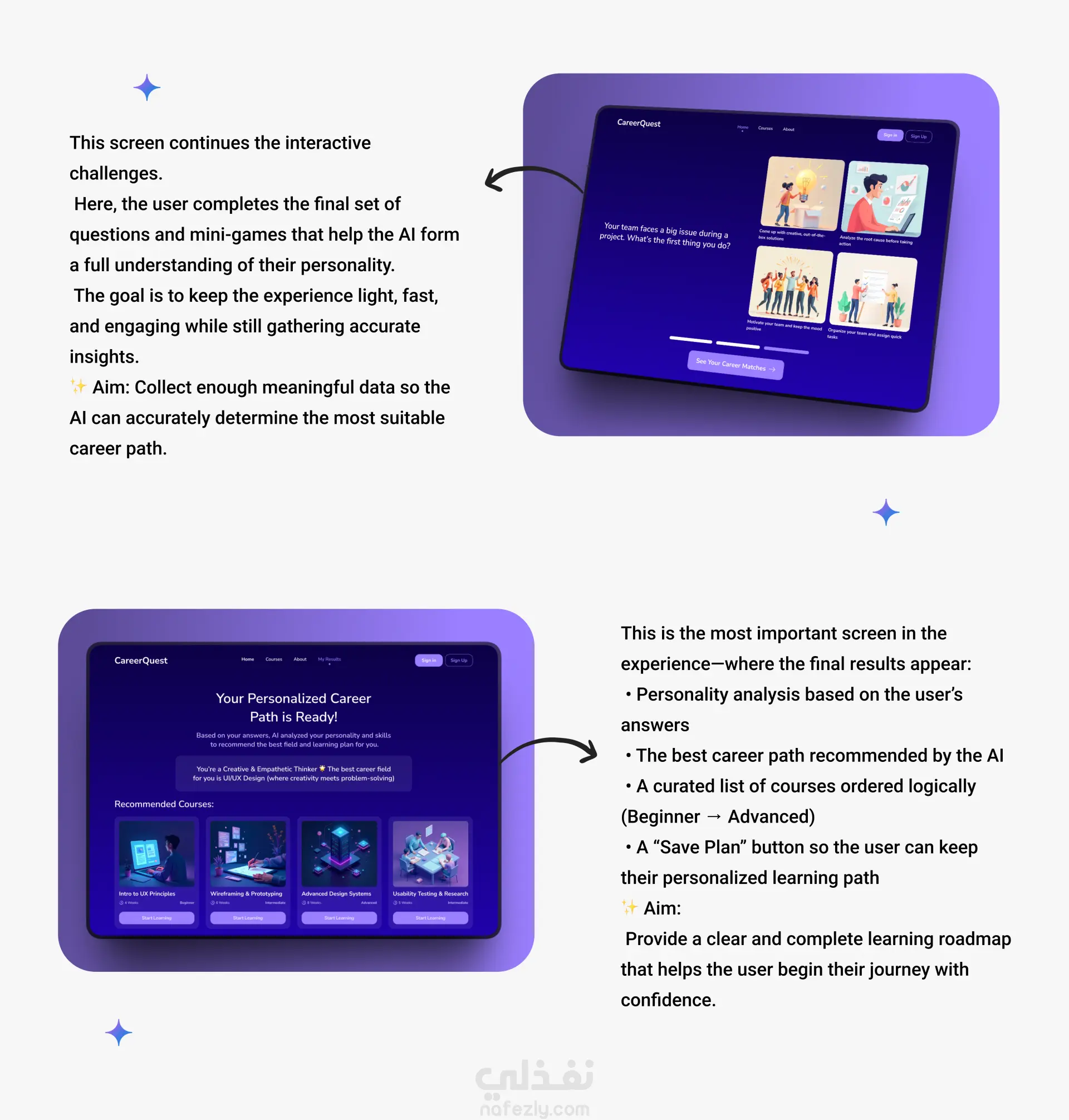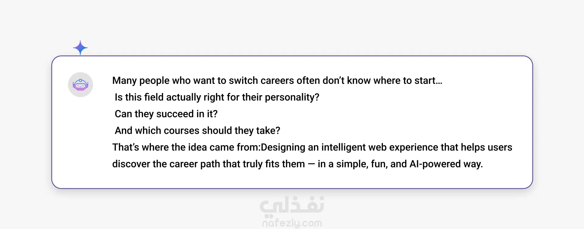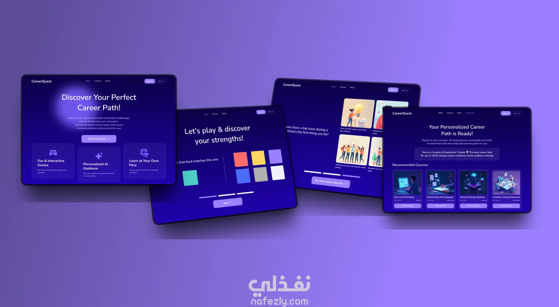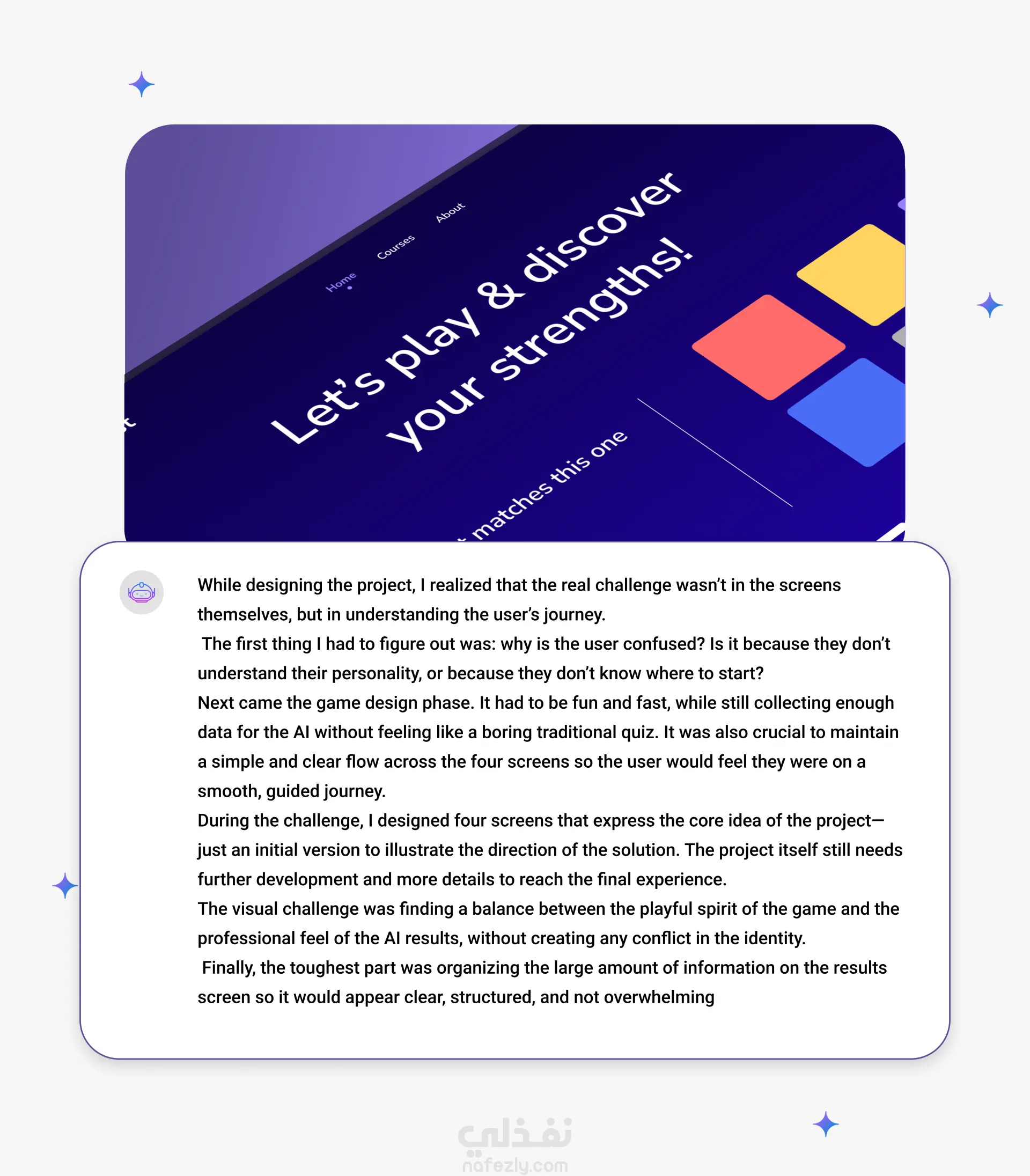 AI-Powered Career Explorer – Web App UI/UX Design هذا المشروع عبارة عن تصميم واجهات مستخدم (UI/UX) لتجربة مبتكرة تساعد المستخدمين على اكتشاف المجال المهني الأنسب لهم باستخدام الذكاء الاصطناعي. يعاني كثير من الأشخاص عند التفكير في تغيير مسارهم المهني من الحيرة وعدم معرفة المجال المناسب لشخصيتهم وقدراتهم. لذلك، ركّز المشروع على تصميم تجربة بسيطة ومرنة تجعل رحلة اكتشاف المجال أكثر وضوحًا ومتعة. يتضمن المشروع 4 شاشات رئيسية تمثل النسخة الأولية من الفكرة الأساسية: 1- Intro Screen – مقدمة تعريفية تعطي المستخدم فكرة سريعة عن المنصة ودورها، مع زر للبدء. 2- Game Section – الجزء الأول من اللعبة المستخدم يجاوب على تحديات تفاعلية بسيطة تساعد على فهم شخصيته بطريقة غير تقليدية. 3- Game Final Step – المرحلة الأخيرة استكمال اللعبة بأسئلة ممتعة وسريعة لتجميع بيانات دقيقة للذكاء الاصطناعي. 4- AI Recommendation Screen – شاشة نتائج الذكاء الاصطناعي يقوم الـAI بتحليل إجابات المستخدم واقتراح المجالات المناسبة له، مع ترشيحات لكورسات تساعده على البداية. هدف المشروع تقديم تجربة ذكية، سهلة، ومختصرة تساعد المستخدم على: فهم نفسه بشكل أفضل اكتشاف المجالات اللي تناسب شخصيته الحصول على توصيات جاهزة للدراسة أو التطوير