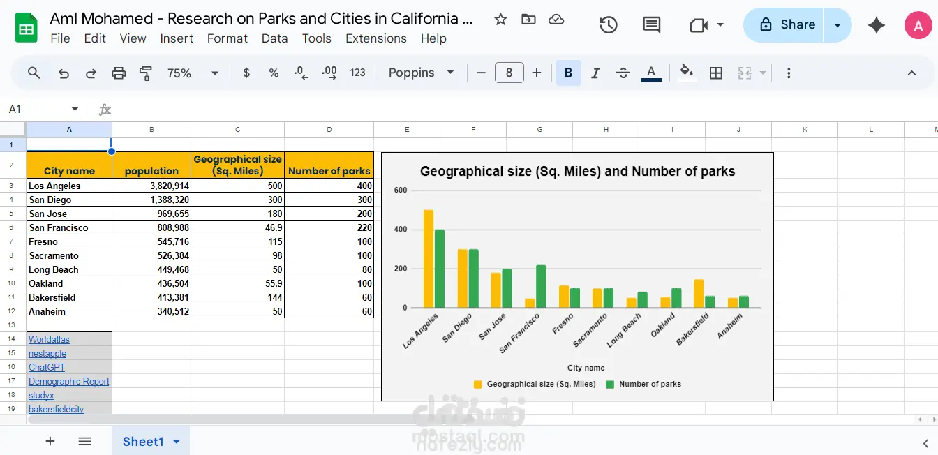 Milestone for Alx البحث وإدخال البيانات - البحث عبر الأنترنت عن أكبر 10 مدن في كاليفورنيا والحدائق (2024): توضيح إسم المدينة, المساحة الجغرافية (ميل مربع), عدد الحدائق و عدد السكان لكل مدينة. - تمثيل البيانات (رسم بياني ثلاثي الأبعاد لعدد الحدائق و مساحة المدينة بالميل المربع في كل مدينة).