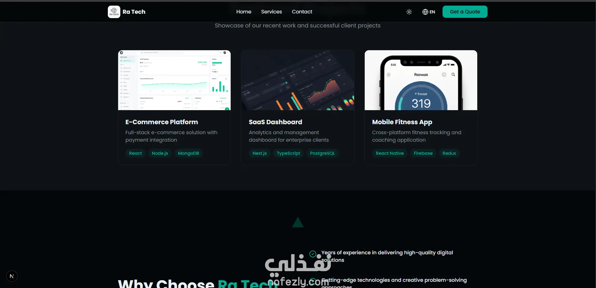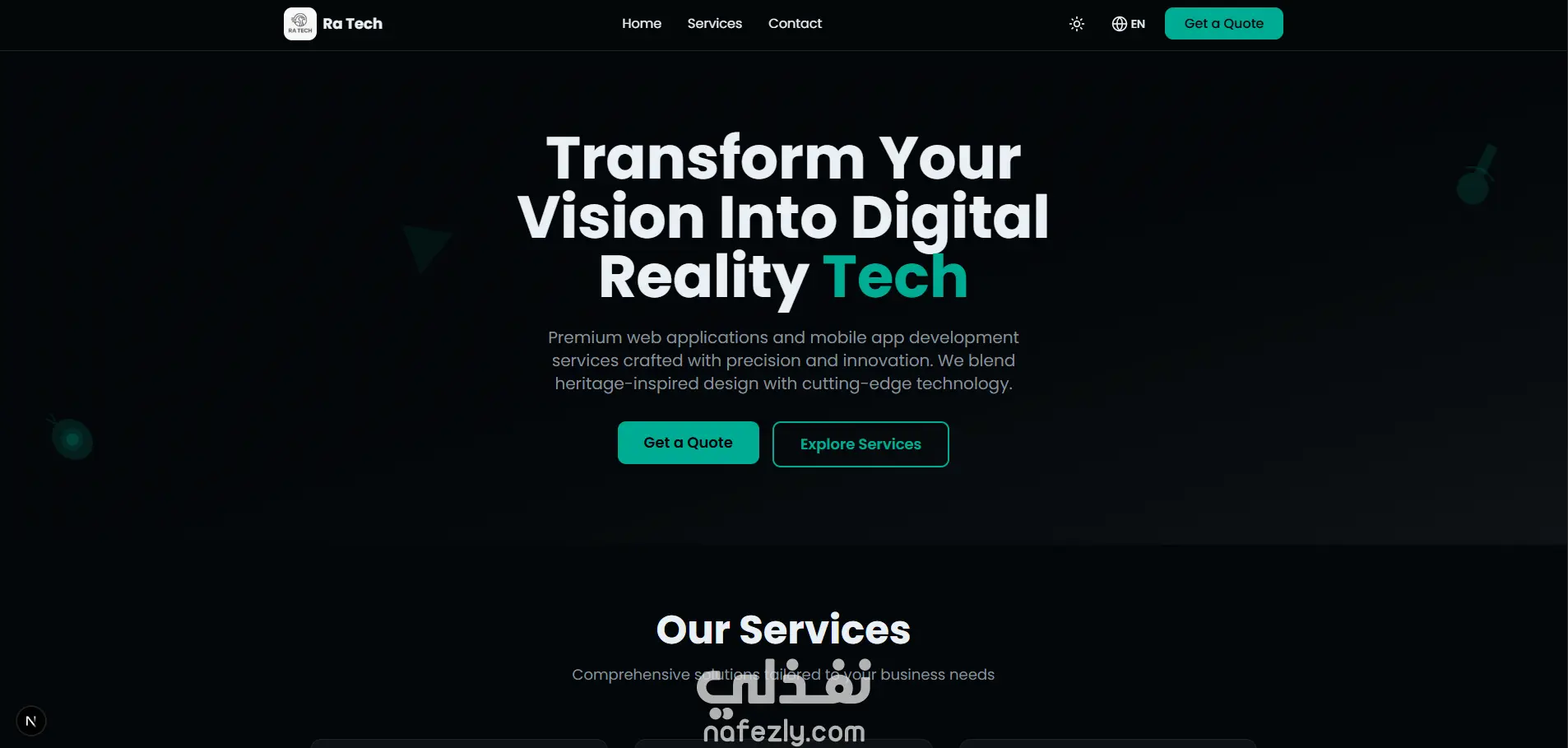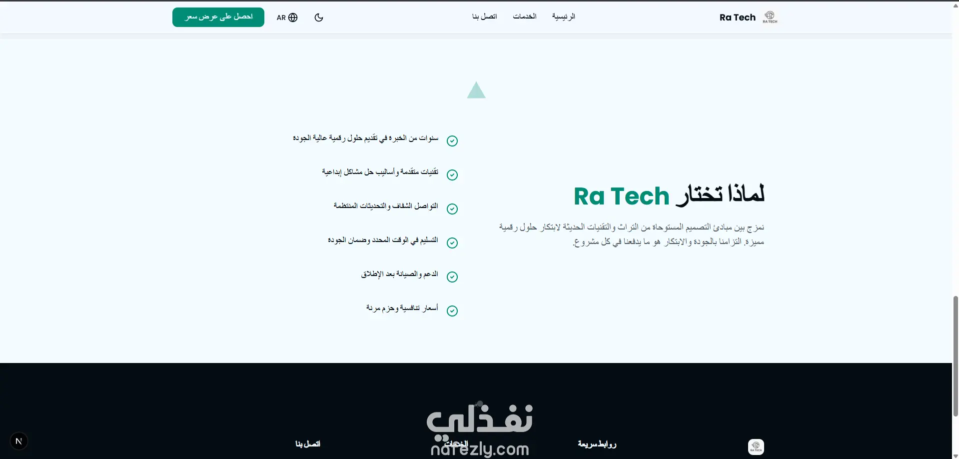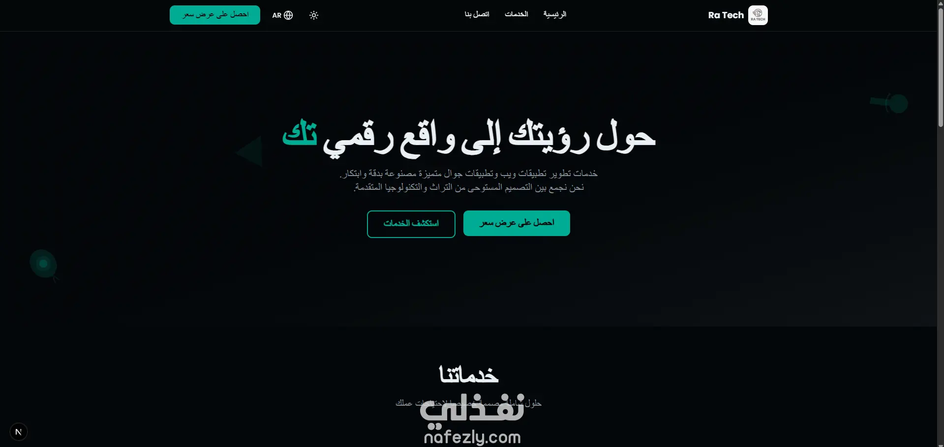 أستعرض نموذج واجهة أمامية (Frontend) مطوّرة باستخدام Next.js لموقع شركة تقنية حديثة باسم رع تك.