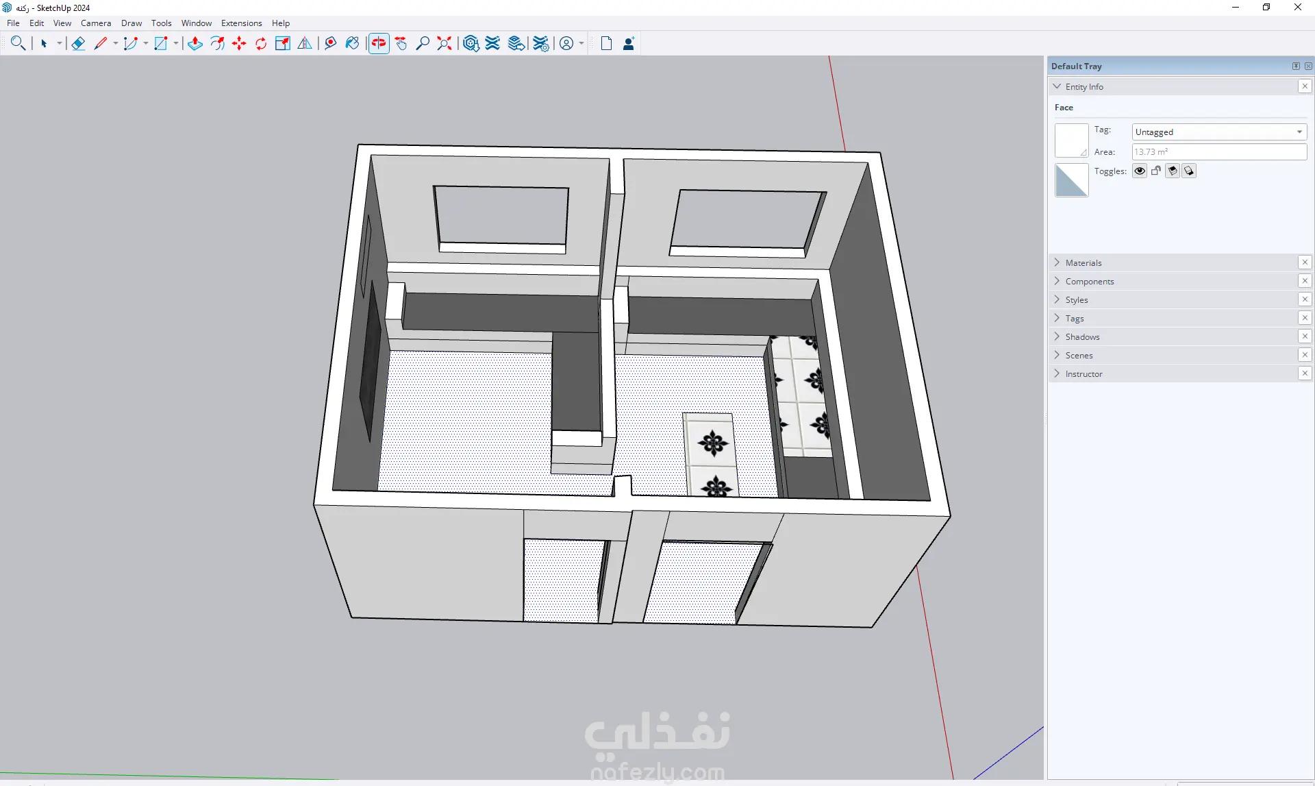 المساحة مقسّمة إلى غرفتين متجاورتين، يفصل بينهما جدار داخلي مع فتحة باب لكل غرفة. في الجزء العلوي من النموذج تظهر نافذتان كبيرتان على الجدار الخلفي، واحدة لكل غرفة. الغرفة اليسرى تبدو فارغة تمامًا مع بعض البروزات في الجدران، ربما تجهيزات لركنة أو مكتبة حائط. الغرفة اليمنى تحتوي على: ركنة (L-shape) أو جلسة مبنية من الخرسانة أو الجبس، مثبتة بمحاذاة الجدارين الخلفي والأيمن. في منتصف الغرفة تقريبًا يوجد عنصر مستطيل صغير يشبه طاولة أو قاعدة مبنية. يوجد جزء من الأرضية بخامة مختلفة (أبيض مع نقوش سوداء)، ربما يمثل منطقة المطبخ أو مساحة مبلّطة. الجدران سميكة ومصممة بدقة، مع فتحات الأبواب في الواجهة الأمامية للمساحة. الإضاءة والألوان محايدة، مكونة من درجات الرمادي والأبيض لتسهيل رؤية التخطيط. الصورة بشكل عام تُظهر مخططًا أوليًا لفراغ سكني مقسم مع جلسة ثابتة وأرضيات مختلفة، بدون أثاث نهائي، مما يعني أنها مرحلة تصميم مبدئية في SketchUp