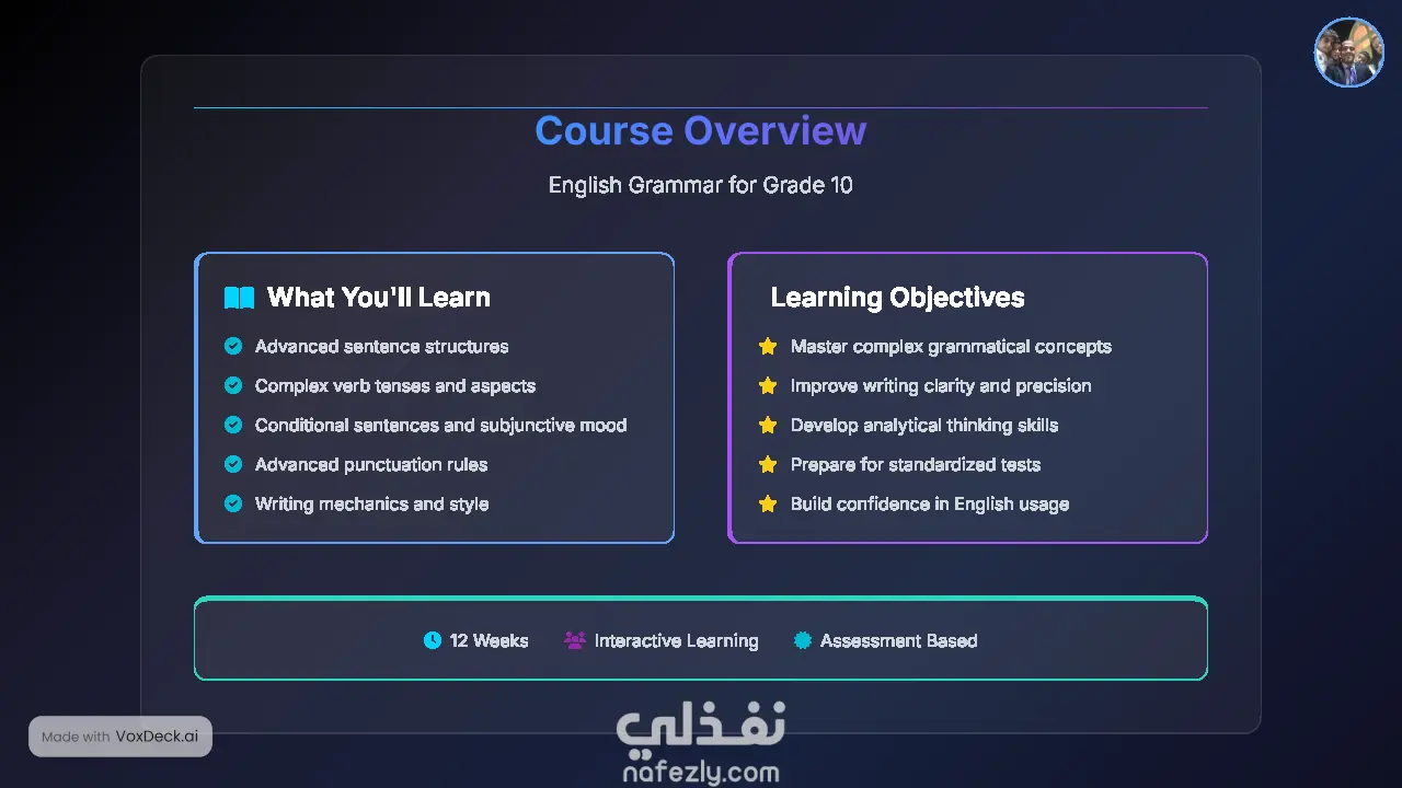 Advanced sentence structures Complex verb tenses and aspects Conditional sentences and subjunctive mood Advanced punctuation rules Writing mechanics and style Learning Objectives ⭐ Master complex grammatical concepts ⭐ Improve writing clarity and precision ⭐ Develop analytical thinking skills ⭐ Prepare for standardized tests ⭐ Build confidence in English usage