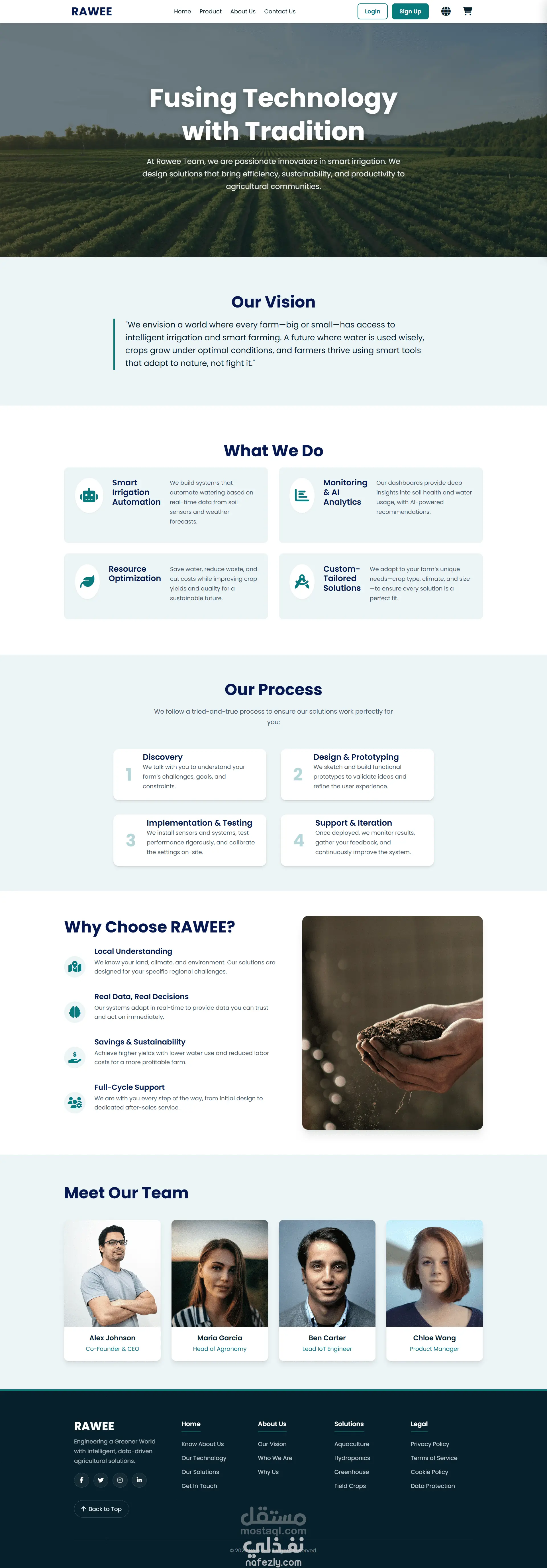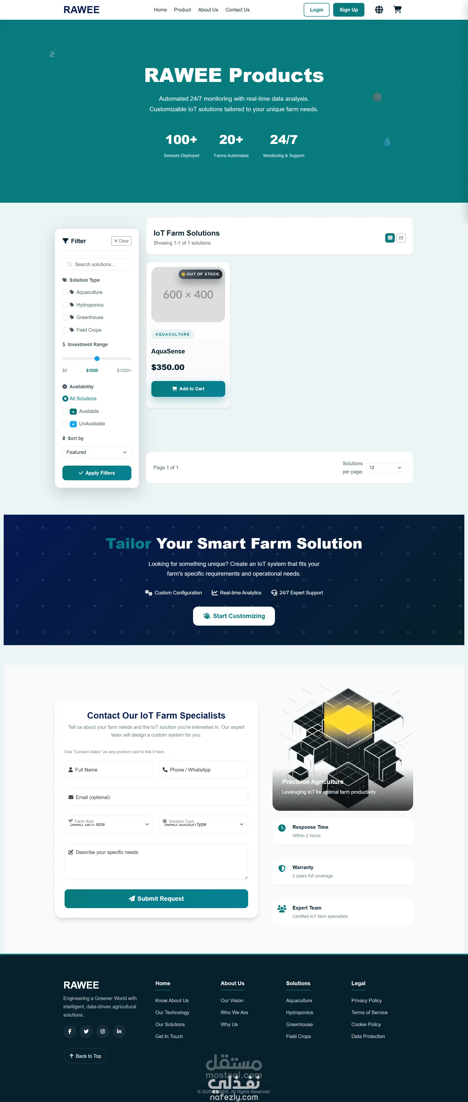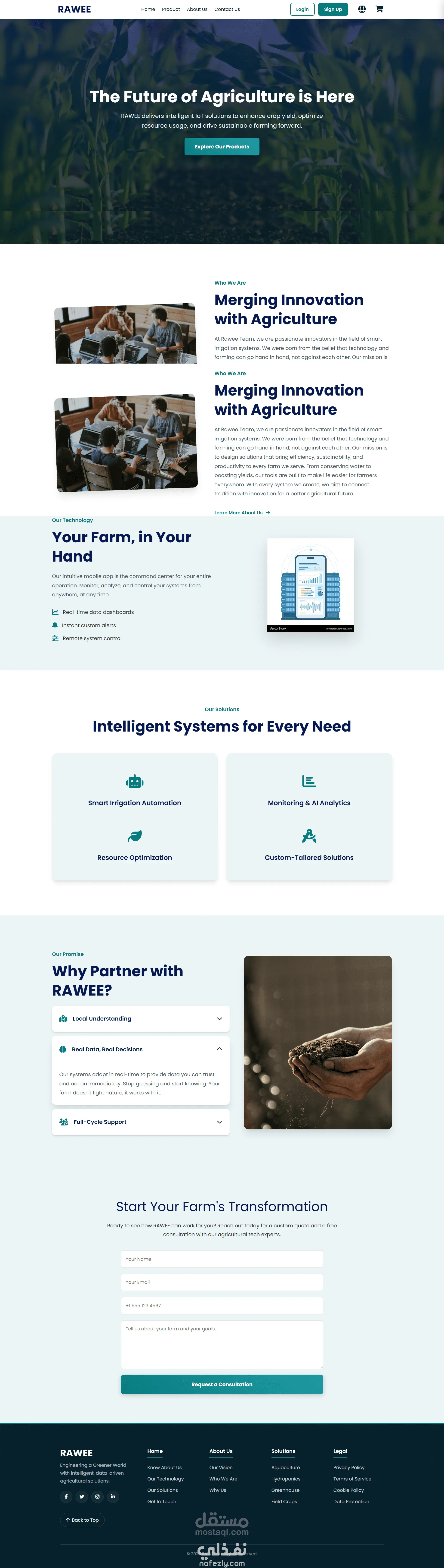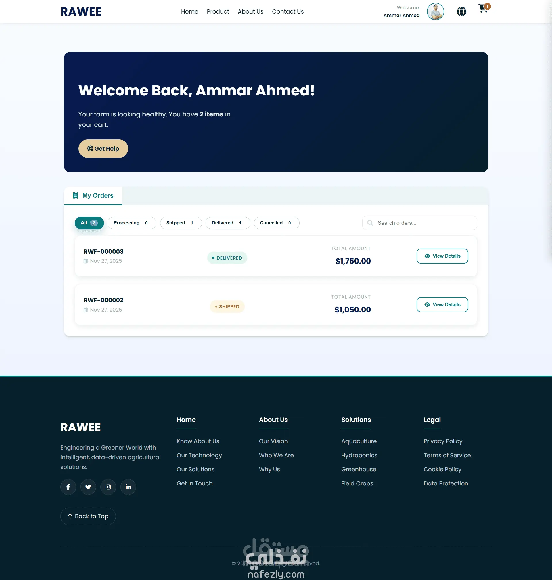 في مشروع RAWEE للزراعة الذكية، شاركت في تطوير منصة إلكترونية متكاملة تربط حلول إنترنت الأشياء (IoT) بالواجهة الرقمية للشركة، بهدف توحيد تجربة المستخدم والإدارة عبر الموقع ولوحة التحكم. ركز التطوير على بناء نظام مرن وقابل للتوسع يجمع بين عرض خدمات الشركة وإدارة المستخدمين والمنتجات والطلبات ضمن بيئة واحدة متناسقة. توليت تصميم وتطوير واجهة مستخدم حديثة ومتجاوبة تدعم اللغتين العربية والإنجليزية بالكامل، مع تحويل تلقائي لاتجاه الصفحات (RTL/LTR). شمل ذلك بناء صفحات أساسية مثل: من نحن، المنتجات، تواصل معنا، والخدمات، مع إمكانية إدارة المحتوى ديناميكيًا. أما في جانب الـ Backend، فقد قمت ببناء لوحة إدارة متكاملة باستخدام PHP و MySQL تشمل: نظام تسجيل دخول آمن للمستخدمين والمشرفين. إدارة المنتجات والمستخدمين (إضافة – تعديل – حذف). عرض الطلبات والإحصائيات والمتابعة الفورية للاستفسارات. ربط البيانات بالواجهة بشكل ديناميكي من قاعدة البيانات. بناء واجهة API داخلية لاستقبال بيانات أنظمة الـ IoT. دمج Google Authentication للتسجيل بحساب Google. دمج Paymob API كوسيلة دفع تدعم جميع بطاقات الائتمان والخصم. كما تم تحسين الأداء وسرعة التحميل وضمان استقرار المنصة مع قابلية التوسع مستقبلاً لإضافة حلول الري الذكي والتحليلات المتقدمة. بشكل عام، الهدف كان بناء منصة قوية تعكس هوية الشركة وتوفر أدوات إدارية فعّالة لإدارة البيانات والمحتوى، مع جاهزية كاملة لدمج الأنظمة الذكية للزراعة