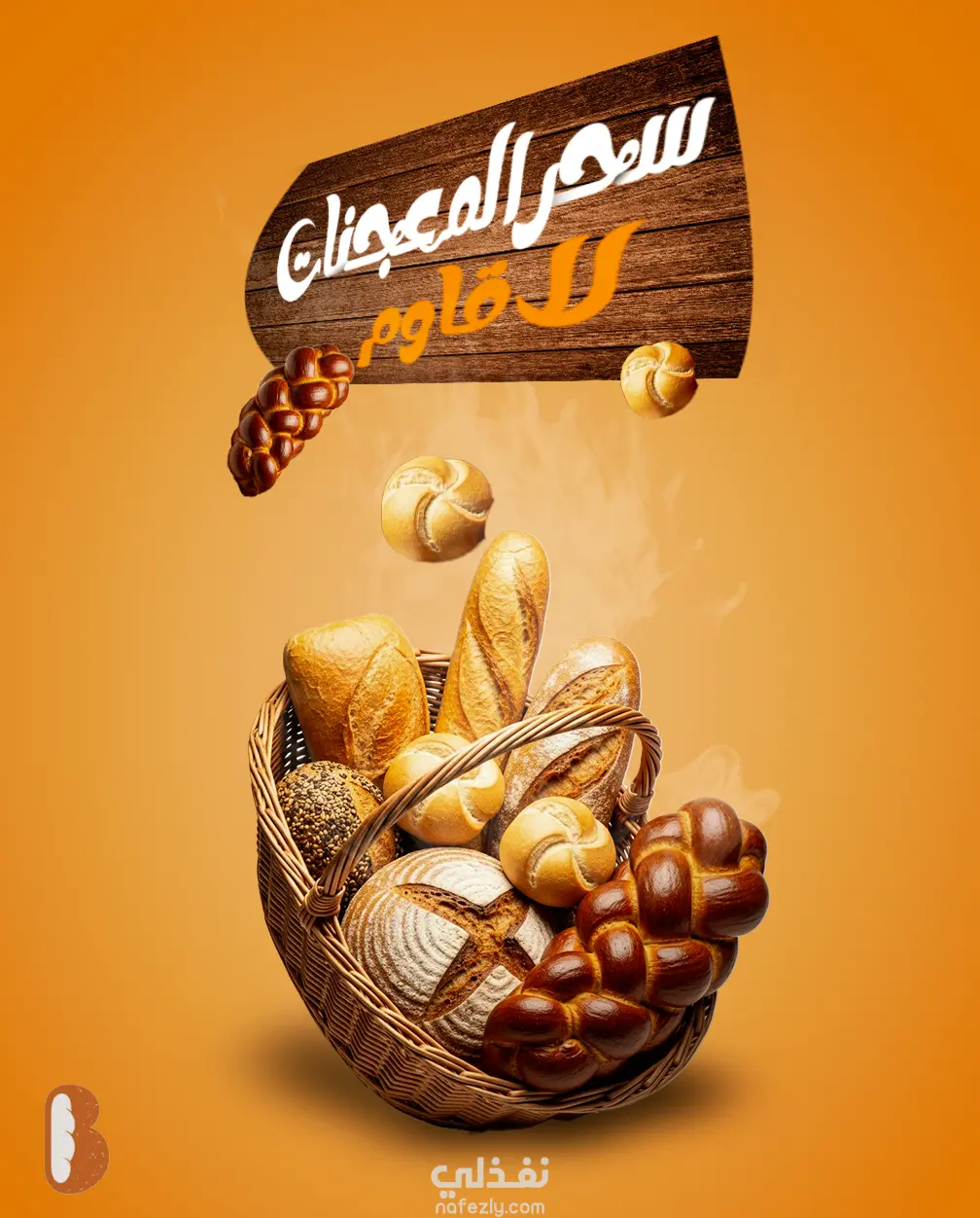 يرتكز التصميم على إبراز تنوّع الخبز والمعجّنات بطريقة جذابة، حيث يظهر سبت مليء بأنواع مختلفة من الخبز الطازج مع بخار خفيف يبرز الإحساس بالحرارة والانتعاش، إضافة إلى خبز متطاير يضيف حركة وحيوية للمشهد.