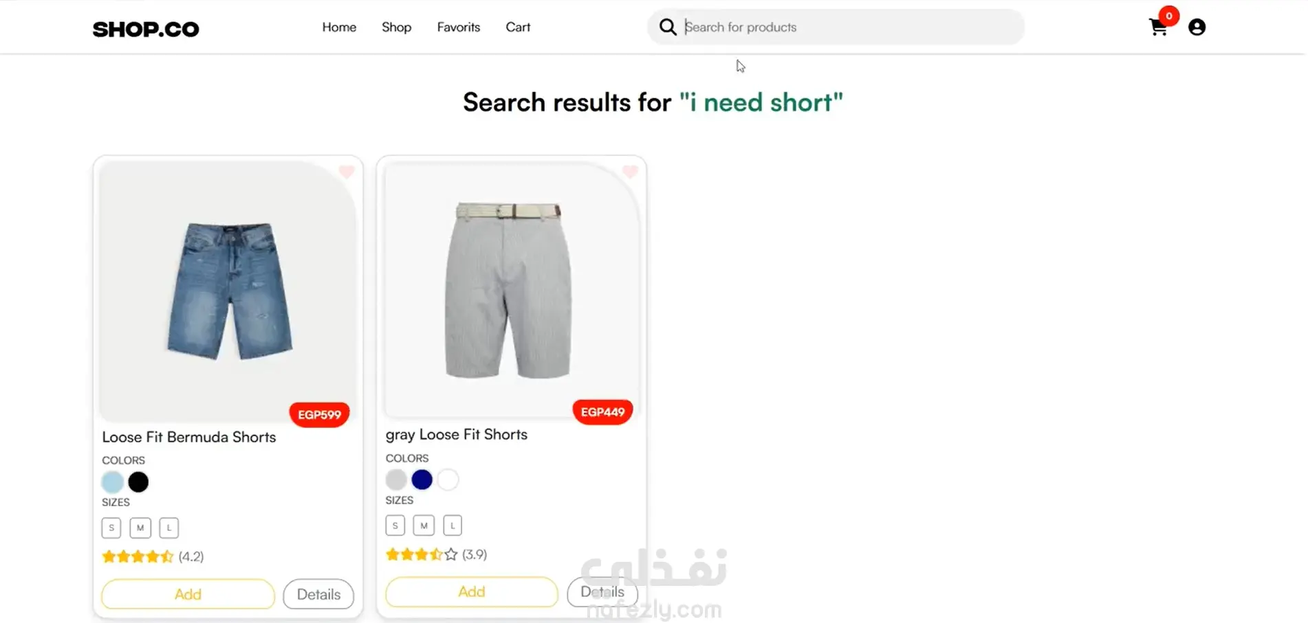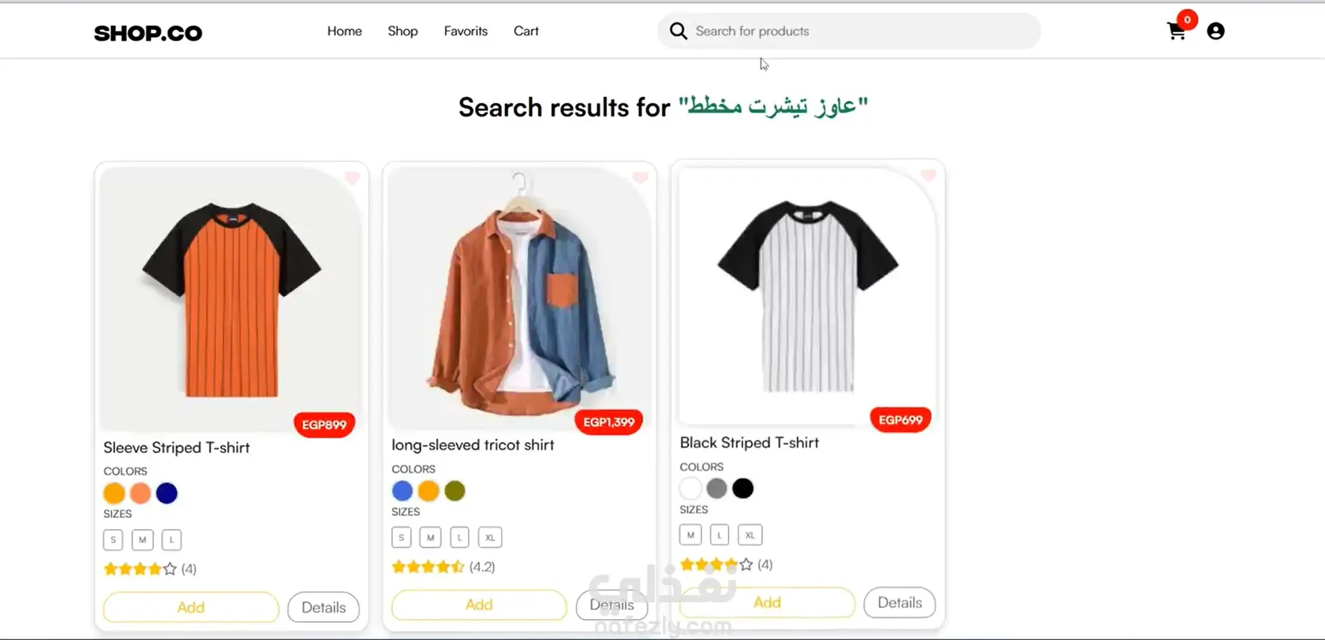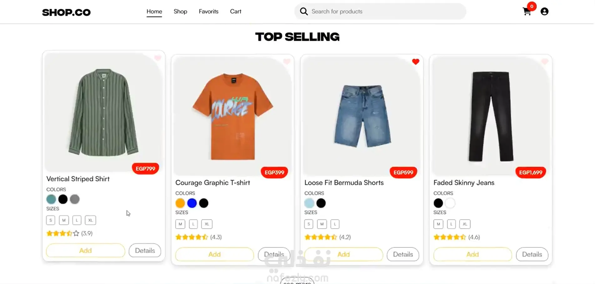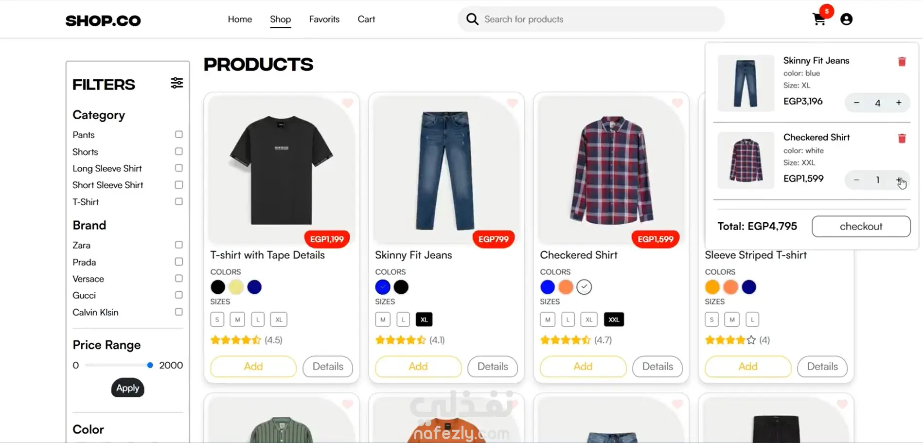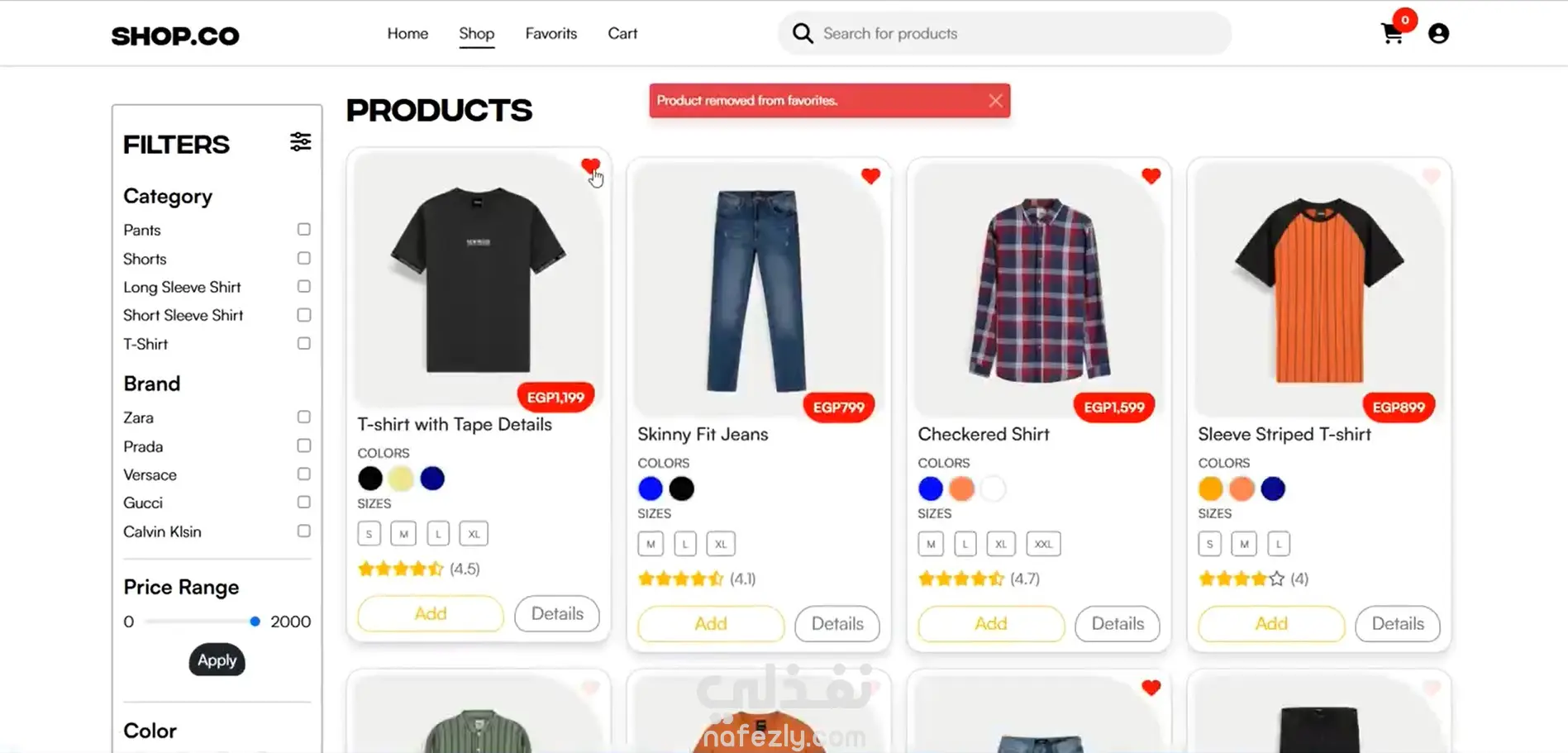 نظام لبيع الملابس يشتمل على فلاتر متقدمة حسب: الفئة (CATEGORY)، المقاس (SIZE)، اللون (COLOR)، والسعر (PRICE). يتضمن النظام أيضًا بحثًا ذكيًا مدعومًا بالذكاء الاصطناعي، وإمكانية إضافة المنتجات إلى المفضلة (Add to Favorite) أو سلة التسوق (Add to Cart)، وعرض تفاصيل منتج واحد، وعرض جميع المنتجات ضمن فئة معينة، بالإضافة إلى إتمام عملية الشراء (Make Order)."