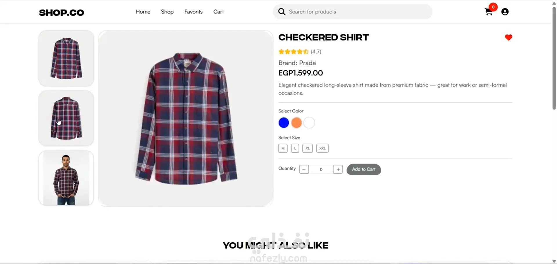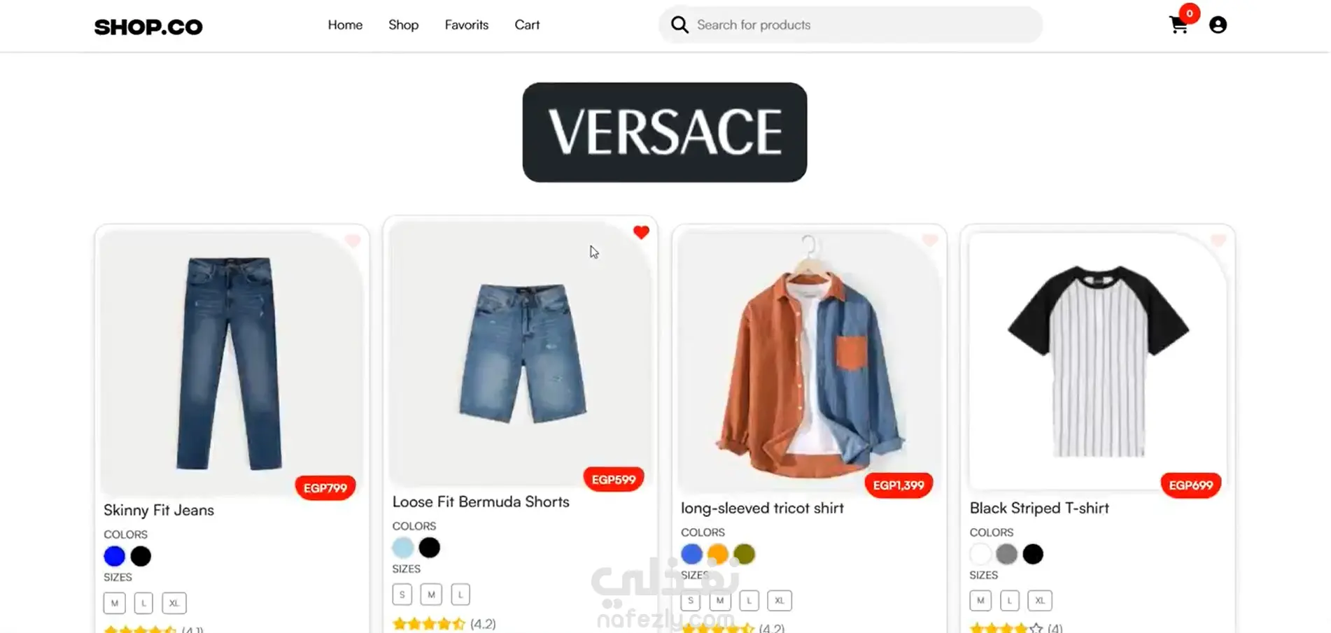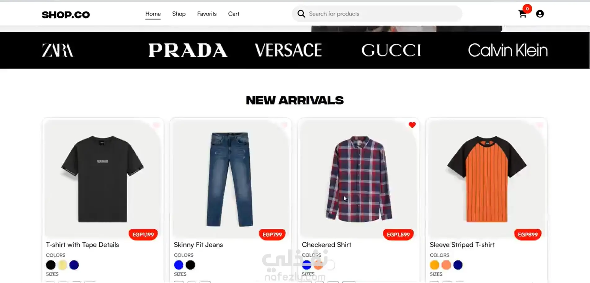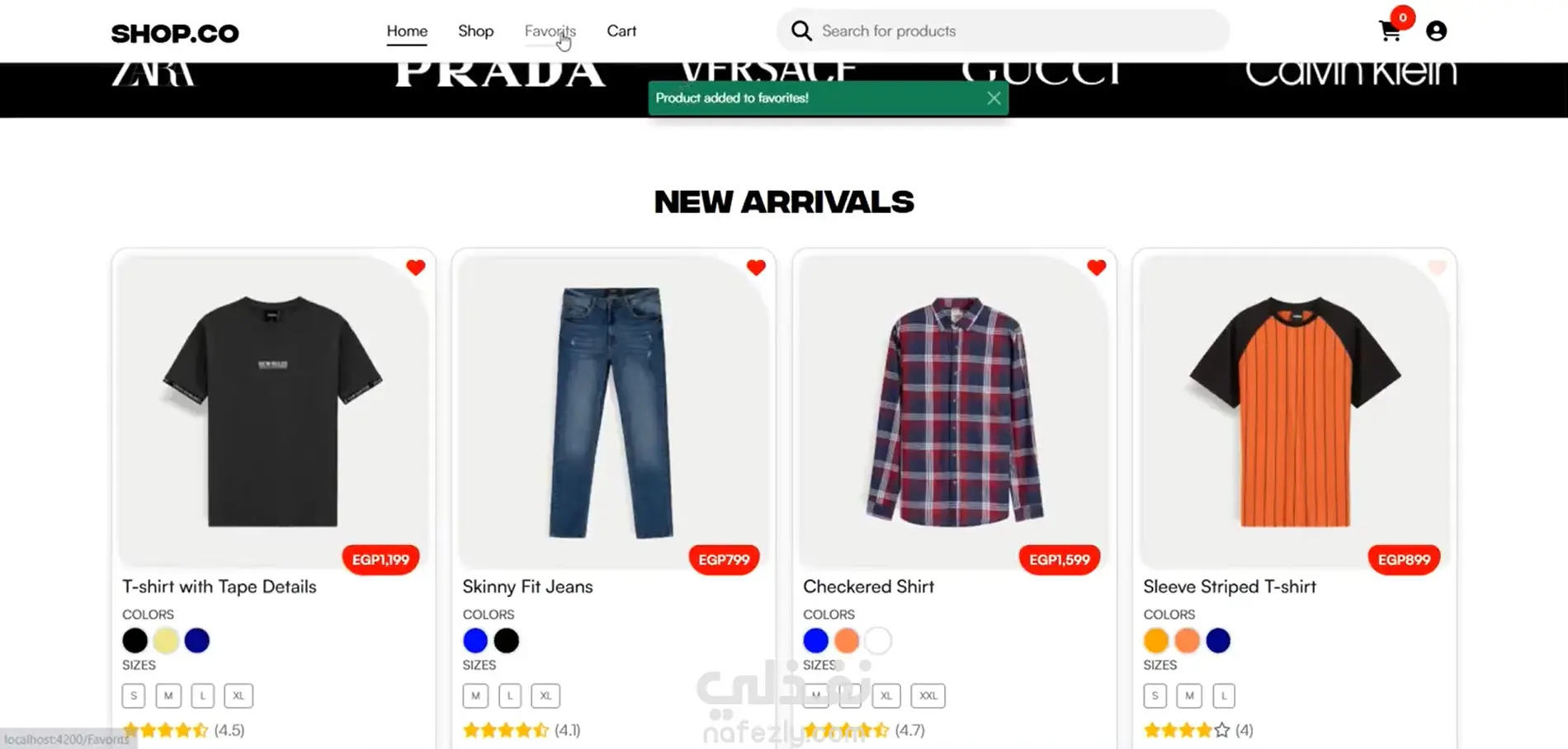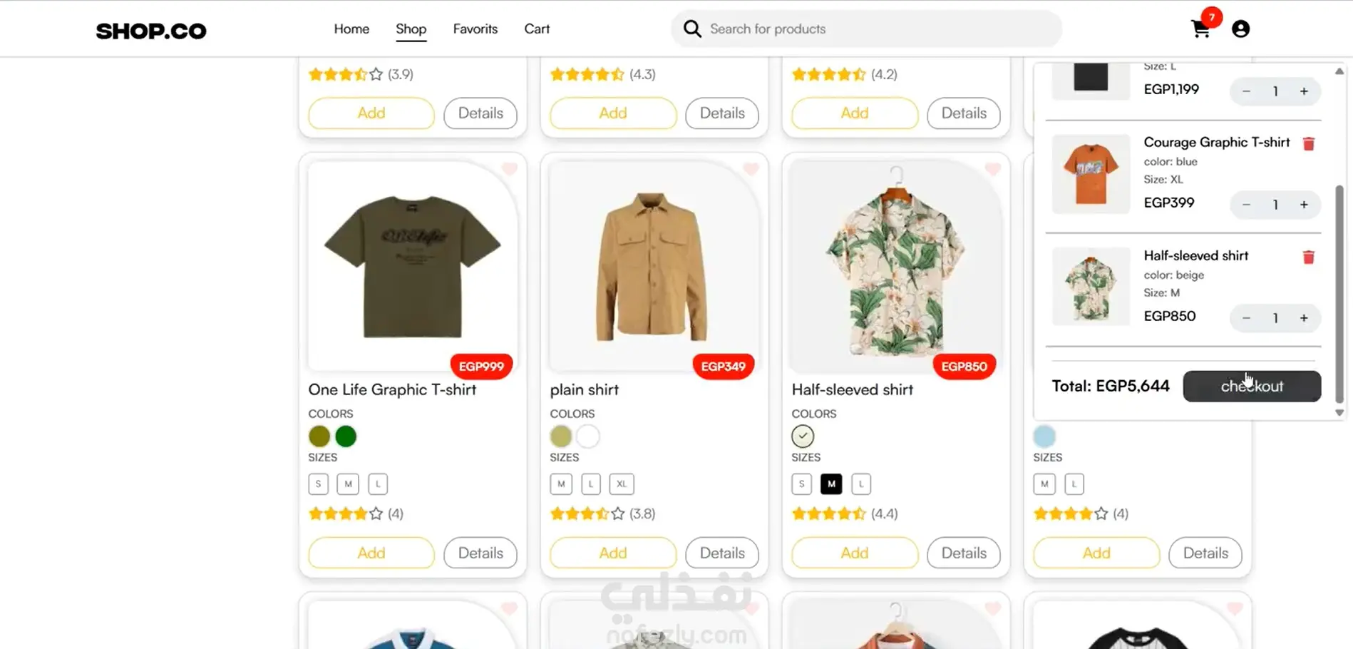 نظام لبيع الملابس يشتمل على فلاتر متقدمة حسب: الفئة (CATEGORY)، المقاس (SIZE)، اللون (COLOR)، والسعر (PRICE). يتضمن النظام أيضًا بحثًا ذكيًا مدعومًا بالذكاء الاصطناعي، وإمكانية إضافة المنتجات إلى المفضلة (Add to Favorite) أو سلة التسوق (Add to Cart)، وعرض تفاصيل منتج واحد، وعرض جميع المنتجات ضمن فئة معينة، بالإضافة إلى إتمام عملية الشراء (Make Order)."