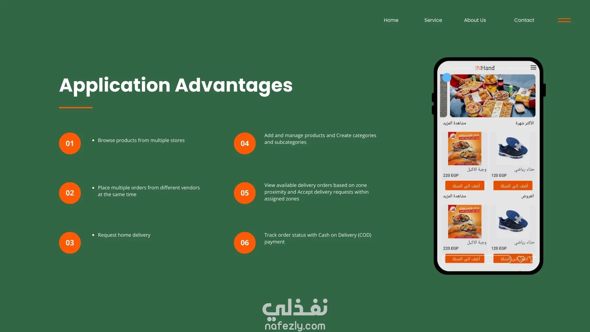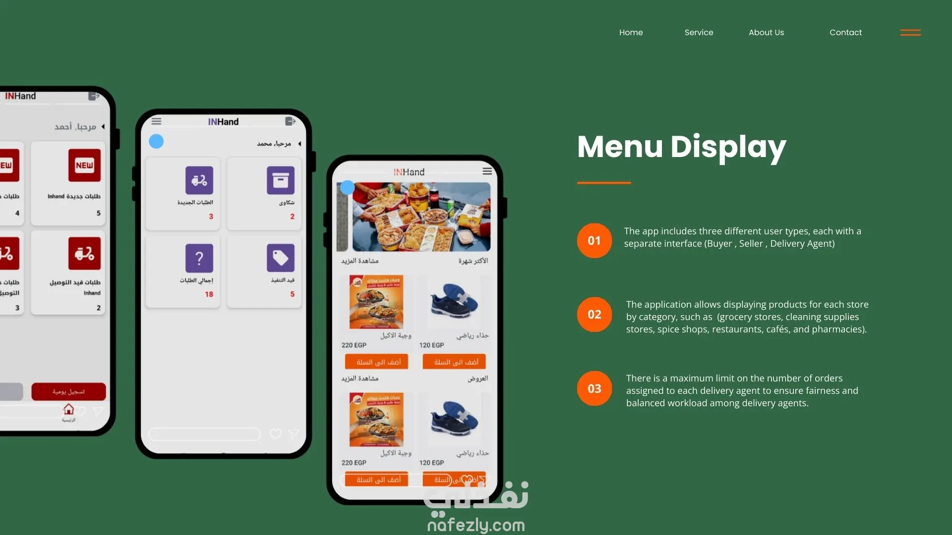 تطبيق كامل وشامل لكل ما ياحتاجه المشتري او البائع او عامل التوصيل . امكانية عرض المنتجات الخاصة بكل المحالات بانواعها مثل ( بقالة , محل منظفات , محل عطارة , مطعم , كافيه او صيدلية) امكانية تسجيل مندوبين التوصيل بالتطبيق. التطبيق يحتوي علي ثلاث انواع من المستخدمين بثلاث واجهات مختلفة (المشتري , البائع , عامل التوصيل ). امكانية الدفع عند الاستلام او الدفع عن طريق وسائل الدفع الالكترونية. وجود حد اقصي لعدد الطلبات التي يرسلها عامل التوصيل لتحقيق التكافؤ بين عمال التوصيل . وجود نظام اشعارات فورية لكل المستخدمين.