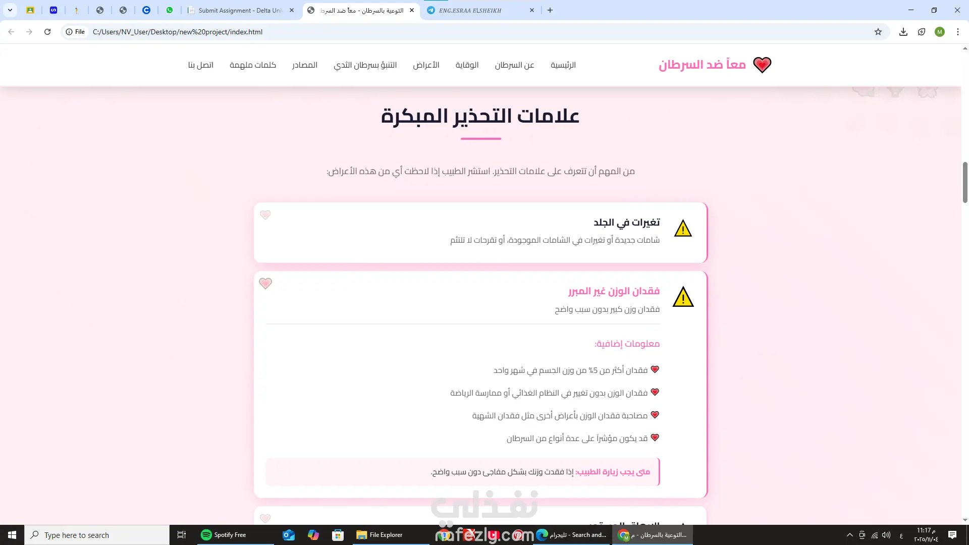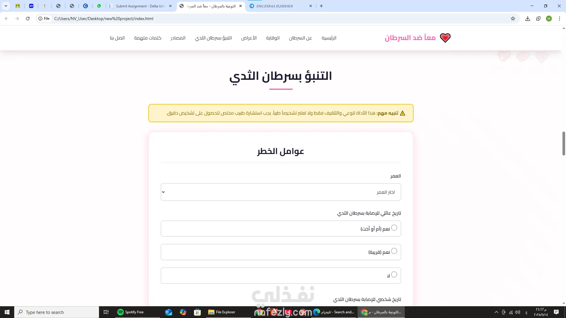 لقمت بتنفيذ العديد من المشاريع وهذا المشروع لمرضي السرطان فمت بتصميم موقع الكتروني لمساعده مرضي السرطان ف التجنب المرضي و اختبار لمعرفه نسبه الاصابه بيه و خدامات تقدم للمرضي و خدمات الاطباء تقدمها و صفحه لرفع صوره الاشعه للتنبؤ بمرضي و تمربط هذه الصفحه بموديل ذكاء اصطناعي و صفحه عبارات ملهمه و صفحه للتواصل فهذا موقع كامل للدعم لمهم