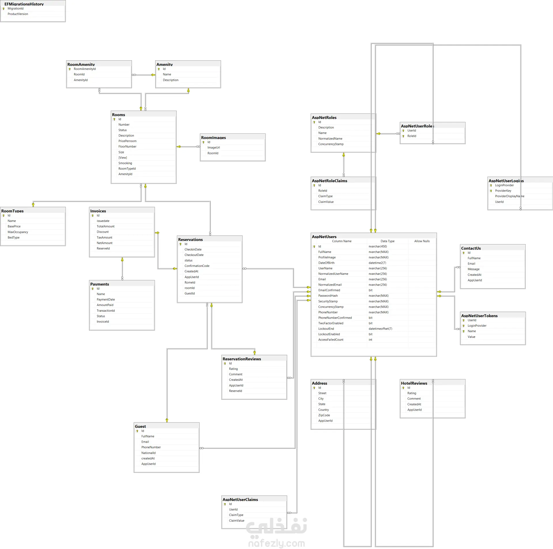 قمت بتصميم وتطوير قاعدة بيانات لإدارة حجوزات الفنادق (Hotel Reservation System) يشمل إدارة الغرف، الحجوزات، النزلاء، المدفوعات، المراجعات، بالإضافة إلى دمج نظام الهوية Identity من ASP.NET Core للتعامل مع المستخدمين والصلاحيات. تصميم قاعدة البيانات (ERD Design) صممت قاعدة بيانات احترافية تضم جميع الكيانات الأساسية في نظام الحجز، مع تحديد العلاقات (1-to-many / many-to-many) وربط الجداول بالمفاتيح الأساسية والخارجية. وتشمل: Rooms – بيانات الغرف، النوع، السعر، حالتها. RoomTypes – تصنيف الغرف. Amenities & RoomAmenities – المميزات وربطها بالغرف. RoomImages – صور الغرف. Reservations – تفاصيل الحجز. Invoices – الفواتير والدفع. Payments – أنواع وعمليات الدفع. Guests – بيانات النزلاء. Reviews – تقييمات الغرف والفنادق. Addresses – العناوين المستخدمة للحسابات. دمج كامل مع جداول ASP.NET Identity مثل Roles, UserRoles, Claims, Tokens… إلخ.