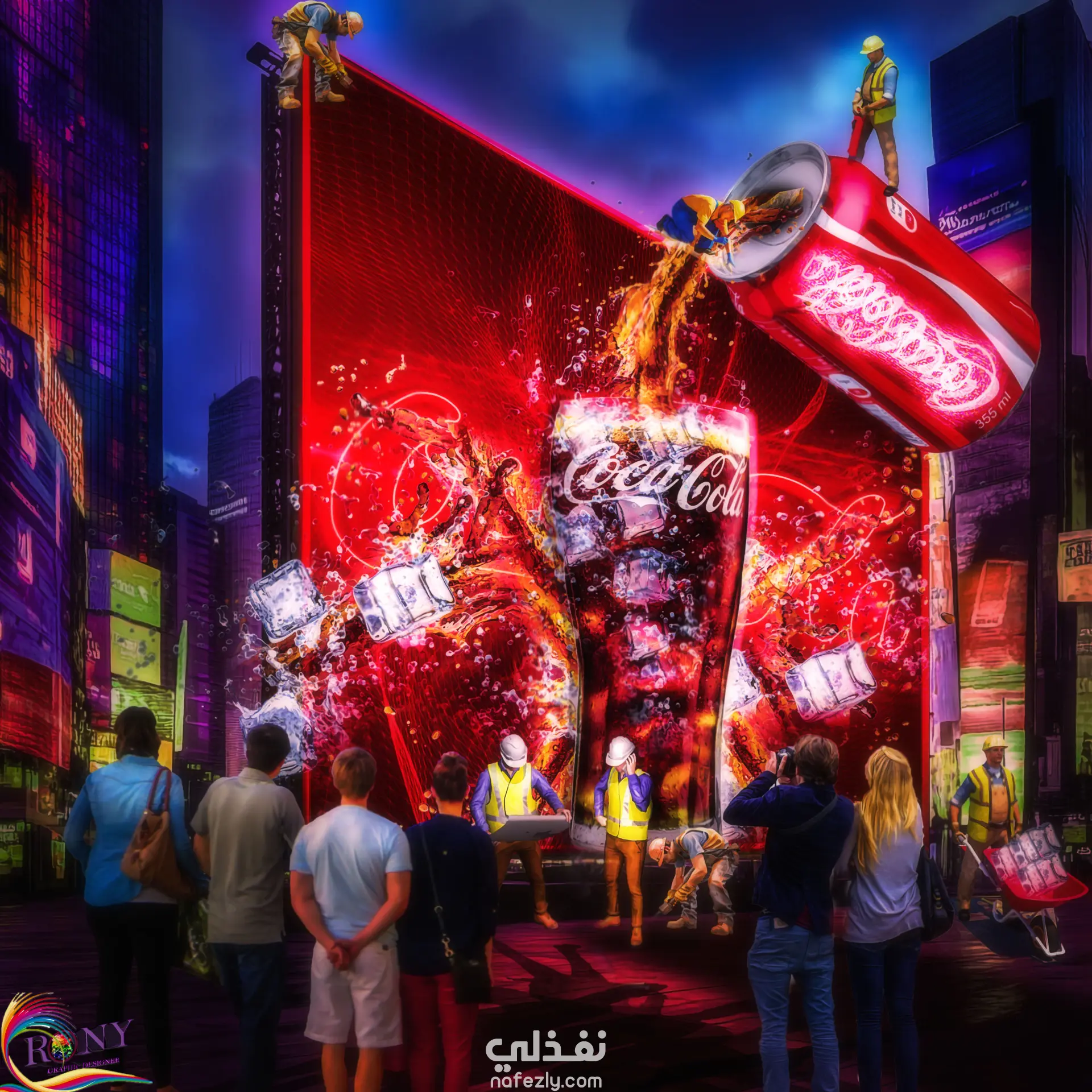 اعلان عبارة لوحة ثلاثية ابعاد لمجسم كبير عن مشروب كوكاكولا في وسط مدينة مع مشاهدة وانبهار الماريين