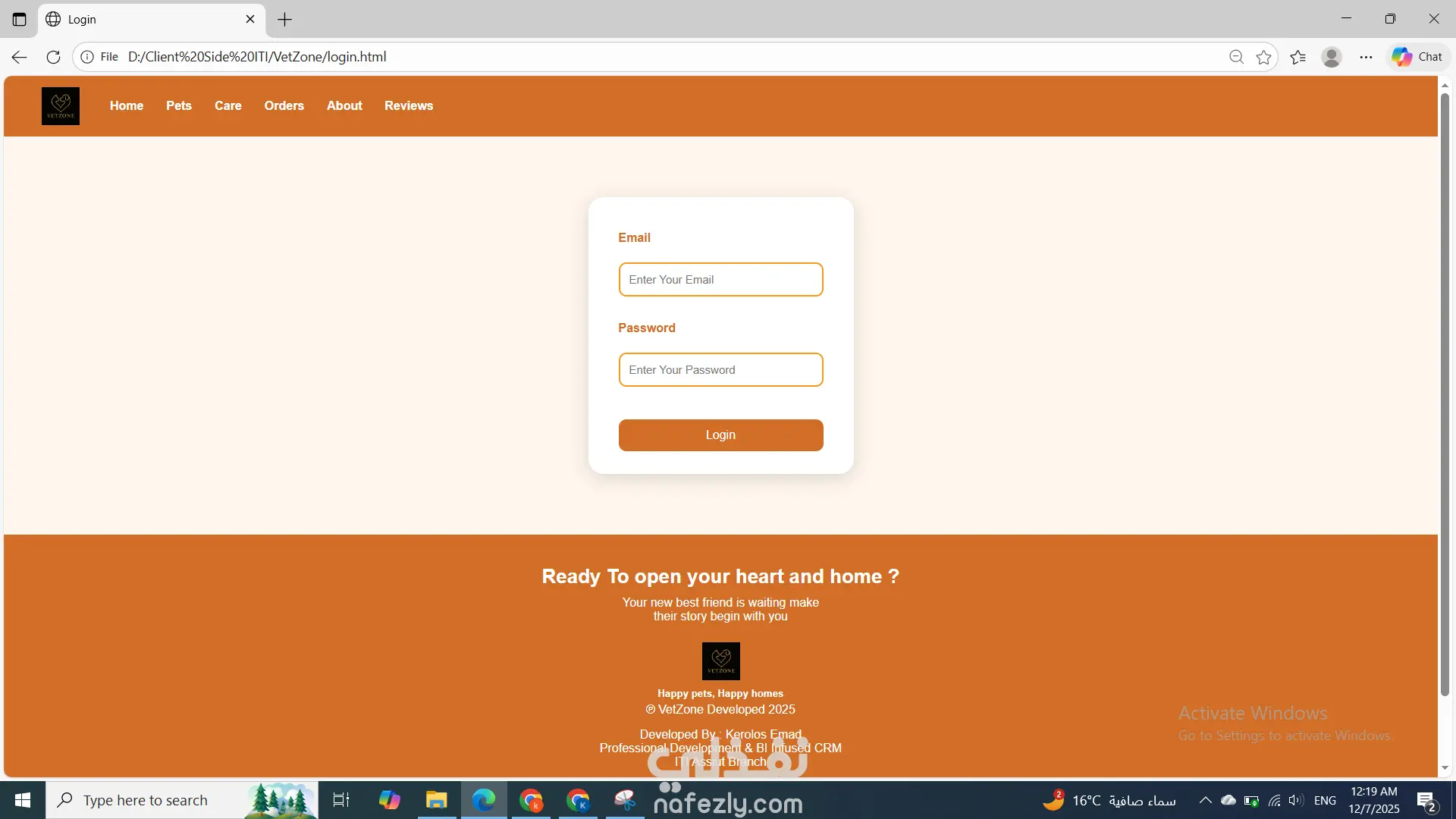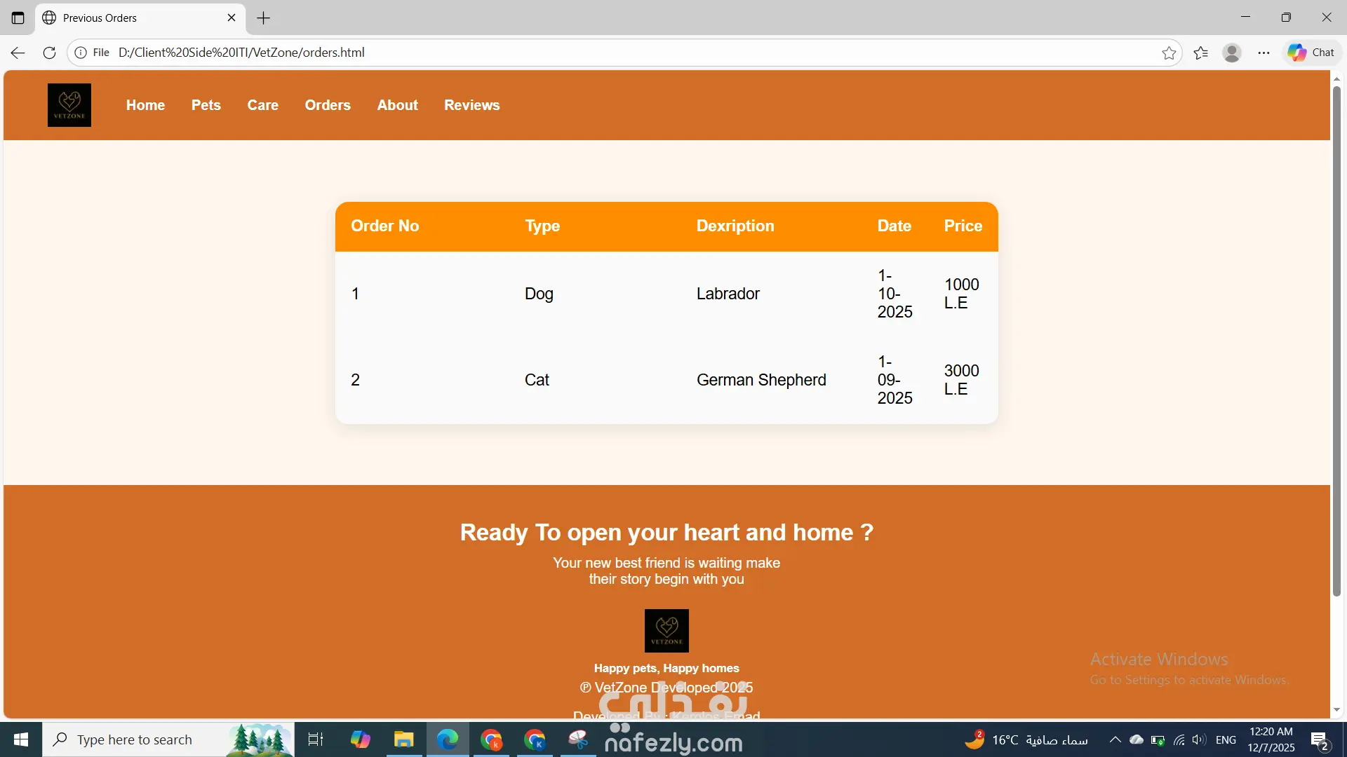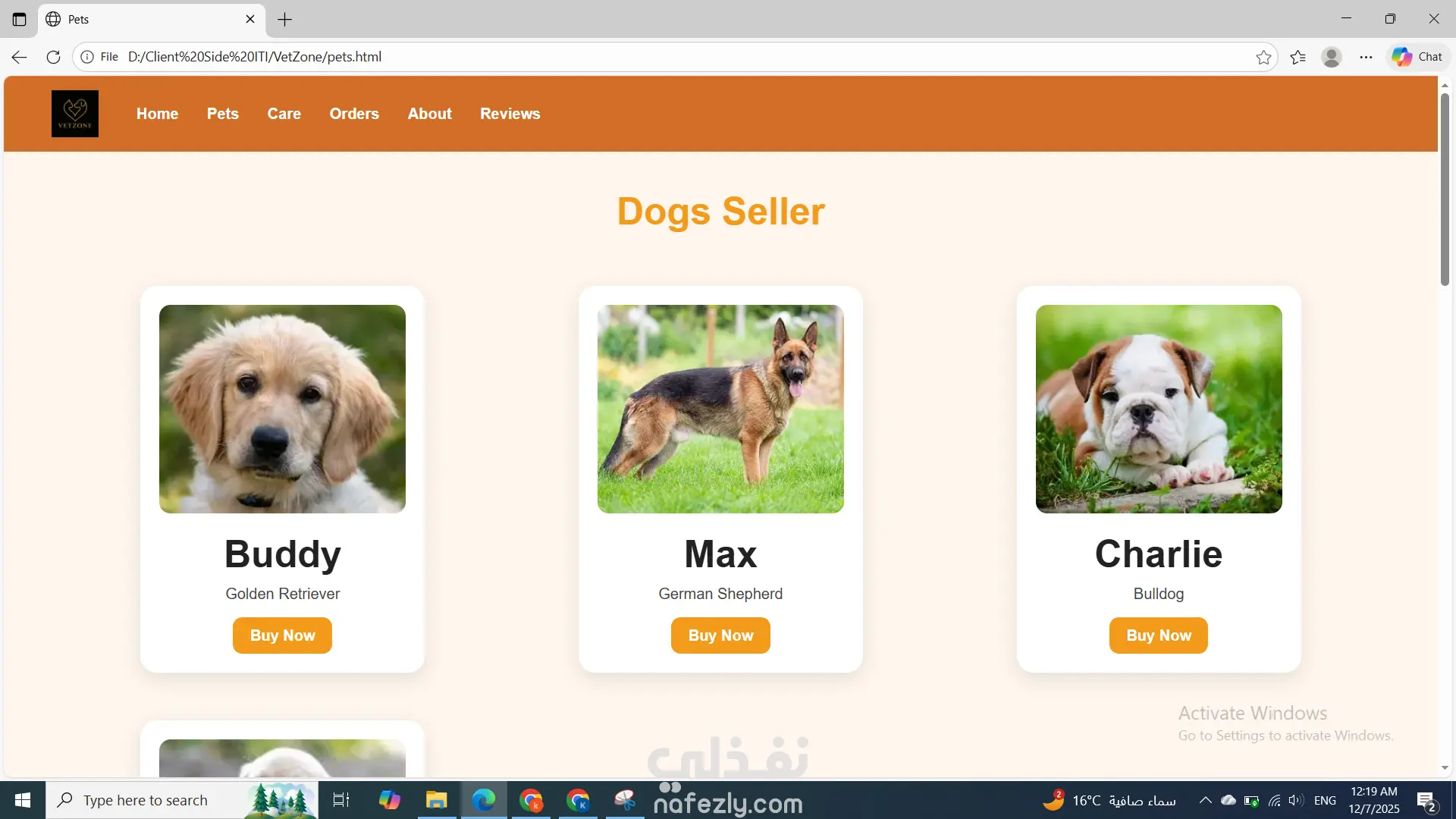 تطوير موقع كامل لـ VetZone باستخدام HTML وCSS فقط، يتكوّن من عدة صفحات متناسقة تشمل الصفحة الرئيسية، وواجهة Pets لعرض الحيوانات المتاحة، وصفحة Buy لتفاصيل الشراء، وصفحة Care لتقديم طلبات العناية، بالإضافة إلى صفحة Reviews وAbout. جميع الصفحات تحتوي على هيدر وفوتر ثابتين وتصميم موحّد بألوان مناسبة للعلامة. تم تنظيم الموقع بشكل بسيط وسهل التصفح دون استخدام JavaScript، مع تنسيق احترافي للنماذج، الجداول، والعناصر البصرية ليظهر الموقع بشكل جذاب ومتجاوب وخفيف.