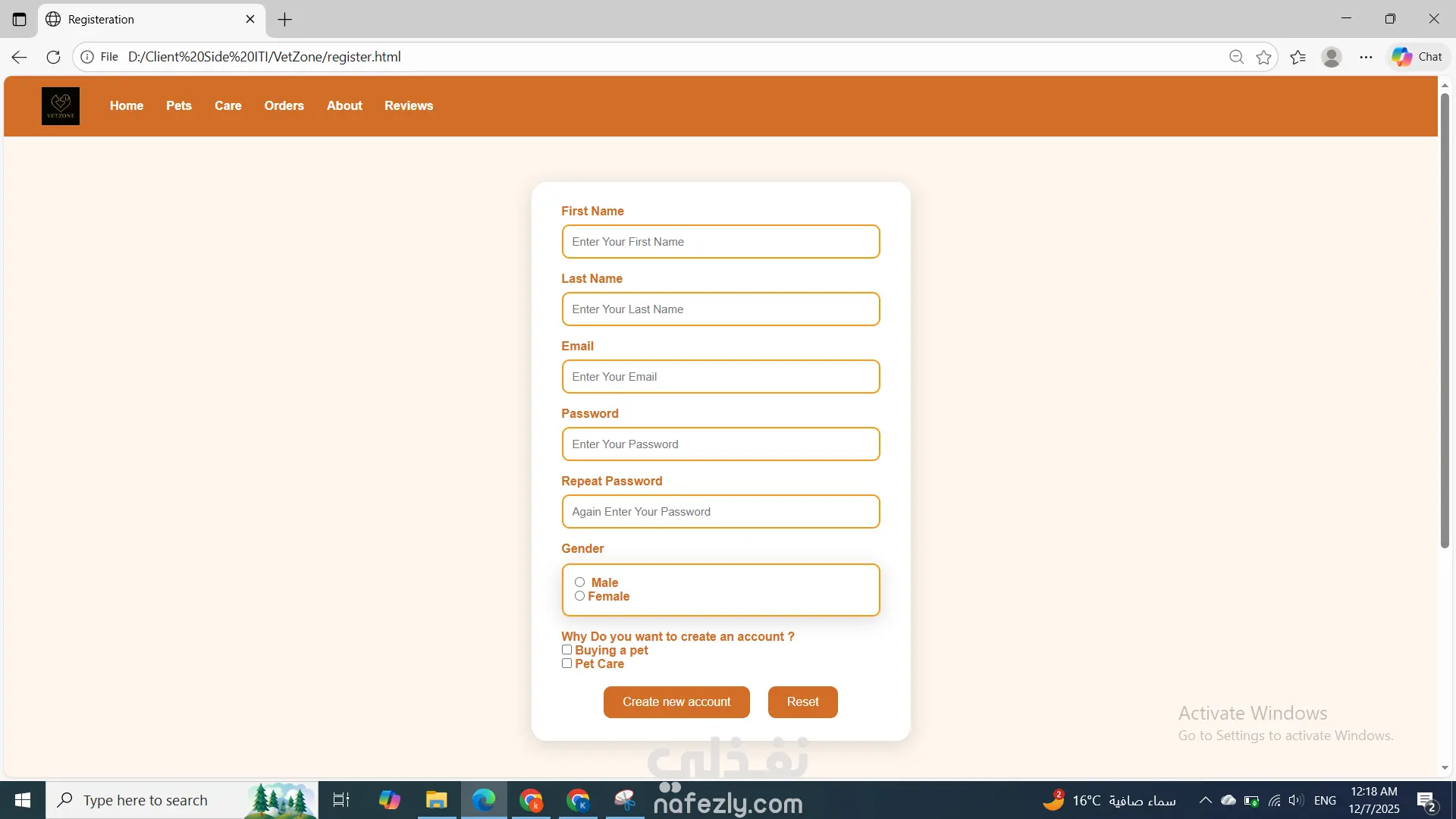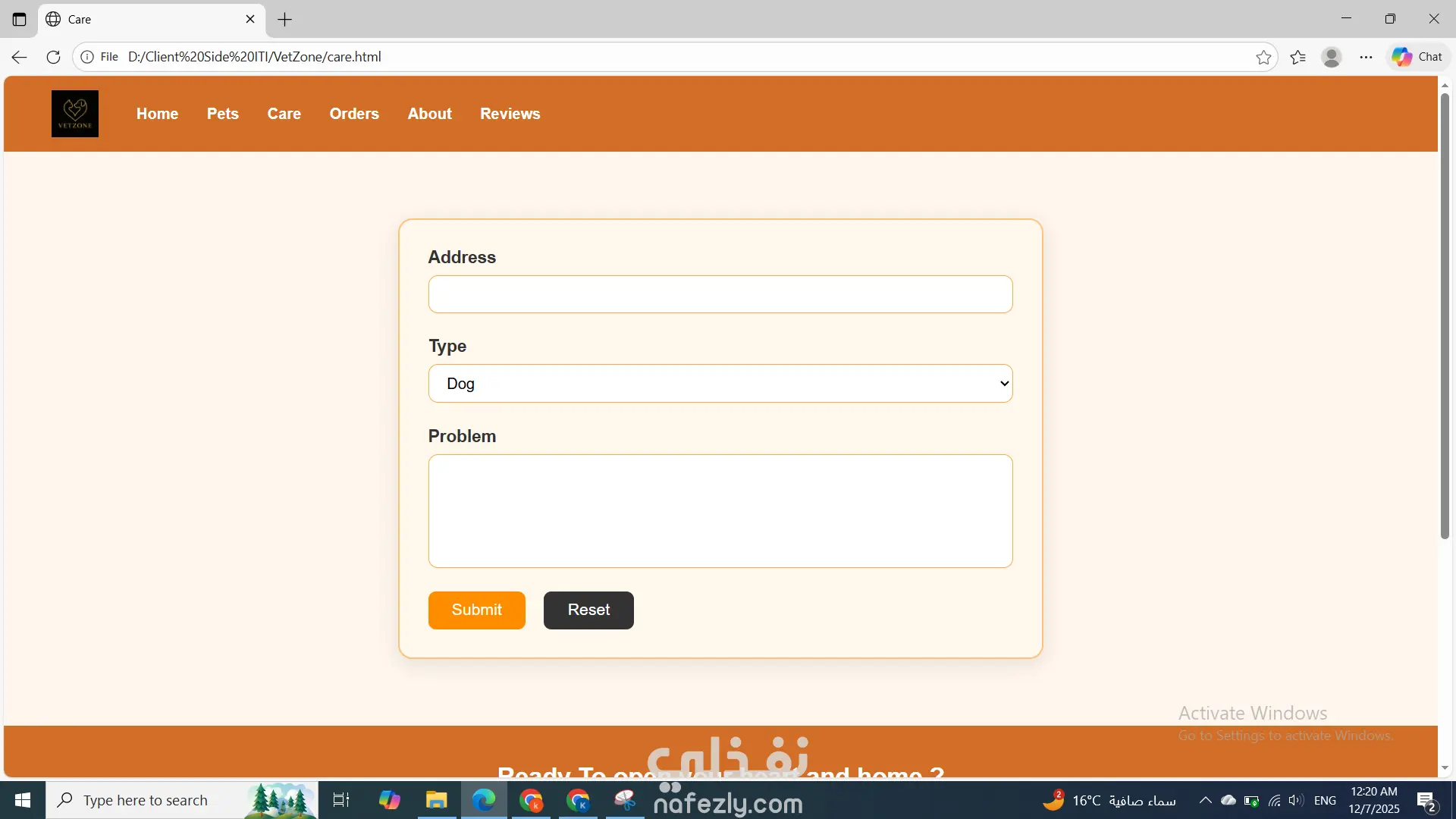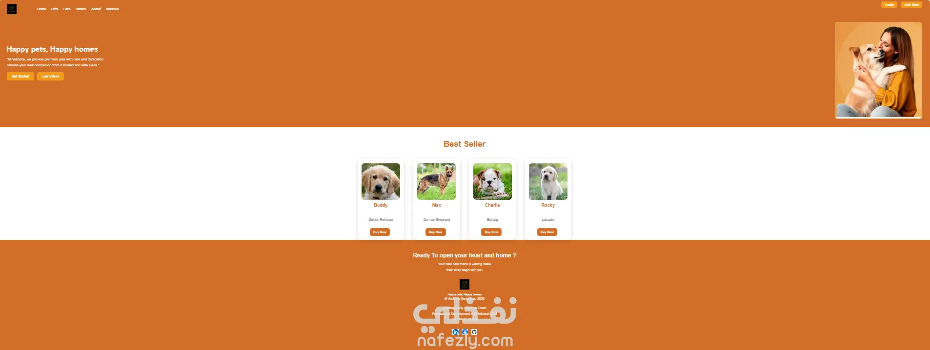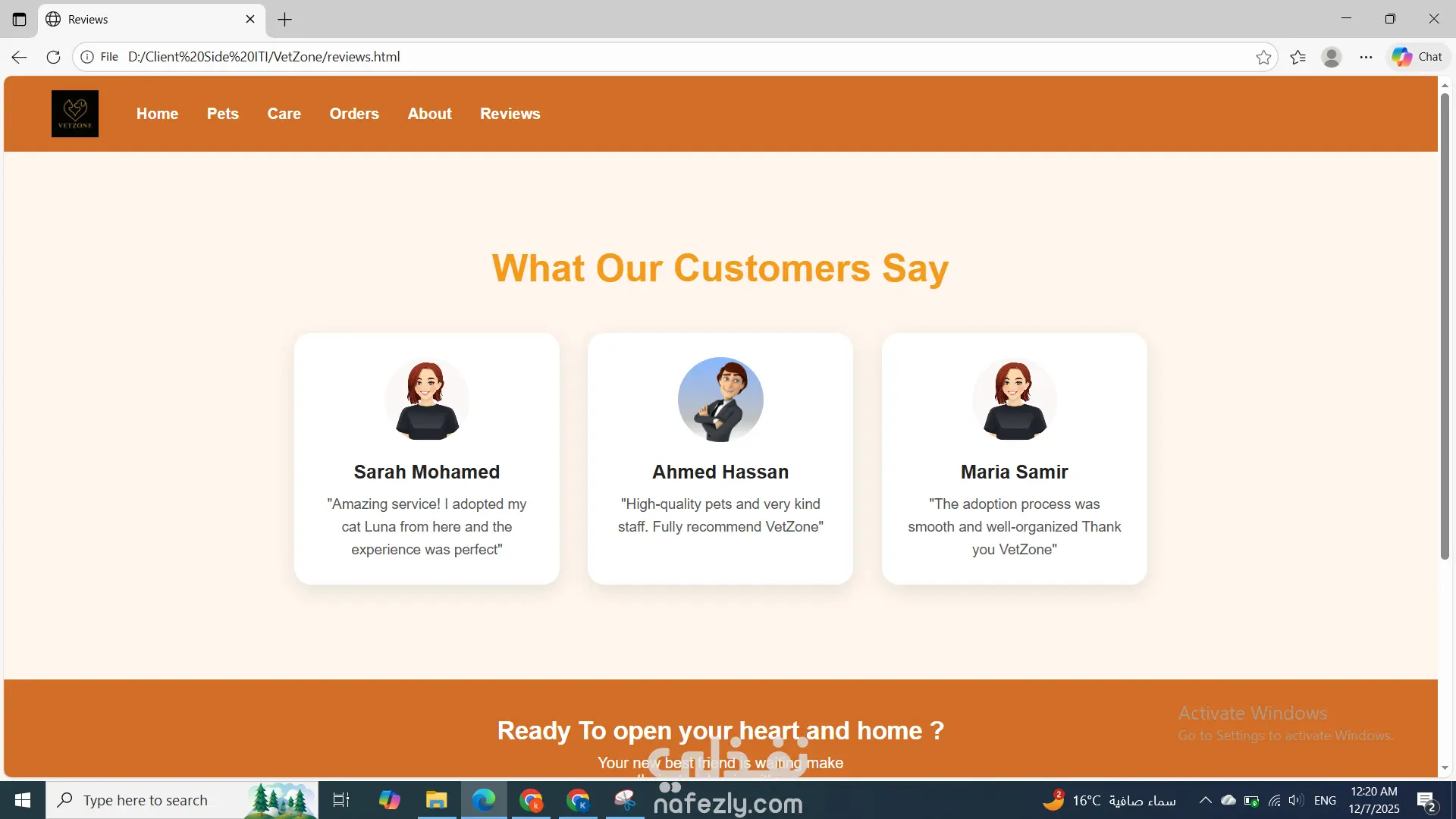 تطوير موقع كامل لـ VetZone باستخدام HTML وCSS فقط، يتكوّن من عدة صفحات متناسقة تشمل الصفحة الرئيسية، وواجهة Pets لعرض الحيوانات المتاحة، وصفحة Buy لتفاصيل الشراء، وصفحة Care لتقديم طلبات العناية، بالإضافة إلى صفحة Reviews وAbout. جميع الصفحات تحتوي على هيدر وفوتر ثابتين وتصميم موحّد بألوان مناسبة للعلامة. تم تنظيم الموقع بشكل بسيط وسهل التصفح دون استخدام JavaScript، مع تنسيق احترافي للنماذج، الجداول، والعناصر البصرية ليظهر الموقع بشكل جذاب ومتجاوب وخفيف.
