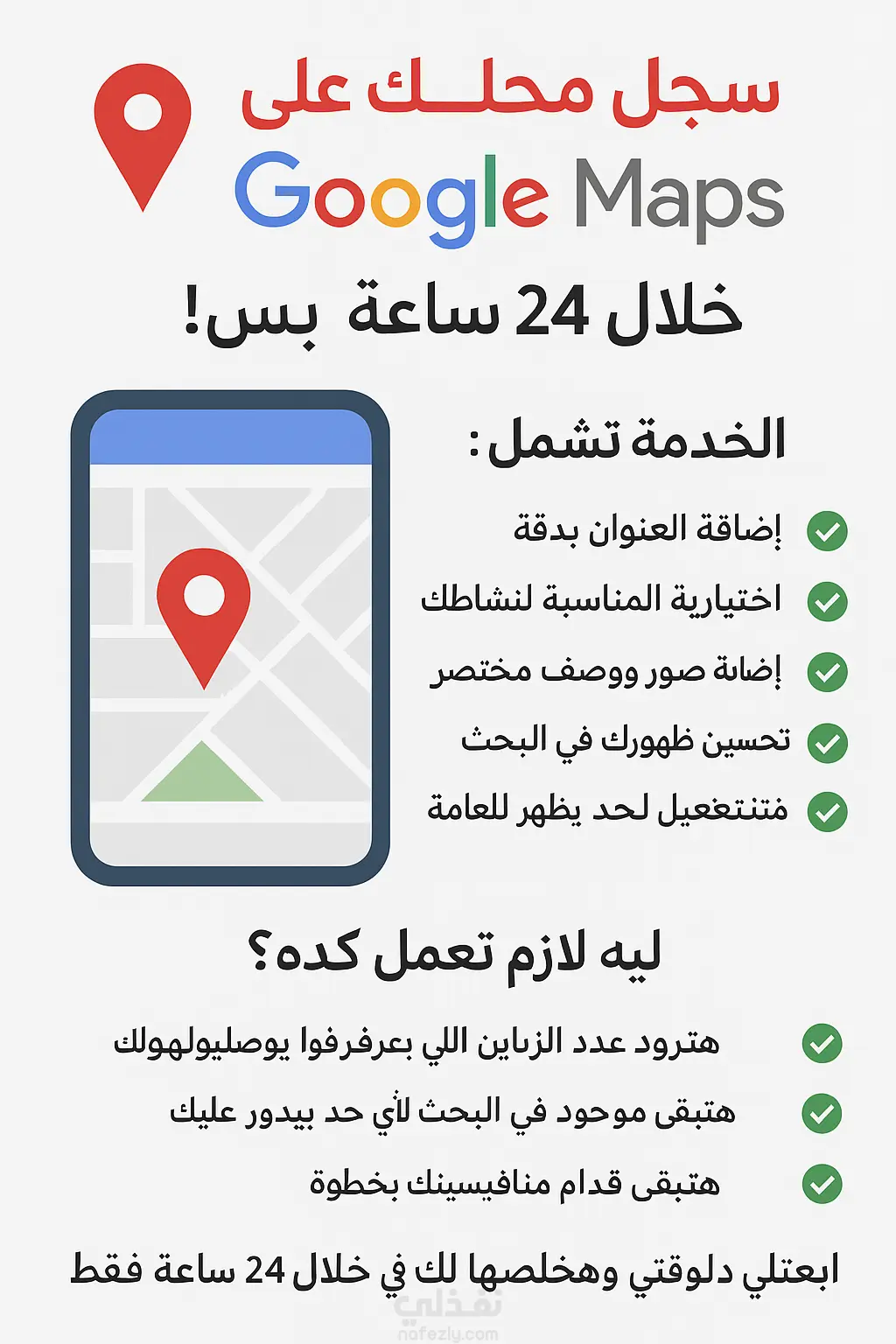 من خلال خبرتي في تثبيت العناوين على خرائط قوقل، سأعمل على التأكد من أن معلومات عملك دقيقة ومحدثة، بما في ذلك اسم الشركة، عنوان الموقع، ورقم الهاتف.