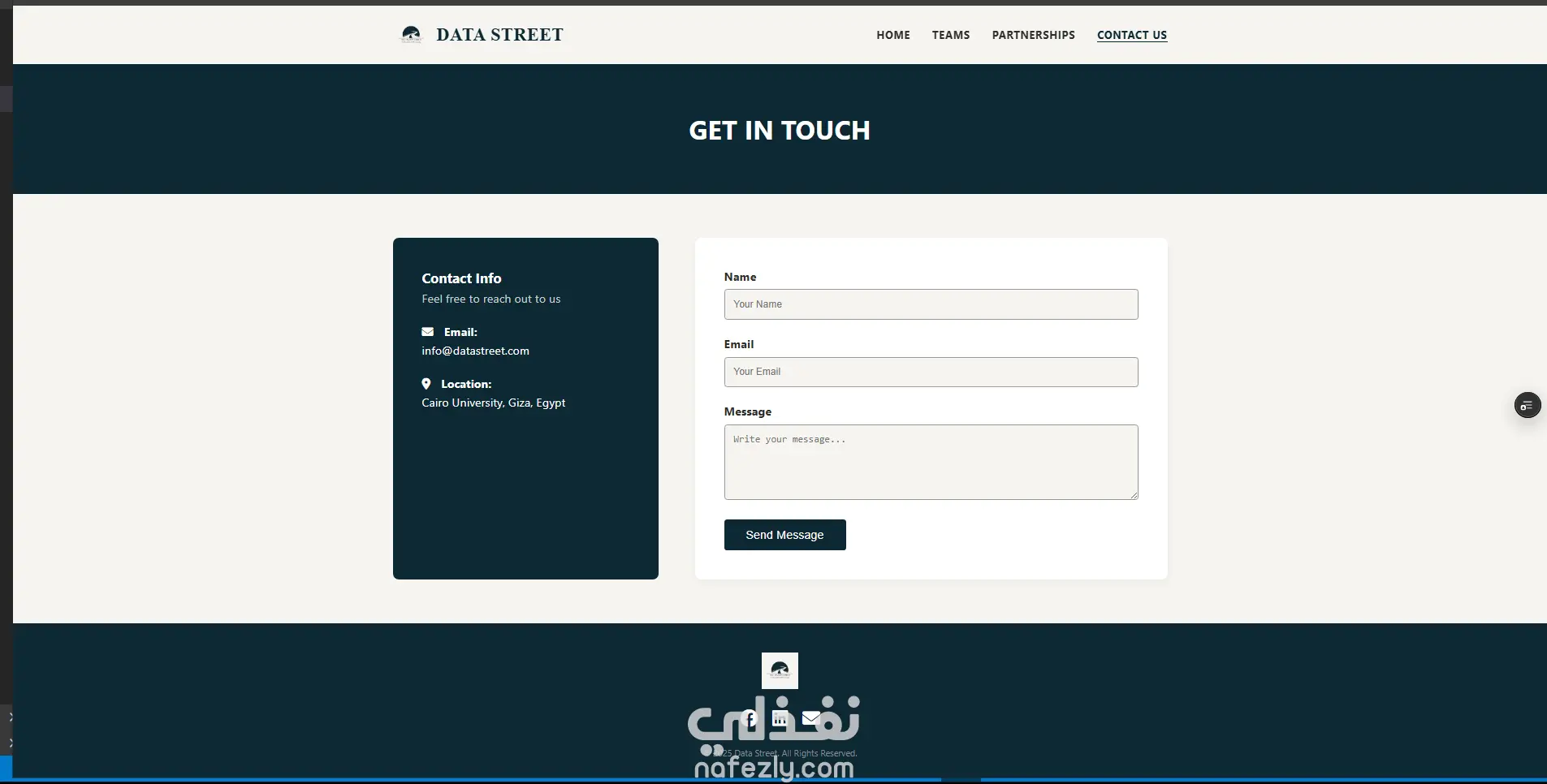 قمت بتصميم وتطوير الموقع الرسمي لنشاط "Data Street" الطلابي، وهو نشاط يهدف إلى توفير منح دراسية وفرص تعليمية للشباب في مجالات علوم البيانات والبرمجة. الهدف من الموقع هو بناء واجهة احترافية تعكس هوية النشاط وتسهل تواصل الطلاب والشركاء معنا.