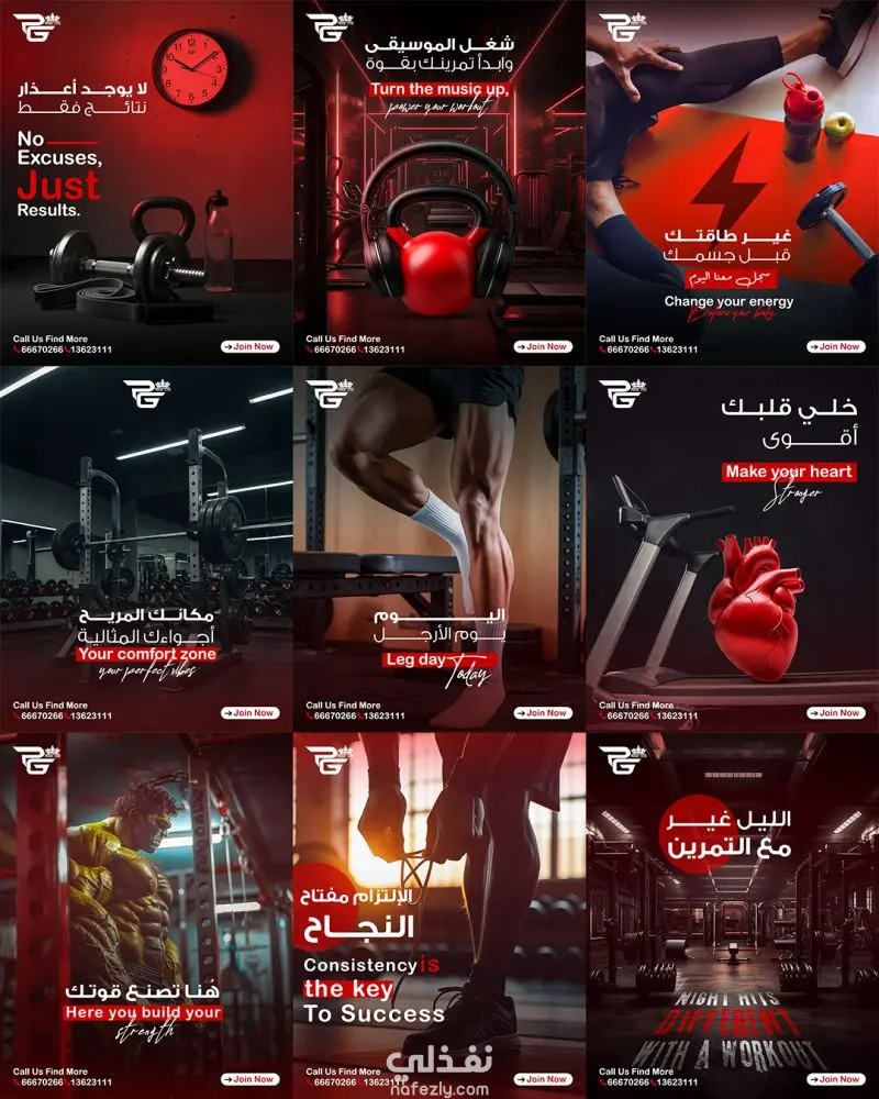 الحملة تضم مجموعة متنوعة من التصاميم تشمل: بوستات عروض الافتتاح، بوستات تعريفية بالخدمات، محتوى تفاعلي، وبوستات بصور المنتجات الرياضية.