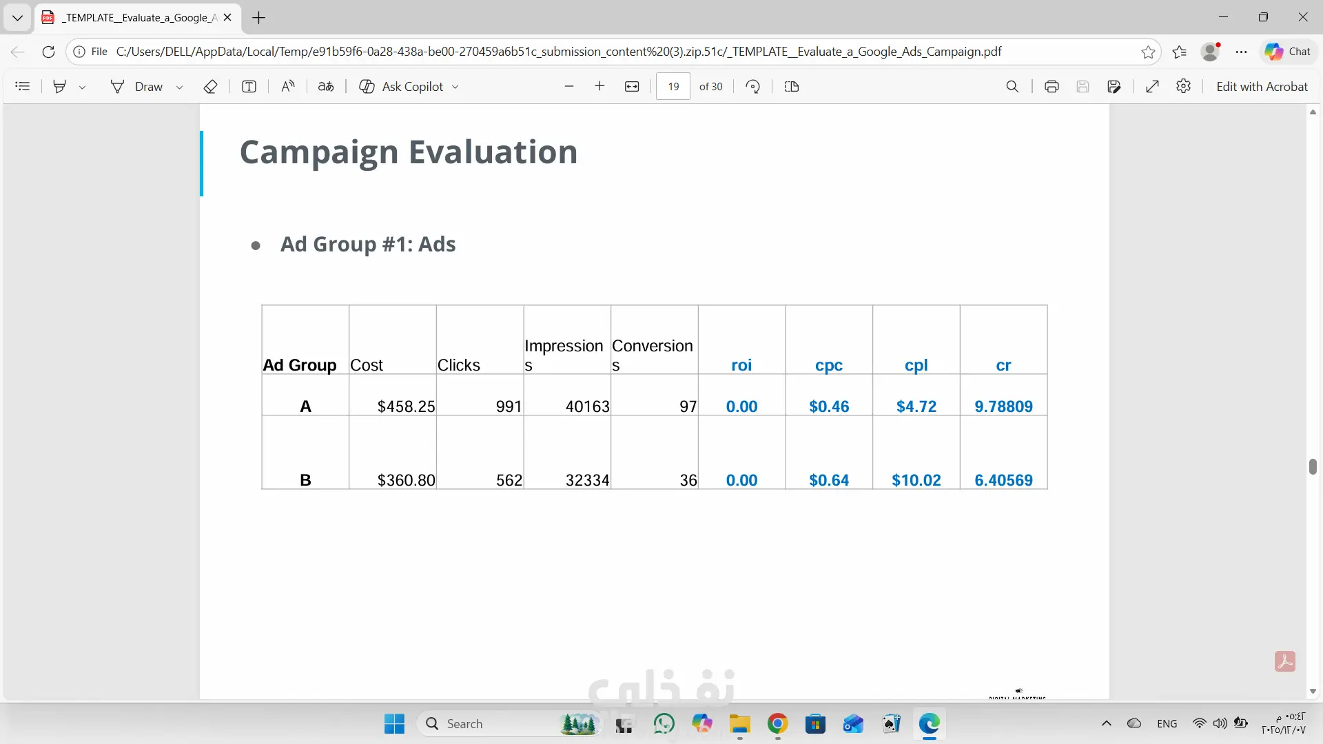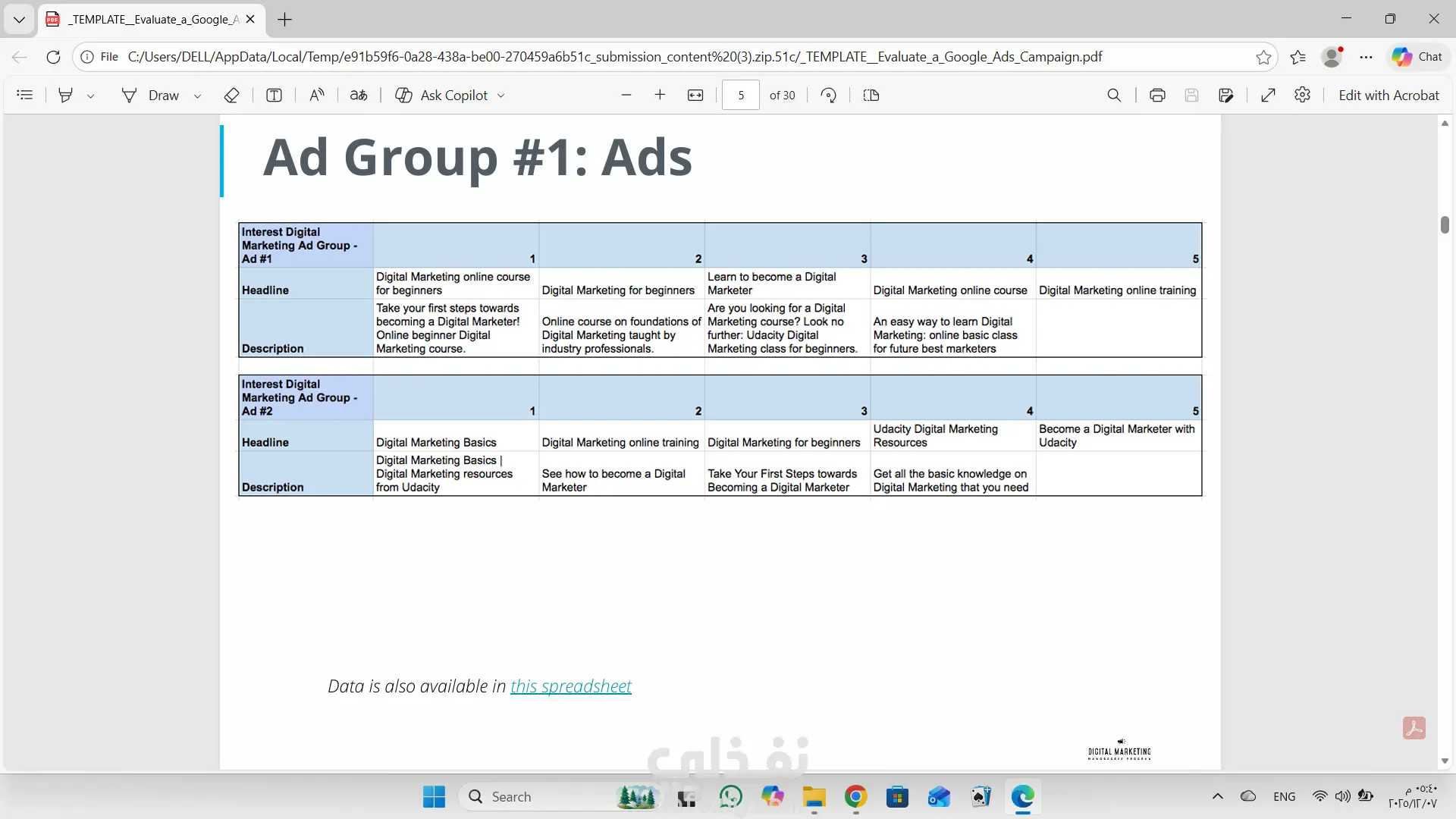 1. Campaign Approach ● Udacity has launched a campaign to advertise for the Digital Marketing Nanodegree Program ● The campaign is divided into two ad groups, one targeting customers in the Awareness stage and one targeting customers in the Interest stage ● Each ad group uses responsive search ads, with multiple options for the ad headline and description ● When users click on an ad, they are taken to the overview page for the Digital Marketing Nanodegree Program, where they can click a button to download the program syllabus. This conversion has an estimated value of $5. 2. Marketing Objective ● The campaign’s marketing objective is to gather at least 200 conversions (syllabus downloads), with a conversion rate of at least 10% Ad Groups