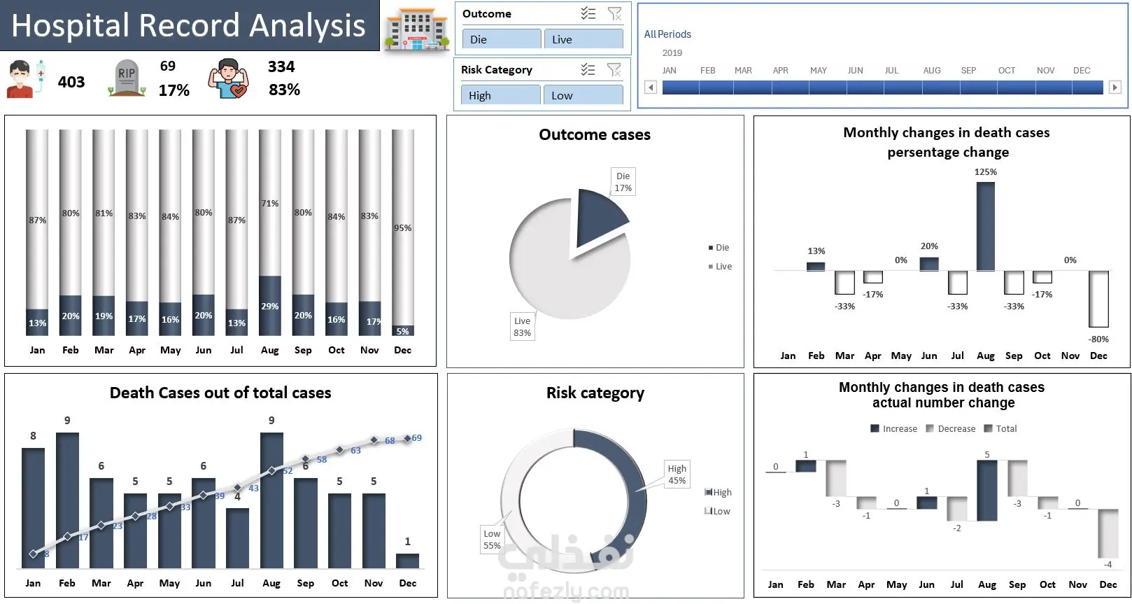 تحليل لبيانات مستشفى لمعرفة 1. ما هو أجمالى عدد الحالات 2. ما هو إجمالي عدد الوفيات 3. نسبة الوفيات و نسبة الحالات الناجية 4.نسبة الحالات الحرجة للحالات العادية 5. نسبة عدد الوفيات الشهرية بالنسبة لإجمالى عدد الزيارات 6. التغير في عدد الوفيات شهريا 7. نسبة التغير في عدد الوفيات شهريا 8. الإجمالى التراكمى لعدد الوفيات كل شهر 9. هل عدد الوفيات فى الحالات الحرجة أكبر منها عن الحالات العادية