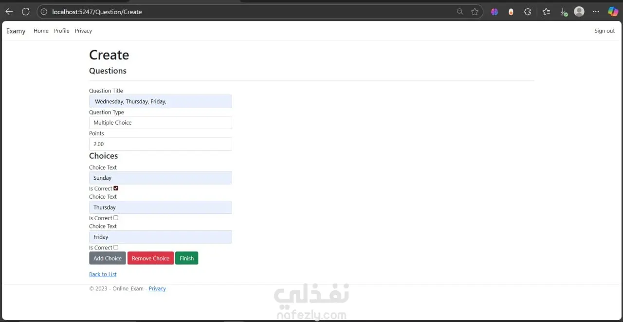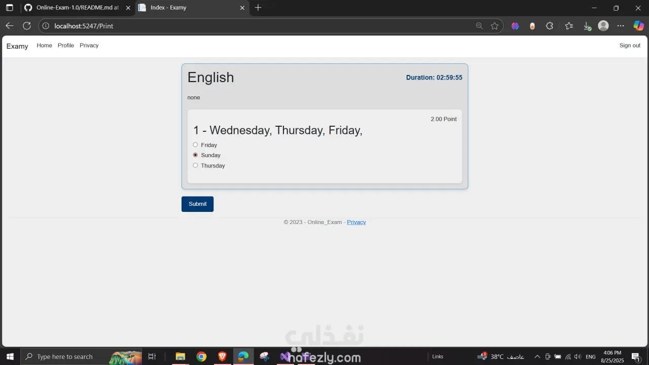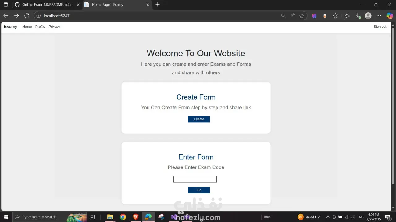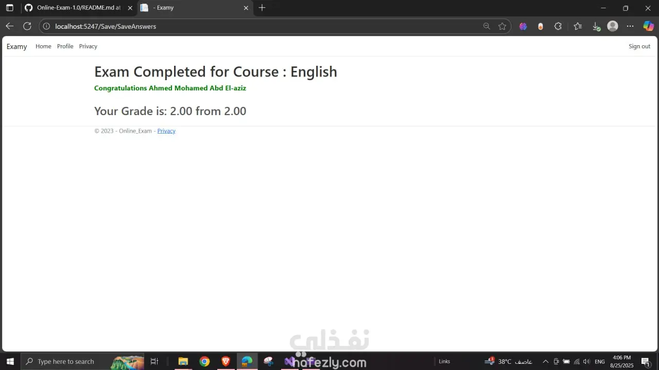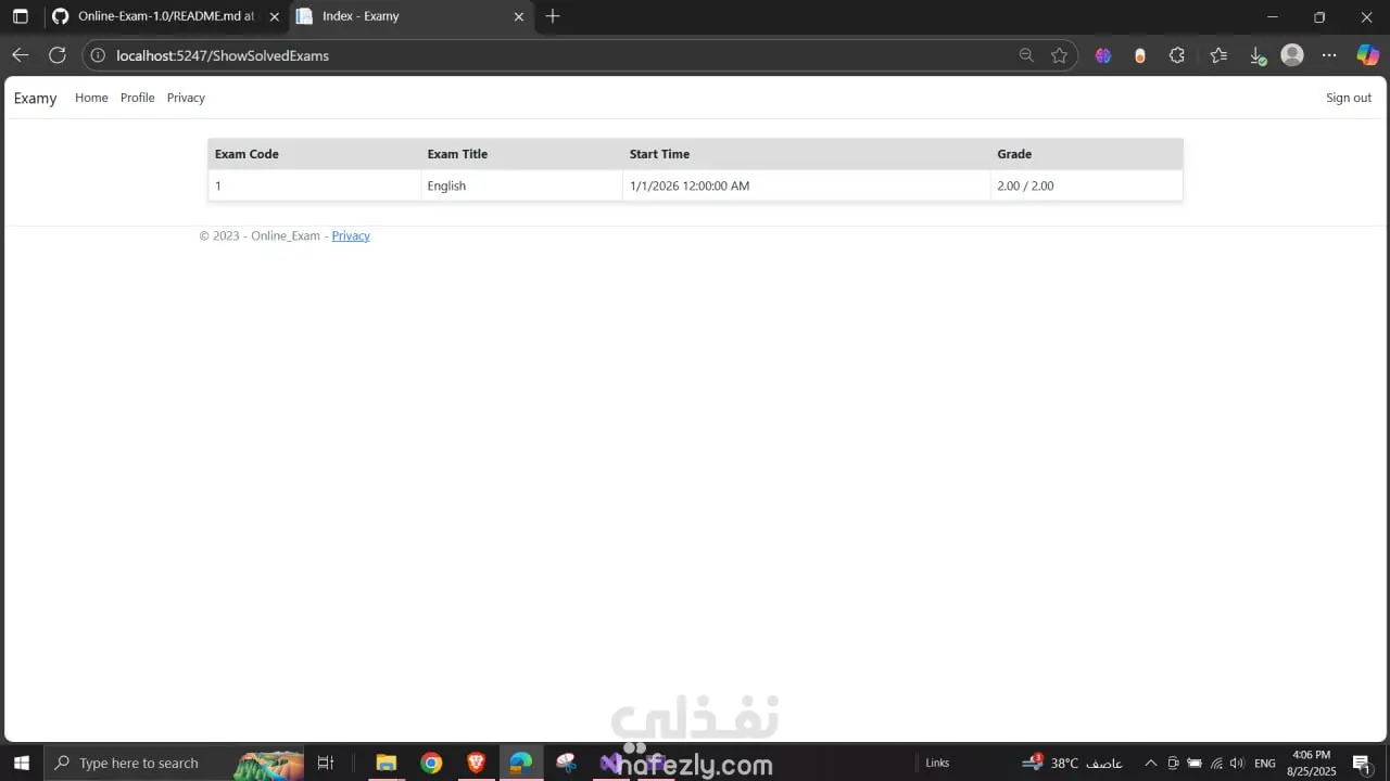 نظام امتحانات إلكتروني يتيح للمعلمين إنشاء اختبارات للطلاب ومتابعة نتائجهم بشكل فوري، مع توفير تجربة آمنة وسهلة الاستخدام. يساعد هذا النظام على توفير الوقت وتقليل الاعتماد على الورق. أبرز المميزات: إنشاء أسئلة متعددة الاختيارات وإدارتها بسهولة. تتبع نتائج الطلاب وتحليل الأداء. حماية من الغش والتعديل على الإجابات. التقنيات المستخدمة: ASP.NET Core, SQL Server, JavaScript