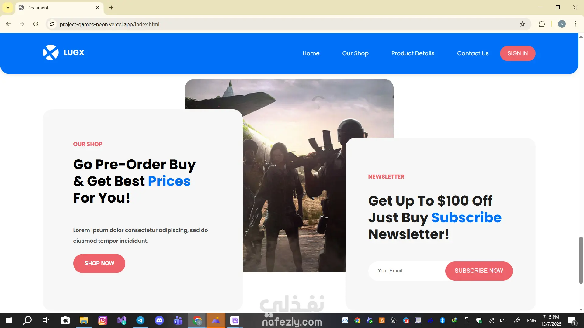 المشروع: موقع متجر ألعاب (Gaming Shop Website) التقنيات المستخدمة: HTML، CSS، JavaScript الوصف: تم تصميم وتطوير موقع Gaming Shop باستخدام HTML وCSS وJavaScript لعرض الألعاب والمنتجات بأسلوب عصري يناسب جمهور الجيمينج. الموقع متجاوب بالكامل (Fully Responsive) ويعمل بسلاسة على الهواتف، التابلت، وأجهزة الكمبيوتر. يشمل المشروع: واجهة رئيسية بتصميم مستوحى من عالم الألعاب أقسام مخصصة لعرض الألعاب والمنتجات مع تنظيم واضح قائمة تنقّل سهلة الاستخدام وسريعة الاستجابة استخدام JavaScript لإضافة وظائف بسيطة مثل التنقل وتفعيل بعض العناصر تصميم نظيف ومرتب باستخدام CSS مع الحفاظ على الهوية البصرية الخاصة بعالم الجيمينج توافق تام مع الشاشات المختلفة باستخدام تقنيات الـ Responsive Design