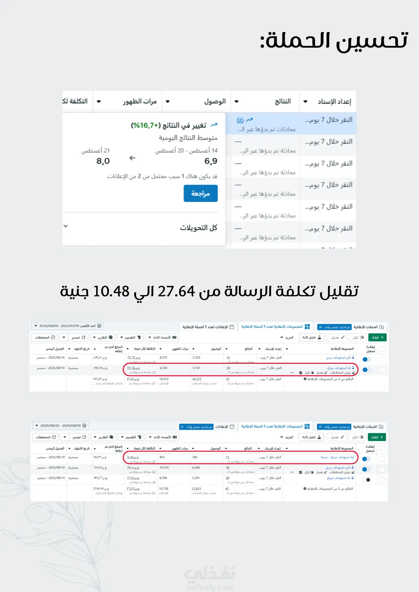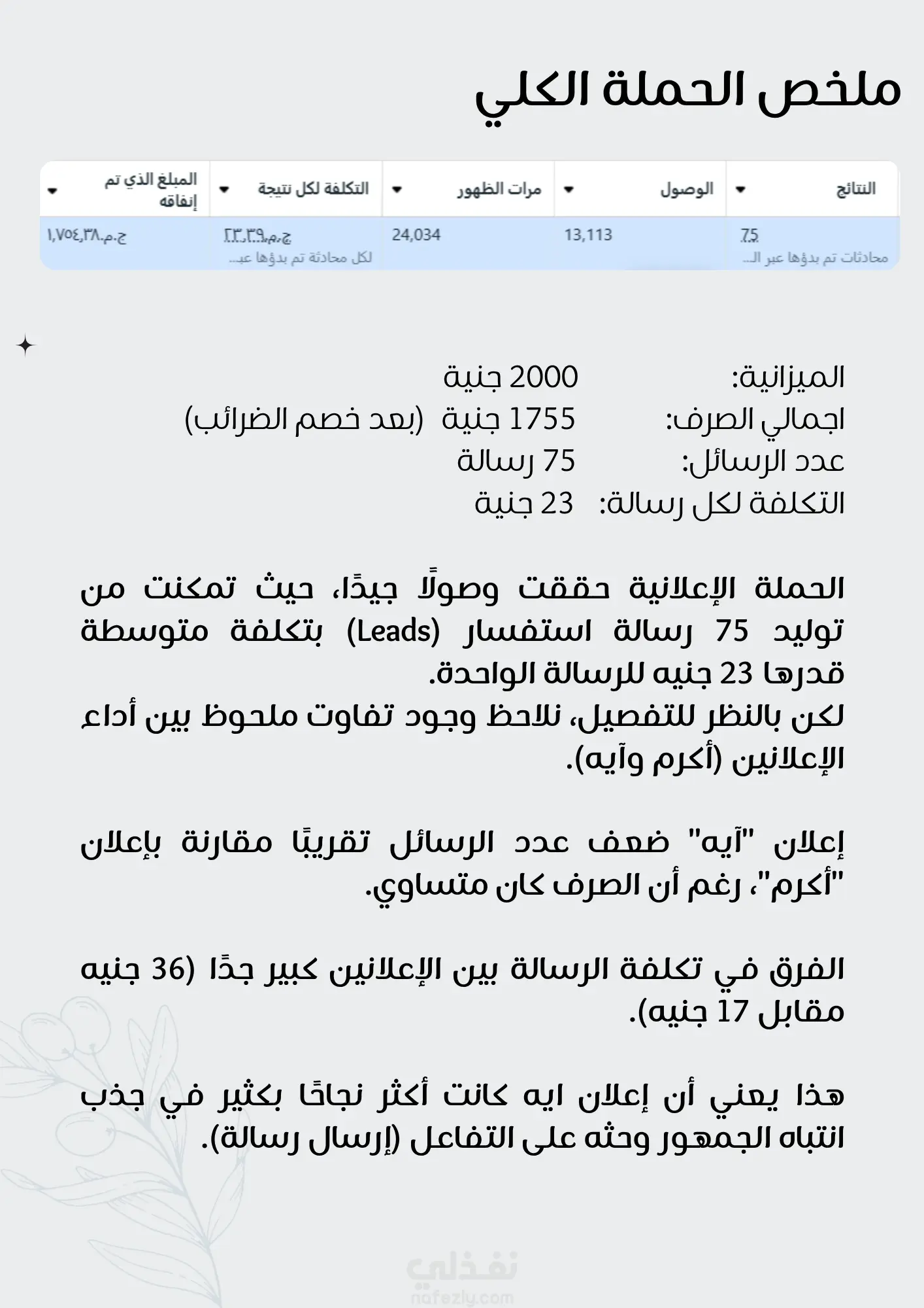 من خلال التحليل، تم قياس النتائج وتحديد الاعلان الاكثر فعالية حيث حقق ضعف عدد الرسائل مقارنة بالإعلان الآخر وبنصف التكلفة تقريبًا.